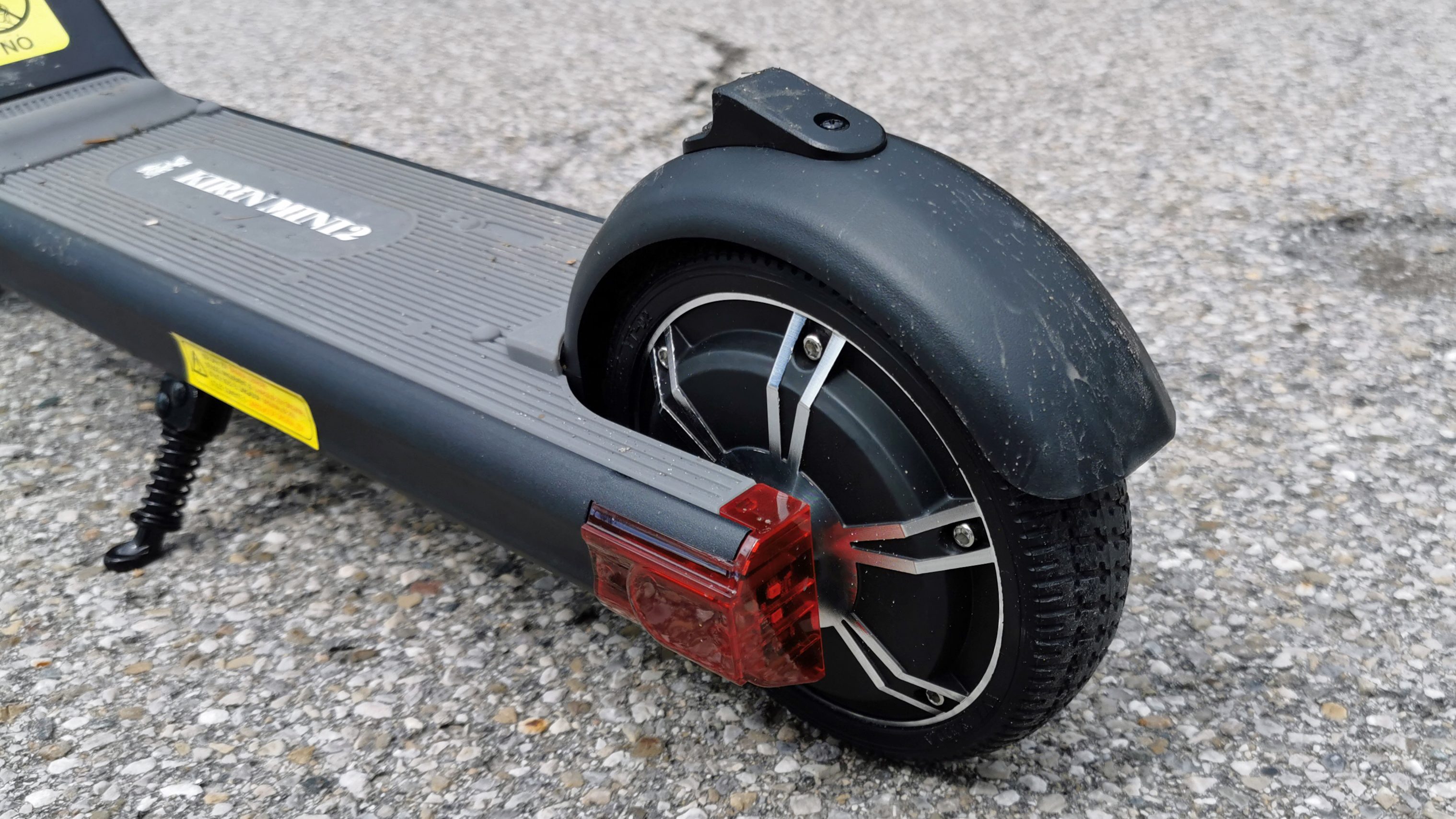 Statt auf Luft-Reifen setzt der Kirin Mini 2 auf verhältnismäßig weiche Vollgummireifen. In Sachen Fahrkomfort kann das zwar nicht mit luftgefüllten Reifen mithalten, für eine Runde auf dem Campingplatz ist das aber vernachlässigbar. Die an unserem Test-Scooter installierten Bremsleuchten sind zwar theoretisch sinnvoll, bei Sonnenschein ist die rote LED des Kirin Mini 2 aber kaum zu erkennen. Gleiches gilt für die Status-LED, welche den Geschwindigkeitsmodus anzeigt.