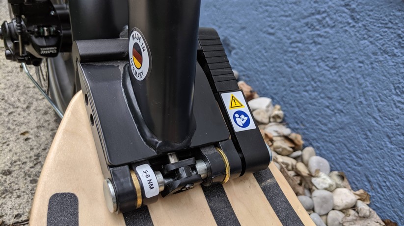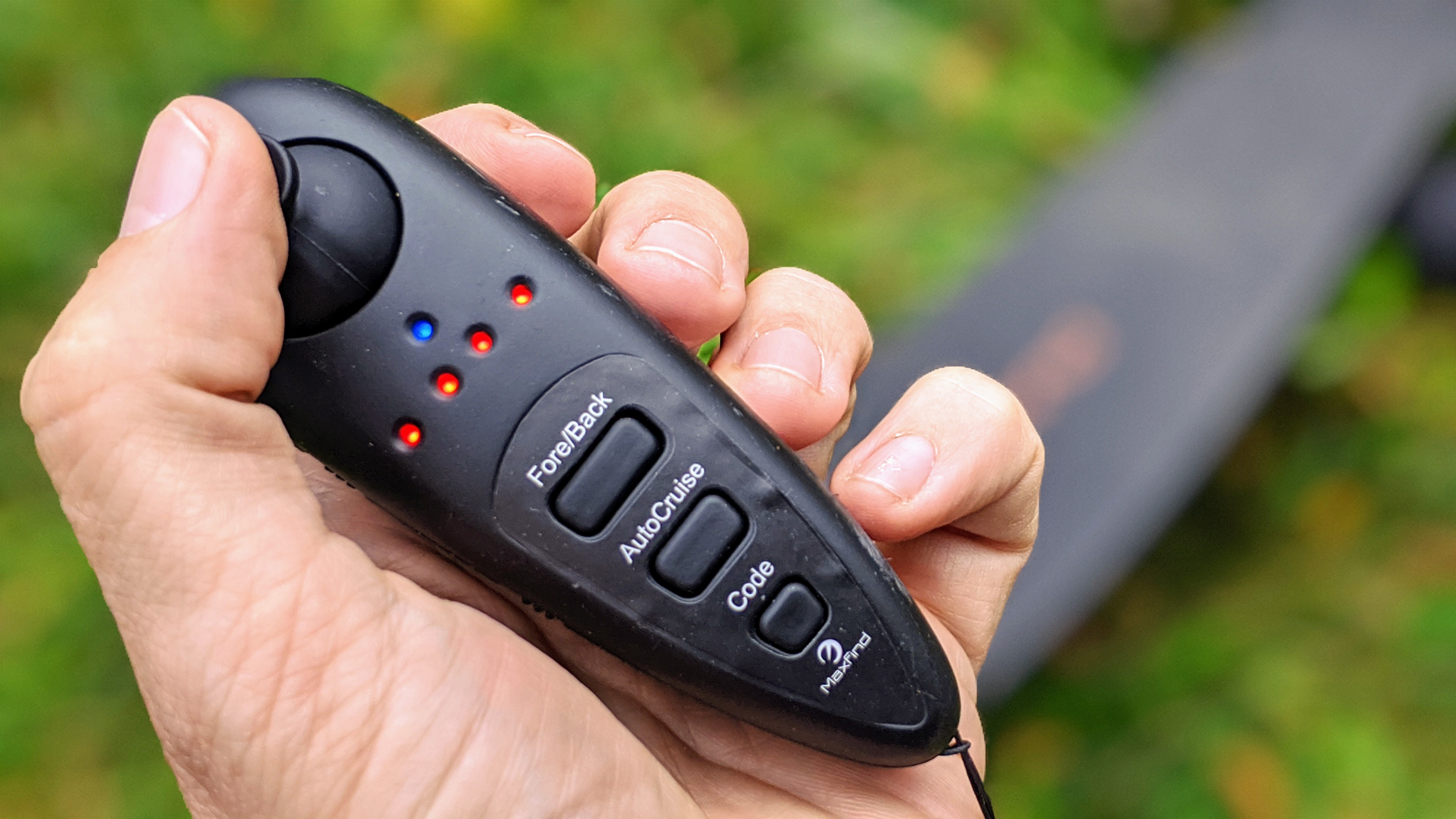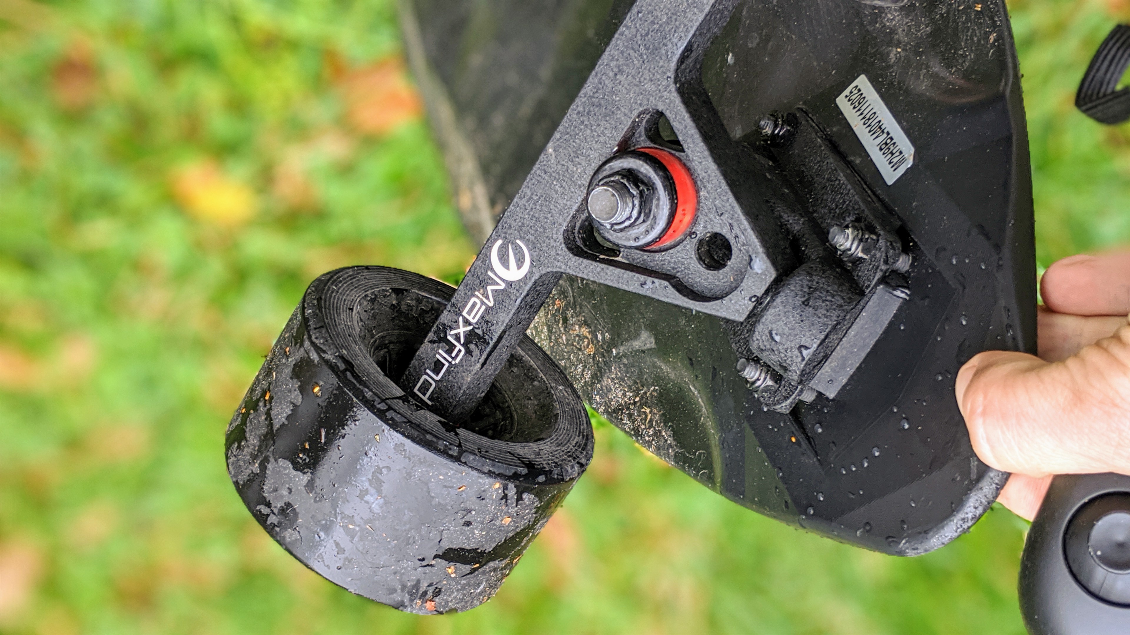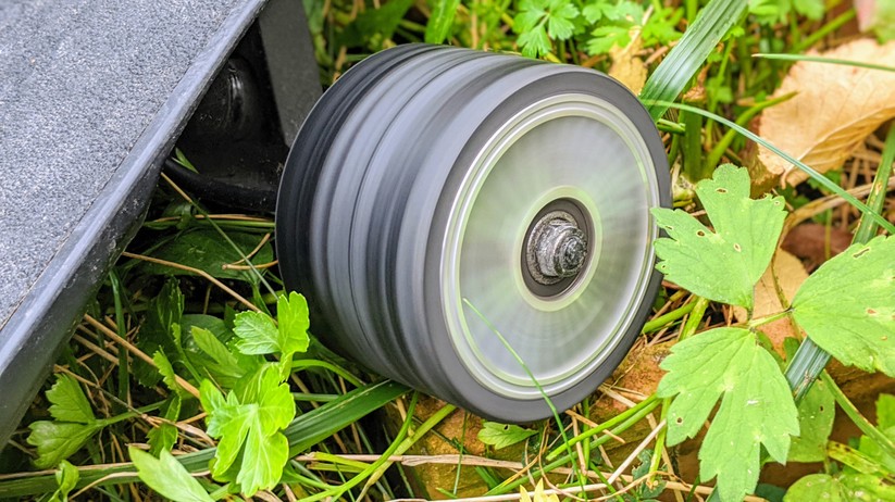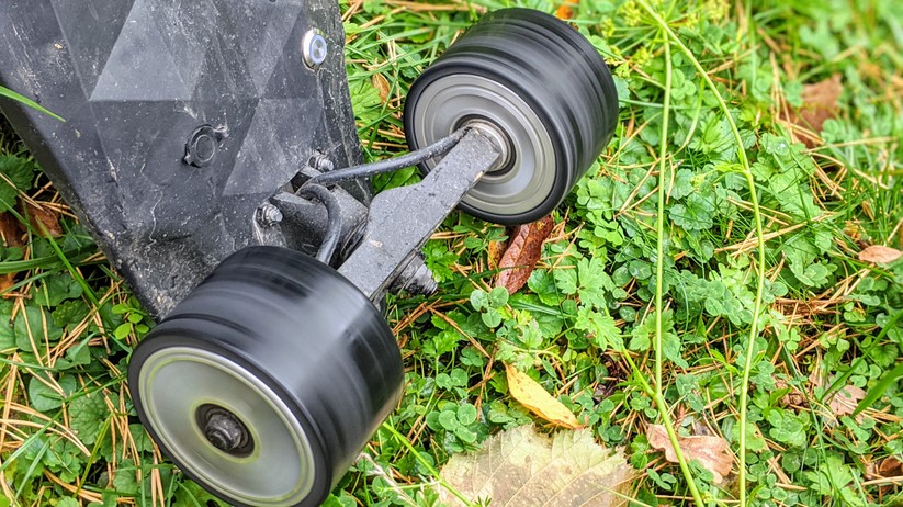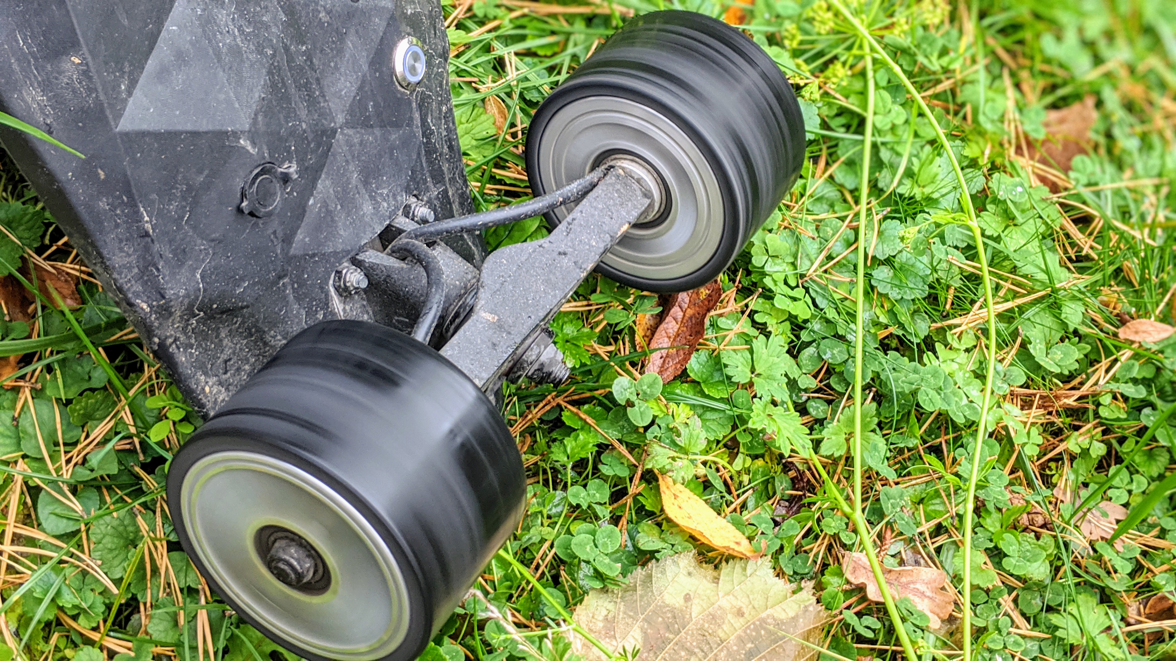 Zumindest das Maxfind Max 2 macht es jedoch Neulingen leicht. Denn zum einen verzeihen die Rollen dank großem Durchmesser von 9 cm und einer Breite von knapp 7 cm zumindest bei langsamer Geschwindigkeit kleine Bordsteine, Unebenheiten sowie Laub und kleine Äste. Zum anderen kennt die Fernbedienung zwei Geschwindigkeiten: Low und High. Im langsamen Modus regelt der Motor bei etwa 13 km/h ab. Diese Geschwindigkeit entpuppt sich als ideal, um sich mit dem Brett vertraut zu machen und im schlimmsten Fall einfach abzuspringen und auszulaufen. Nach 50 gefahrenen Kilometern wich die Unsicherheit, nach 150 km stellte sich gar ein Gefühl der Kontrolle ein.