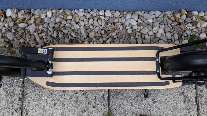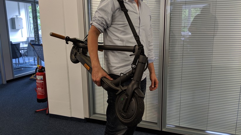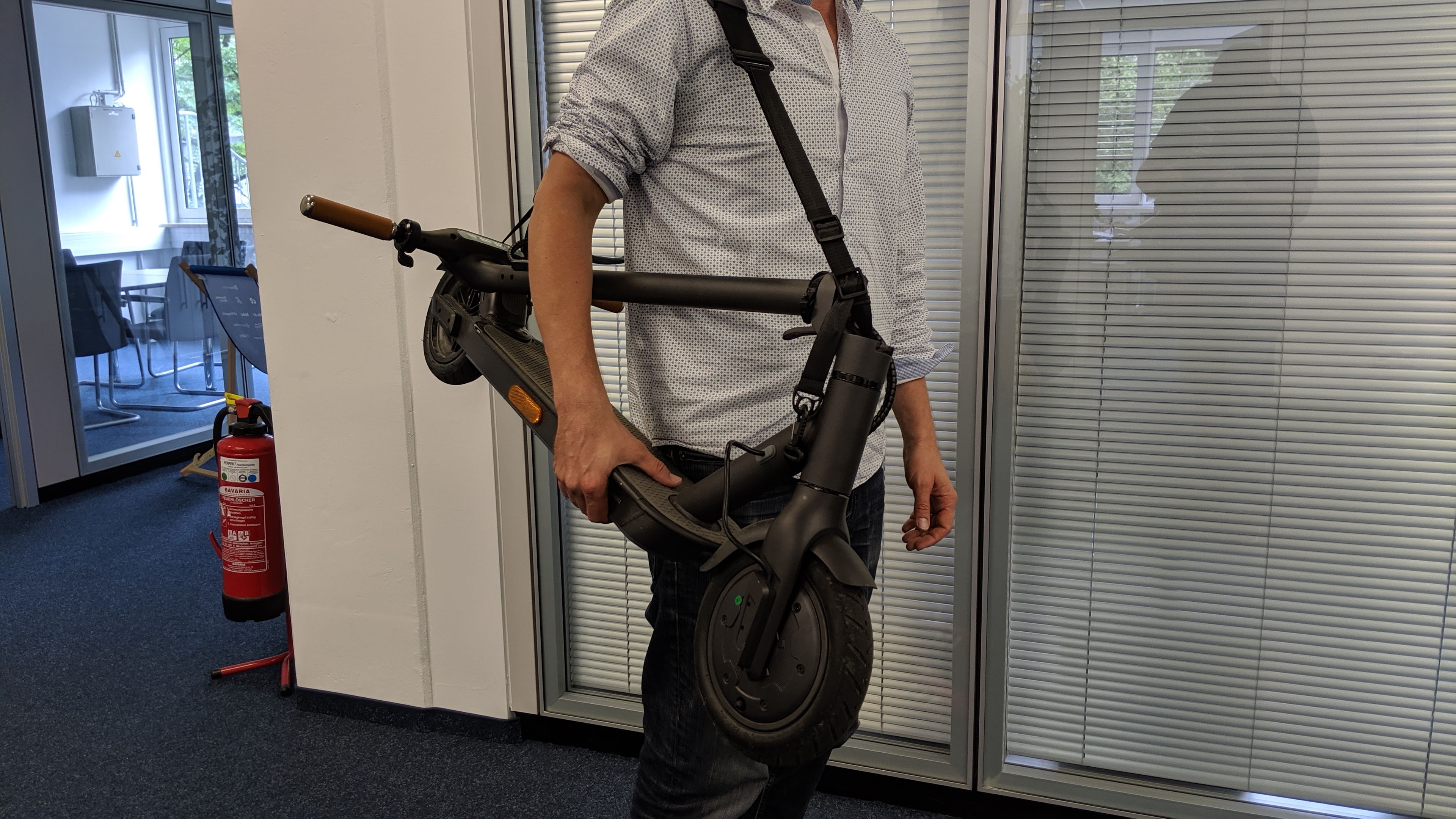 Ein E-Scooter wiegt mindestens 13, manchmal bis zu 20 kg. Meist klappt die Lenkstange zum Tragen in Richtung Hinterrad und rastet dort ein. Manchmal legt der Hersteller wie beim IO Hawk Sparrow Legal (Testbericht) einen Tragegurt bei. So oder so ist ein E-Scooter um ein Vielfaches schwerer und sperriger als E-Skateboard. Das nervt vor allem beim Transport des E-Scooters in Bahn, Bus oder Auto, aber auch wenn der E-Scooter zum Laden ohne Aufzug in den X-ten Stock muss. Auch mal schnell mit dem E-Scooter in den Supermarkt ist nicht möglich, er muss im besten Fall angesperrt vor dem Eingang warten. Das E-Skateboard wird einfach mitgenommen.