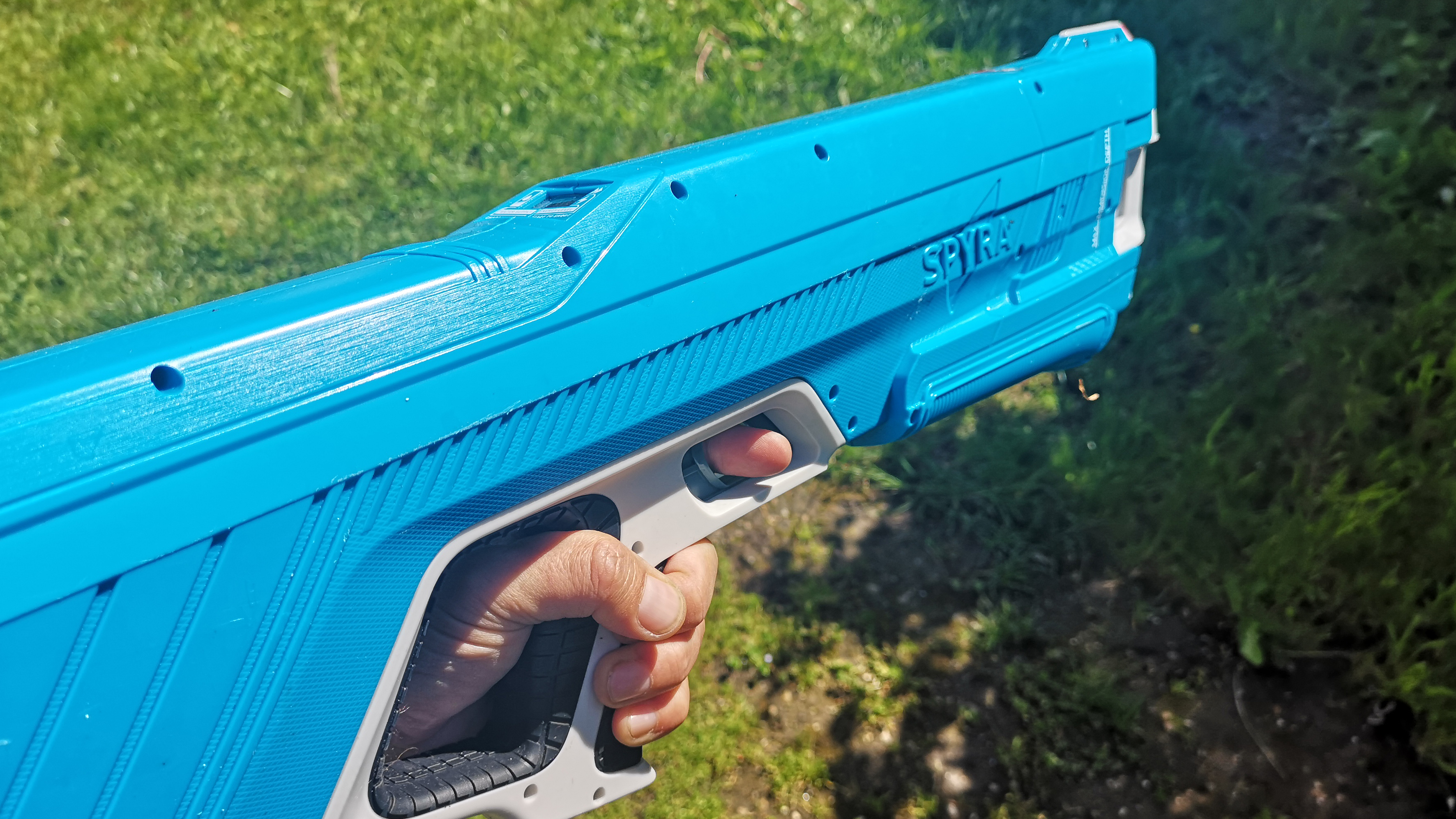 Bei der Spryra ist die Pumpe lediglich beim Auffüllen des Tanks zu hören. Die Wasserabgabe geschieht anders als bei den günstigen Modellen, in Einzelschüssen. Wird der Auslöser gedrückt, erklingt ein mechanisches Schlaggeräusch und satte 50 Milliliter verlassen zeitgleich den Lauf. Der Druck ist dabei so hoch, dass es zu einem deutlich spürbaren Rückstoß kommt. Die Reichweite der Spyra Two beträgt acht bis zehn Meter im normalen Schussmodi. Der Powerschuss, welcher durch gedrückt halten des Abzugs nach Schussabgabe aufgeladen wird, kommt etwa sieben bis acht Meter weit. Dafür ist hier die Wassermenge knapp dreimal so hoch. Im Normalmodus reicht eine Tankfüllung für 17 Schüsse. Diese können mit etwa eineinhalb bis zwei Sekunden Verzögerung abgegeben werden – wann die Spyra bereit ist, zeigt das Display. 17 Auslösungen sind zwar nicht besonders viel, aber man gewöhnt sich genaues Zielen schnell an, sodass die Nutzungsdauer ausreichend hoch ist. Bei häufiger Nutzung mussten wir die Spyra nach der ersten Woche zum ersten Mal nachladen.