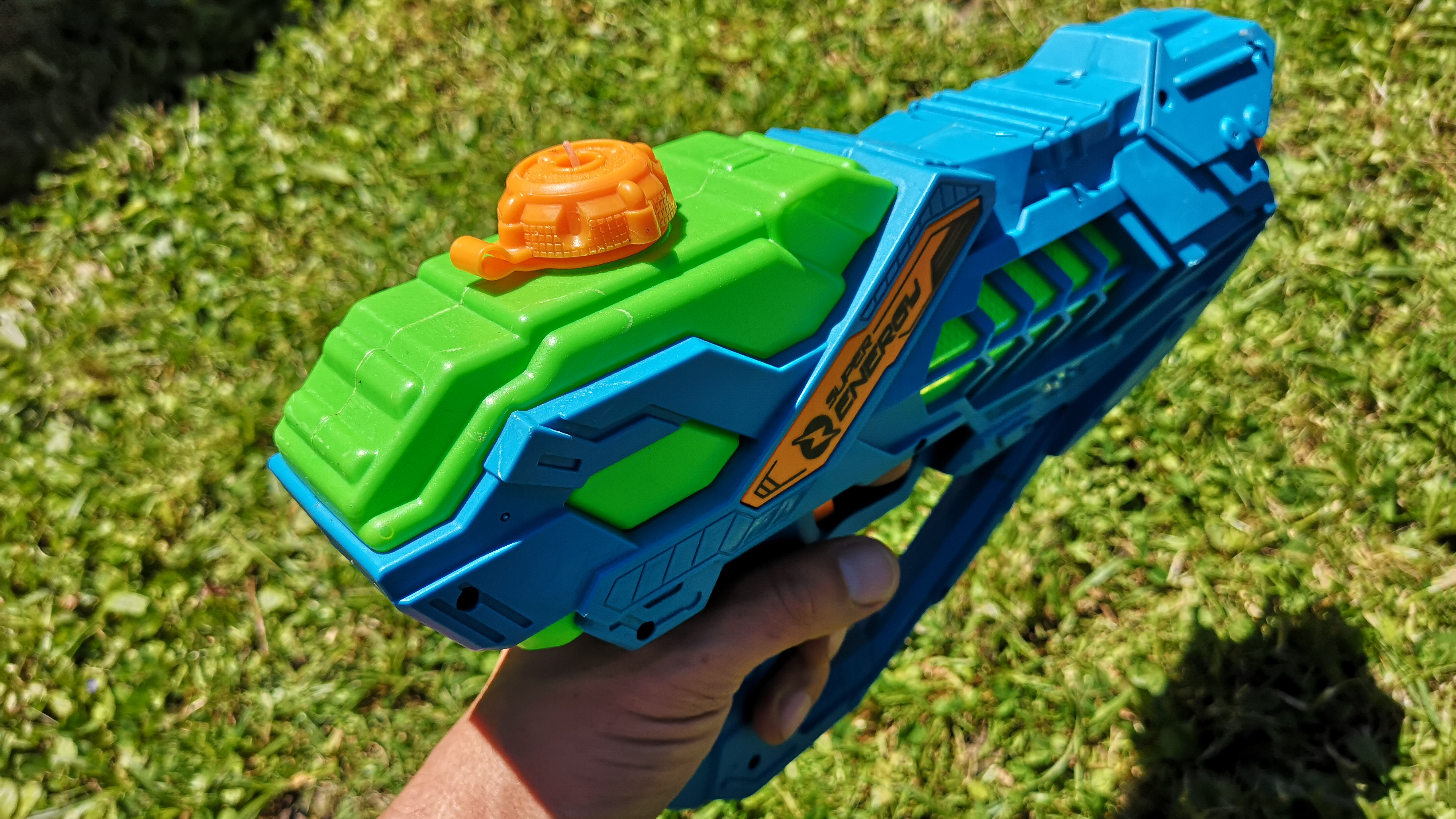 Als mittelpreisige Variante hatten wir einen elektronisch angetriebenen Supersoaker angefragt. Dieser ist bisher allerdings nicht in der Redaktion angekommen. Funktionsweise und Leistung sind nach unseren Recherchen aber etwa mit der von den oben genannten Wasserpistolen vergleichbar. Der Hauptvorteil ist das von Nerf bekannte Design kombiniert mit der Möglichkeit, Anbauteile an die Wasserpistolen anzubauen.