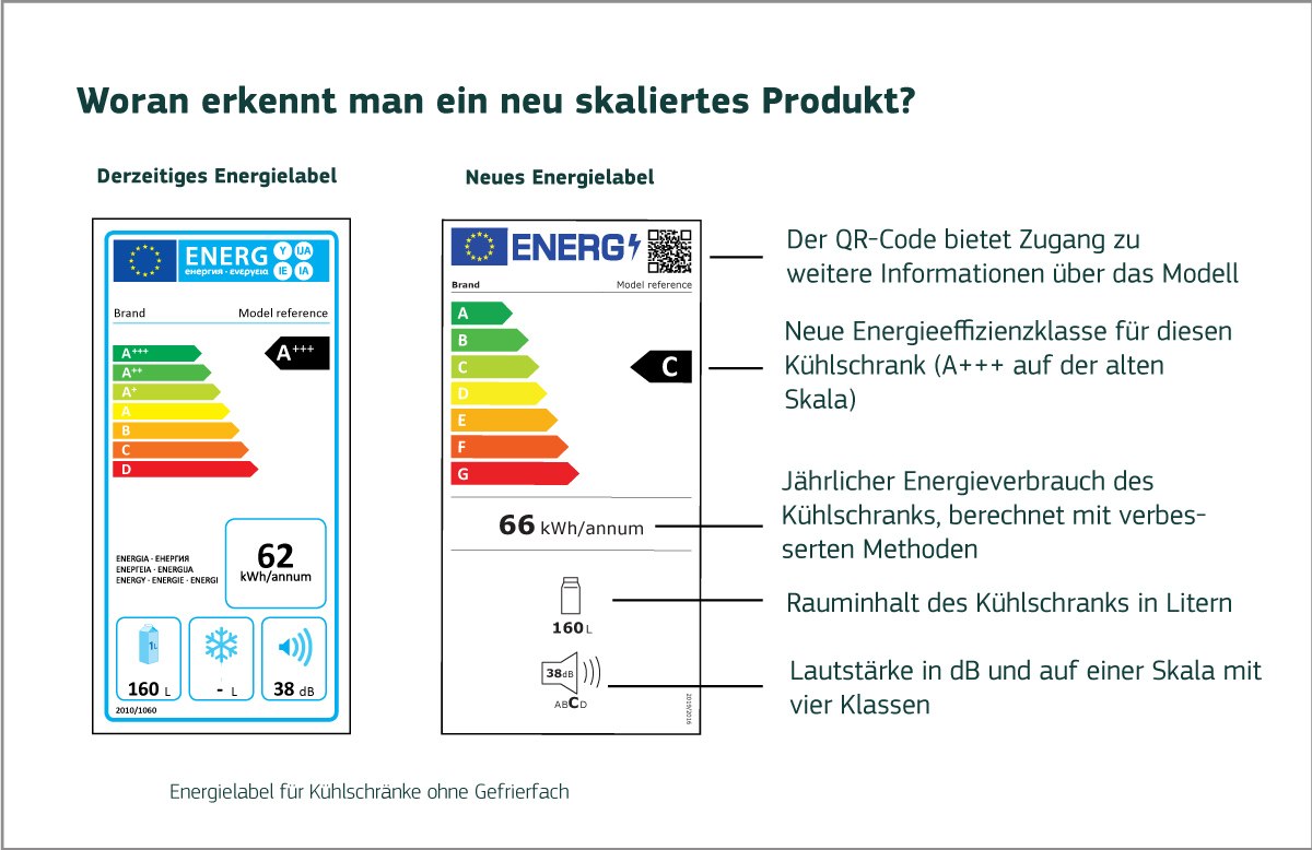 Das neue Label beinhaltet neben der Skala zur Energieeffizienzklasse auch die Angaben zum Jahresenergieverbrauch in Kilowattstunden (kWh). Auch die Lautstärke in Dezibel (dB(A)) und die Schallemissionsklasse (A bis D) wird bei vielen Produktgruppen genannt. Ein QR-Code, über den man Zugriff auf den öffentlichen Teil EU-Produktdatenbank bekommt, um dort weitere Informationen abzurufen, ist ebenfalls vorhanden.
