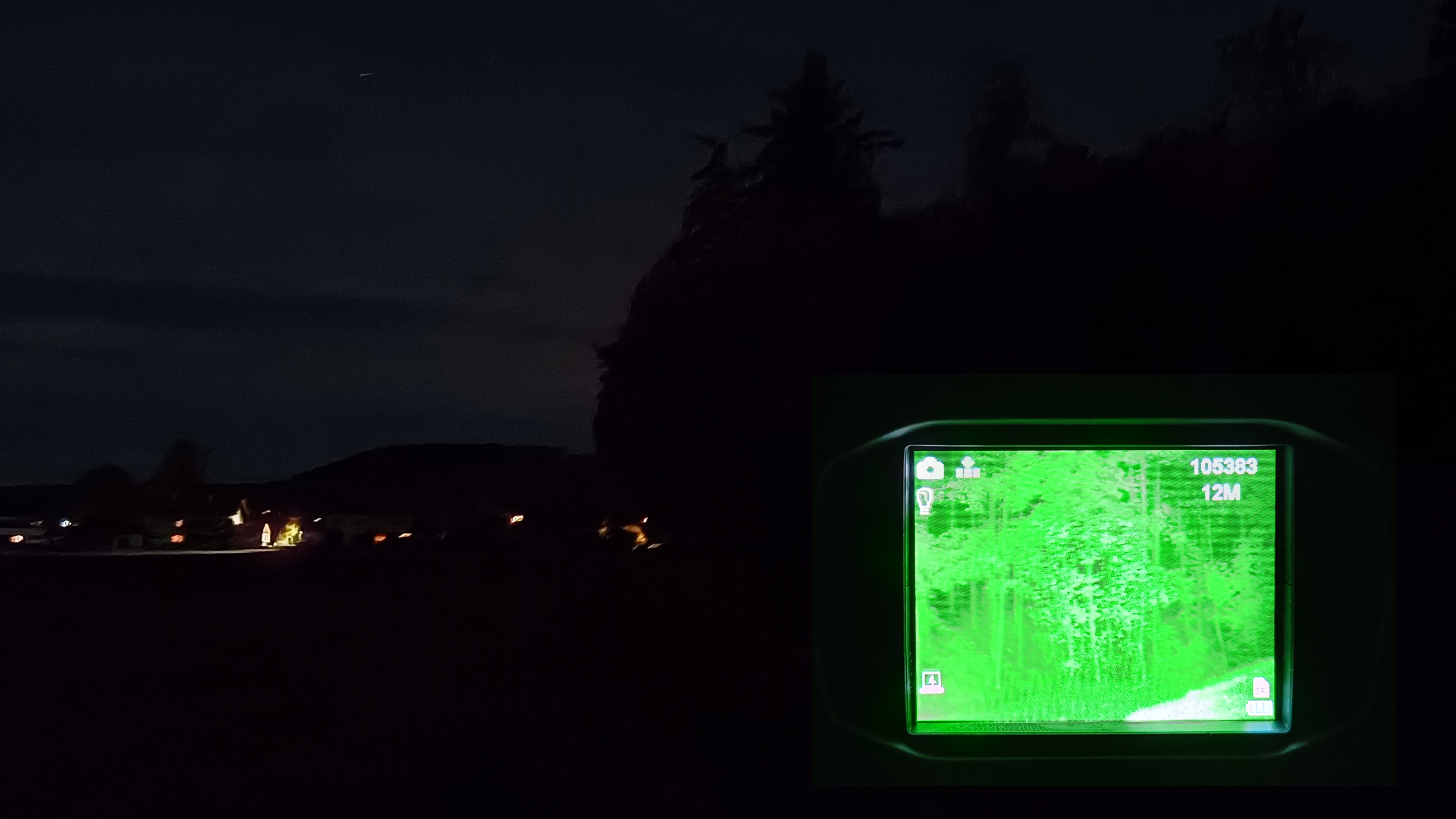 Da die Kellerräume nur begrenzt Platz bieten, können wir hier aber keine vernünftigen Reichenweitentests machen und so heißt es warten. Bei unserem nächtlichen Test im Freien schneidet das Gerät dann ebenfalls überraschend gut ab, auch wenn wir die Reichweite von 300 m nicht ganz bestätigen können. Der Waldrand in 200 bis 250 Metern Entfernung ist zwar noch ausgeleuchtet und schemenhaft zu erkennen, feine Details gehen wegen des fehlenden Kontrasts aber unter. Bei näheren Objekten bis etwa 150 Meter ist die Bildqualität deutlich besser. Im Zweifel sollte man hier die Farbfilter ausprobieren, diese können Kontrast und Darstellung verbessern.