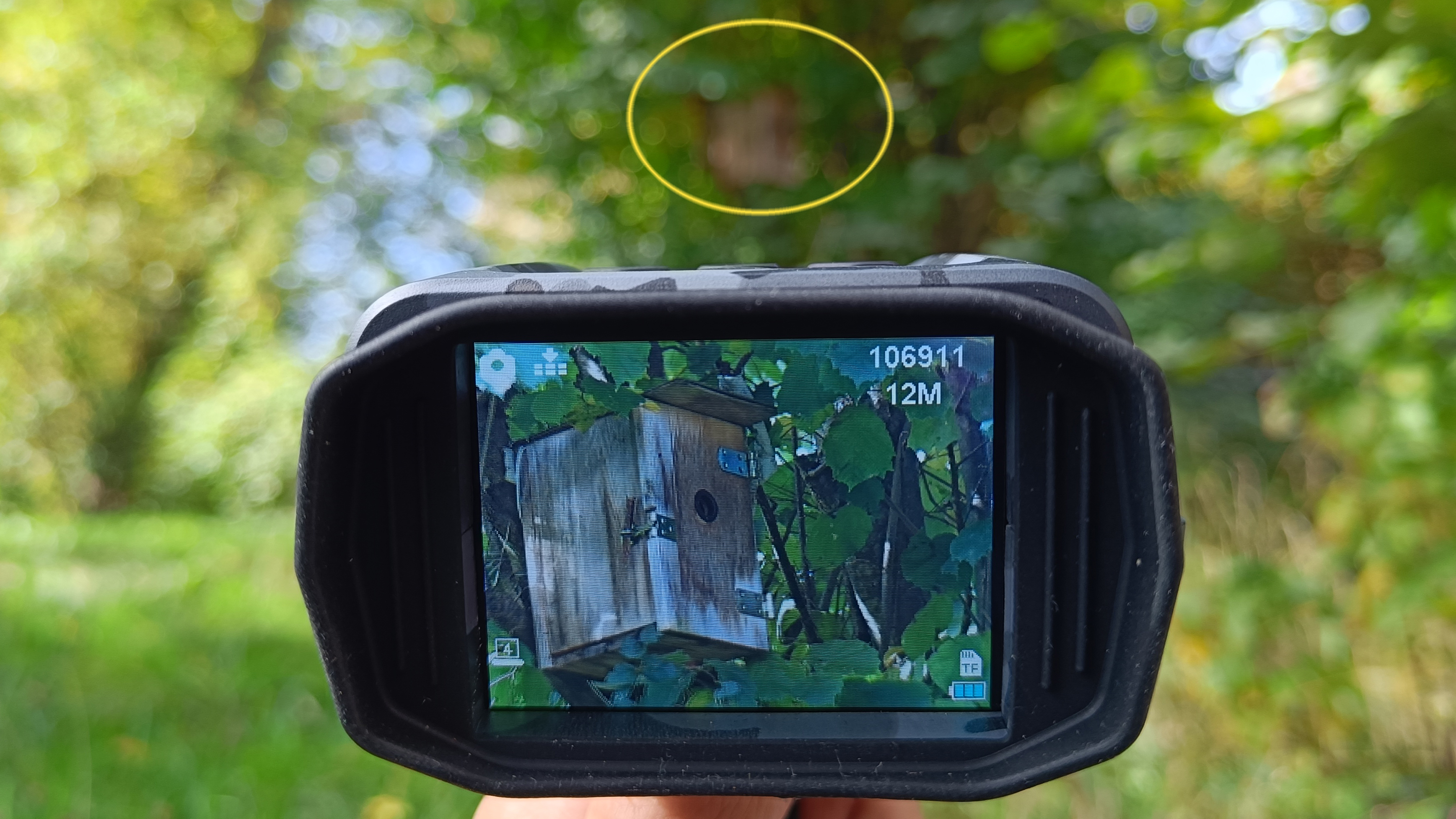 Die Bedienung des Nachtsichtgerätes von Amazon gestaltet sich auch ohne Vorkenntnisse einfach und unkompliziert. Nach dem Einschalten zeigt der 2,4-Zoll-Monitor, was sich vor der Linse abspielt. Das funktioniert auch tagsüber und so ist die IR-Beleuchtung zunächst deaktiviert. Per Tastendruck schaltet das Gerät auf IR-Sicht um und der IR-Strahler beginnt unsichtbar zu arbeiten. Wie stark die Umgebung ausgestrahlt wird, ist in sieben Stufen einstellbar. In der Praxis sind bis zu einer Entfernung unter 100 m die Leuchtstufen eins bis vier ausreichend. Bei höheren Distanzen darf es dann auch mehr sein. Per Mode-Taster wird zwischen Video.-, Fotofunktion umgeschaltet. Ein dritter Tastendruck auf Mode führt zu Aufnahmen auf der Speicherkarte.