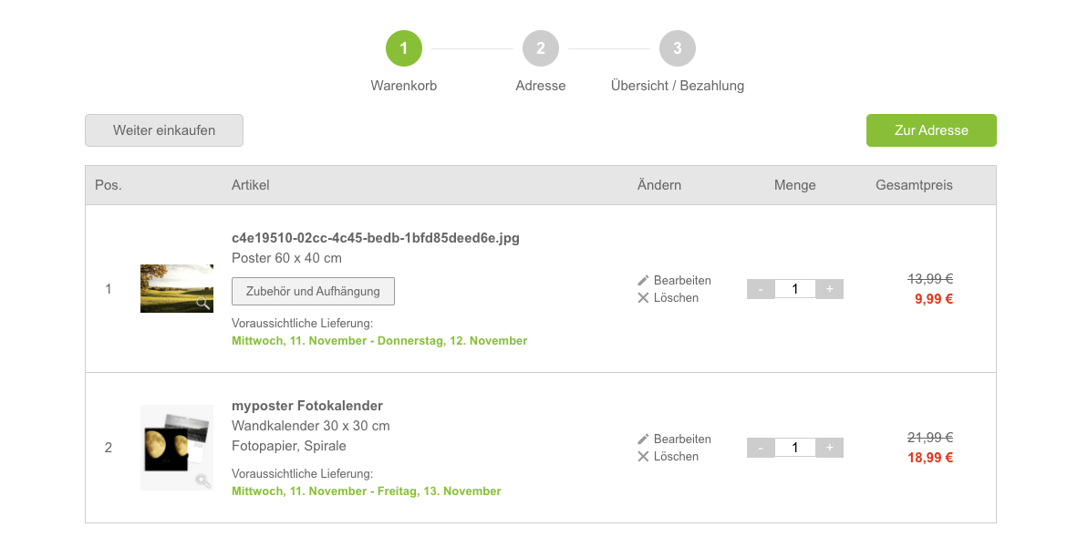 Wer mit Versand bestellt, muss zusätzlich zur Lieferzeit zwei bis drei Tage Produktionszeit einberechnen. Denn erst nach dem Druck geht der Kalender zur Post oder in die nächste Drogeriemarktfiliale. So liegt die Zeit von Bestellbestätigung bis Lieferung bei durchschnittlich fünf Werktagen. Besonders lange braucht in unserem Vergleich der Dienst Fotopremio. Hier hat unsere Bestellung elf Tage gebraucht, bis sie im Briefkasten war. Wer also kurzfristig vor Weihnachten bestellt, sollte gut eine Woche einkalkulieren.