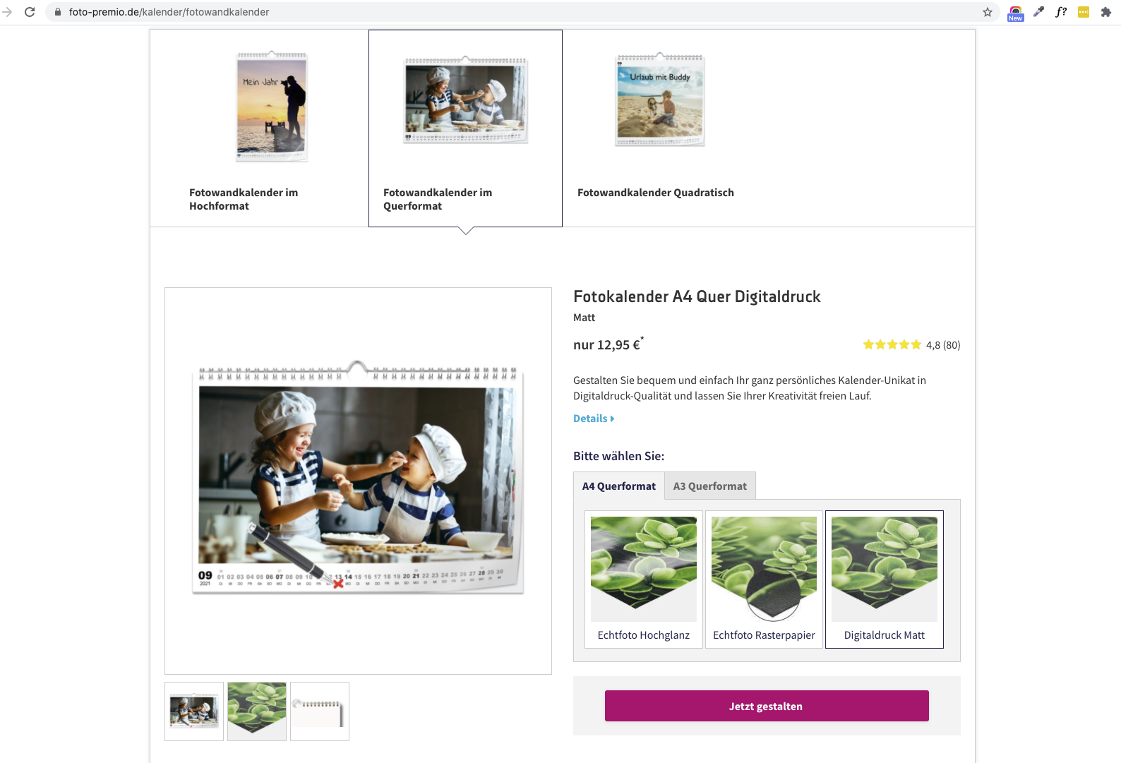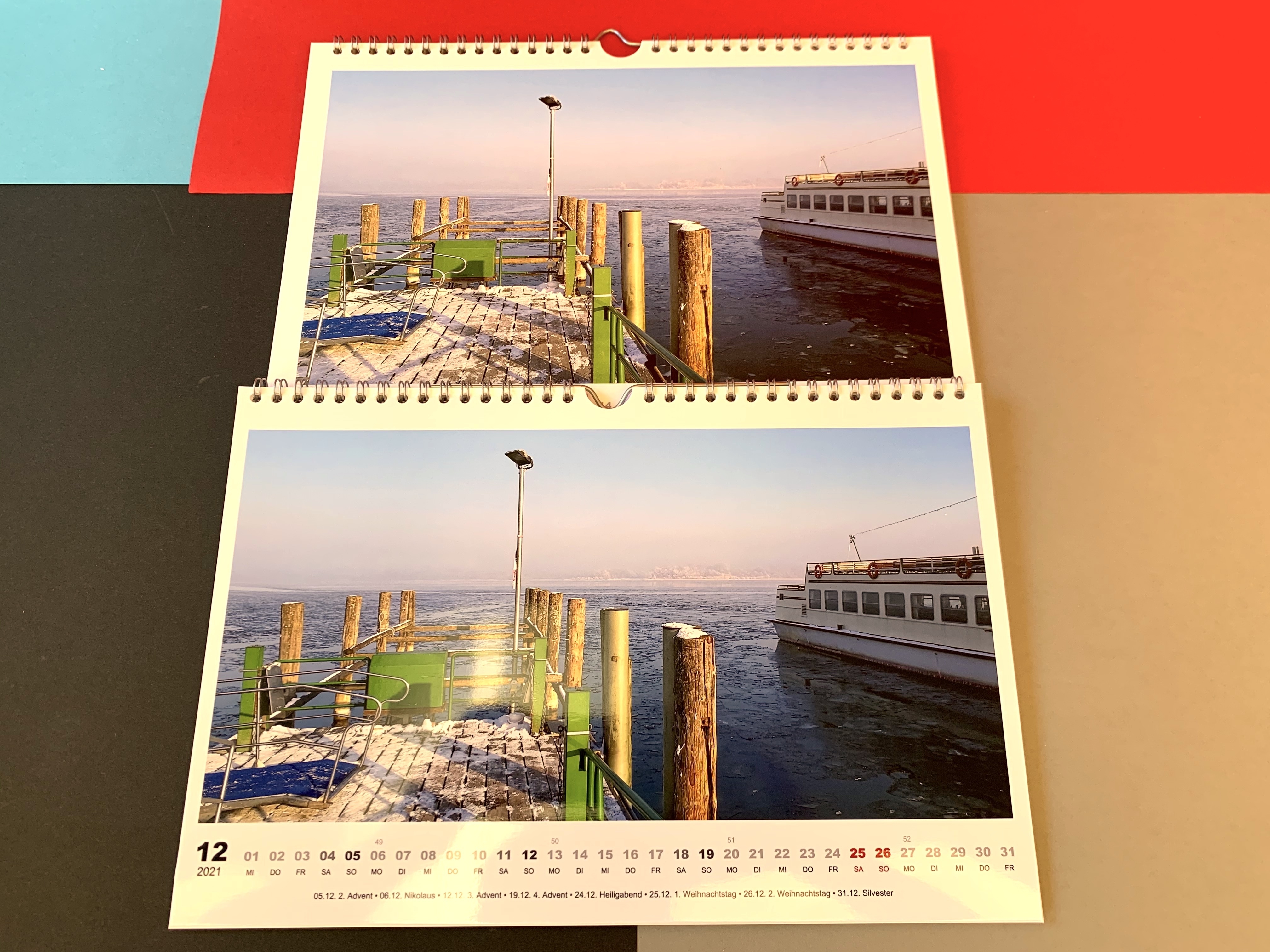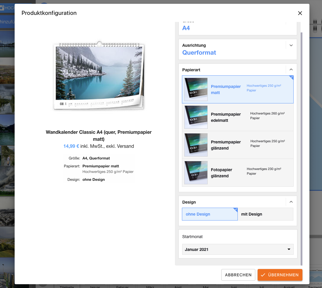 Dann geht die Auswahl aber direkt weiter: Viele Anbieter stellen Nutzer vor die Wahl, ob sie ihre Kalender in Hochglanz oder matt wollen. Bei der Papierqualität stehen Premium- oder Echtfotopapier und vereinzelt sogar Feinstpapier oder recyceltes Papier zur Auswahl. Das unterscheidet sich nicht nur bei der finalen Bildqualität, sondern auch bei der Papierdicke. Feinstpapier liegt beispielsweise bei 300 – 350 g/qm, Fotopapier bei 180 bis 250 g. Für einen Fotokalender reicht in aller Regel letzteres, das Papier ist schließlich nicht ständig in den Händen, sondern hängt ruhig an der Wand.