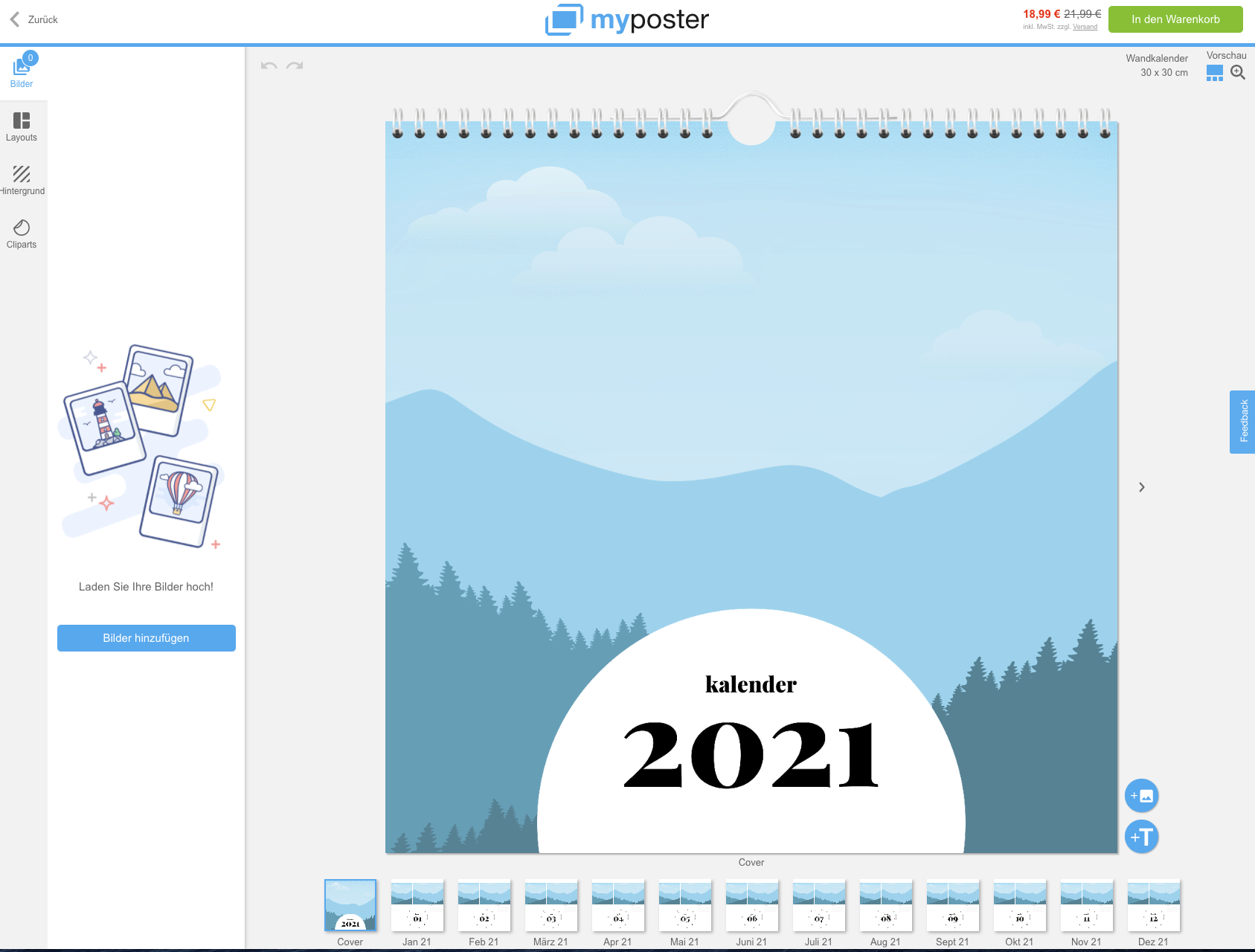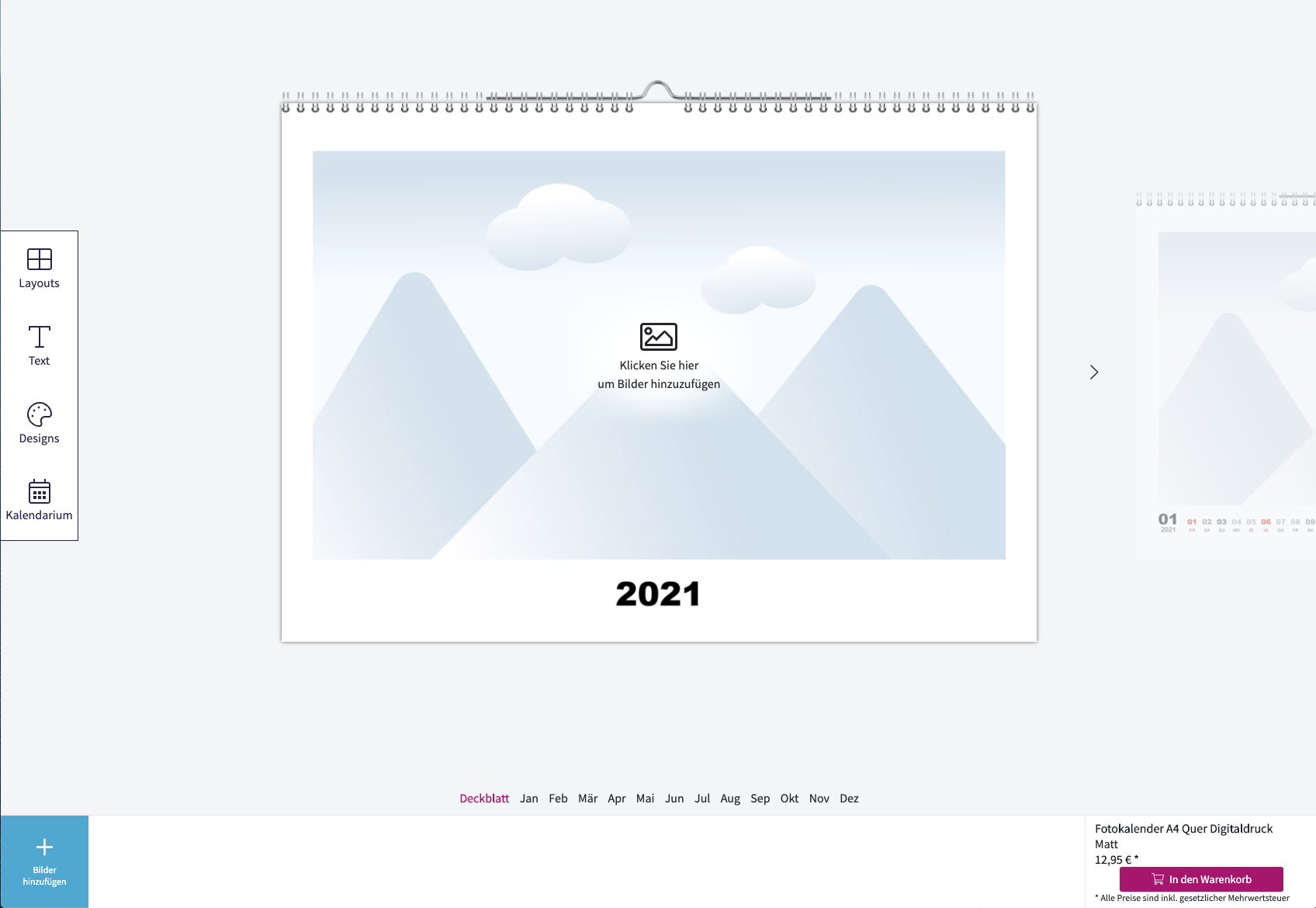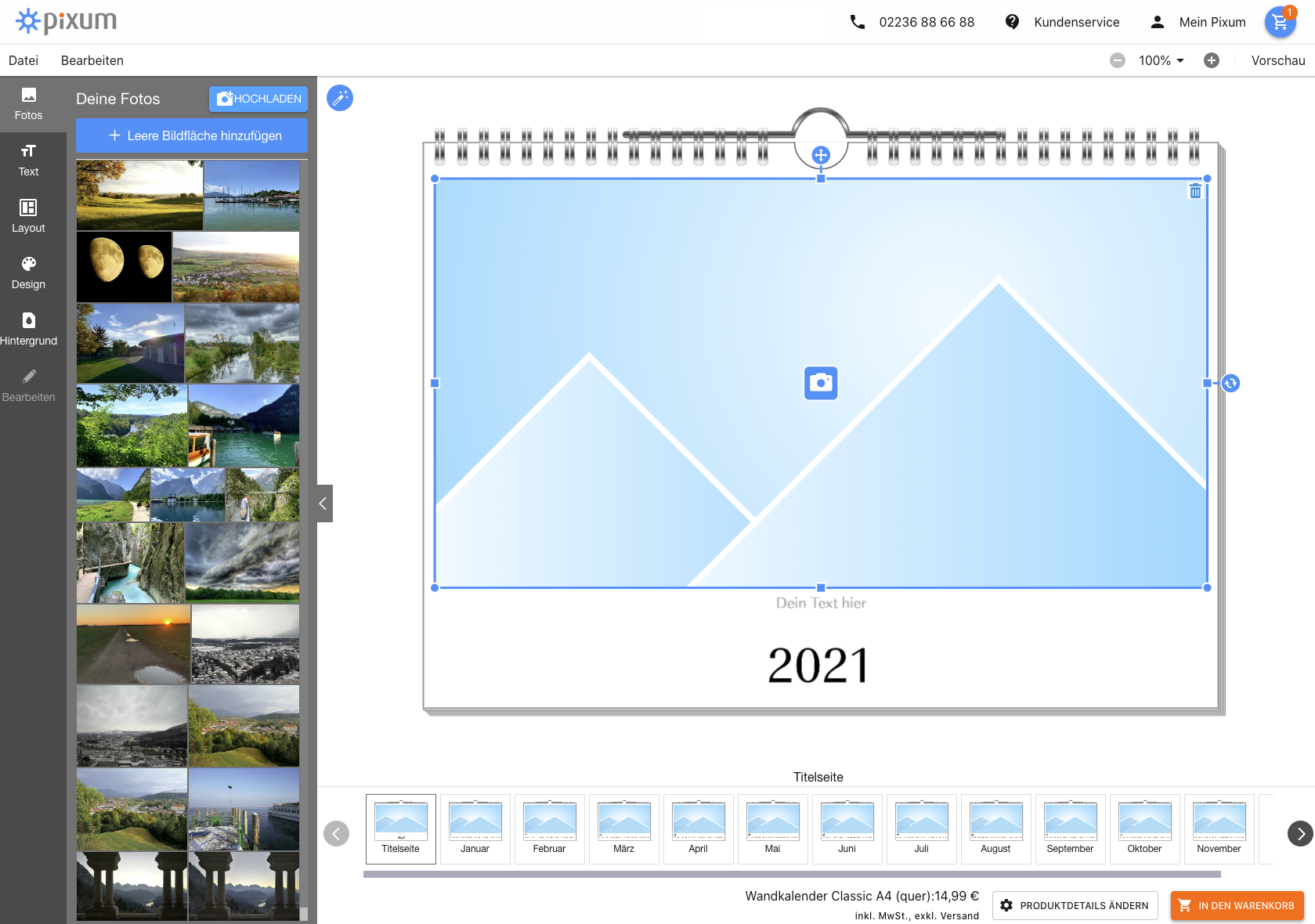 Viele Onlineshops wie Pixum geben das Bildformat für Fotos vor. Der Vorteil: Jede Seite des Kalenders wirkt einheitlich, alles ist am gleichen Platz. Bei MyPoster haben Nutzer hingegen die Möglichkeit das Bild auf die komplette Größe des Kalenders zu ziehen. Der Nachteil: Bei manchen Designs verschwinden Elemente wie Datum oder Notizen im Hintergrund des Bildes Bild – das ist nicht gerade hilfreich. Hier sollte man dann lieber eine andere Designvorlage wählen. Alle Shops geben einen Hinweis vor dem Checkout, wenn Kalenderseiten ohne Fotos entdeckt wurden.