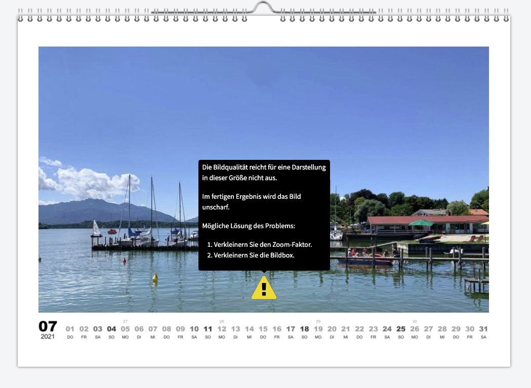 Einige wenige Anbieter, darunter Pixum, geben keinen Warnhinweis in der automatischen Prüfung – trotz Warnhinweis. Hier kommt im Zweifelsfall ein Kalender mit unscharfen Fotos an. Wer dennoch bei solchen Anbietern bestellt, sollte 2480 × 3508 Pixel große Fotos wählen. Die passen dann auch A4-füllend in den Kalender.