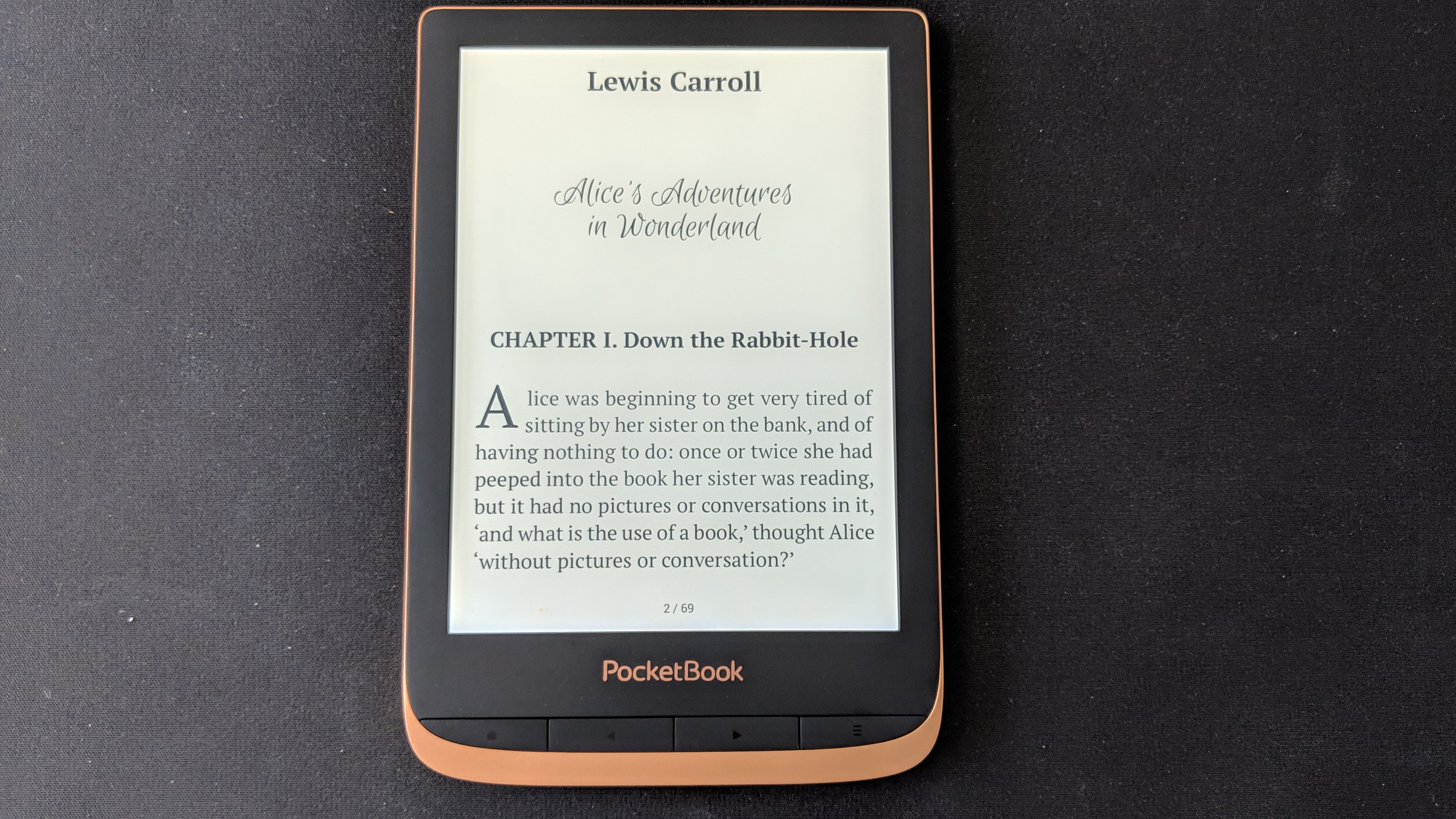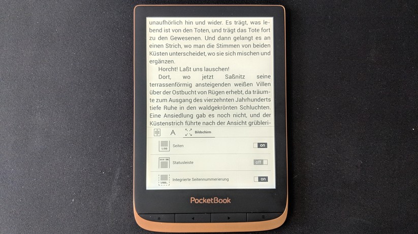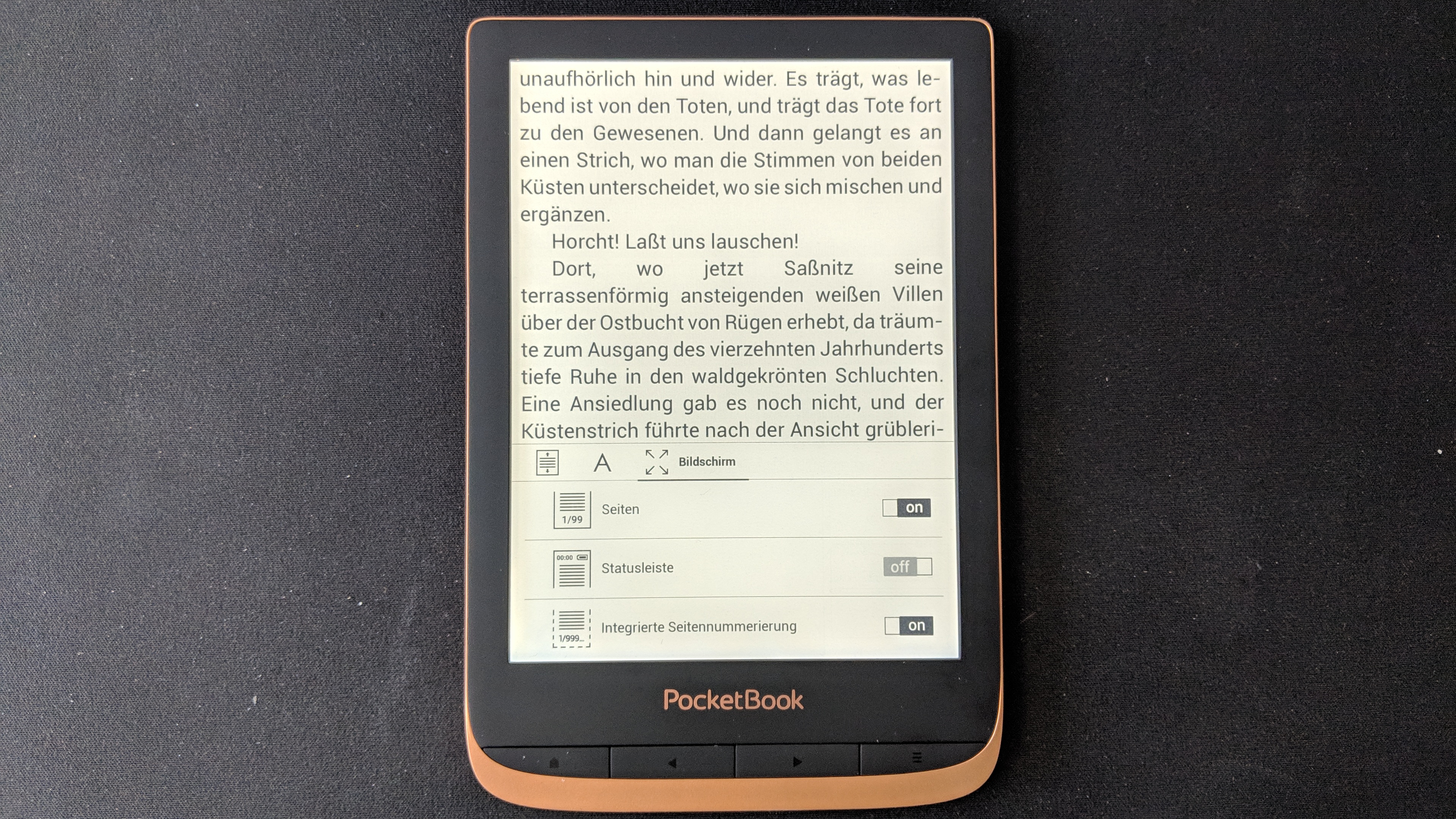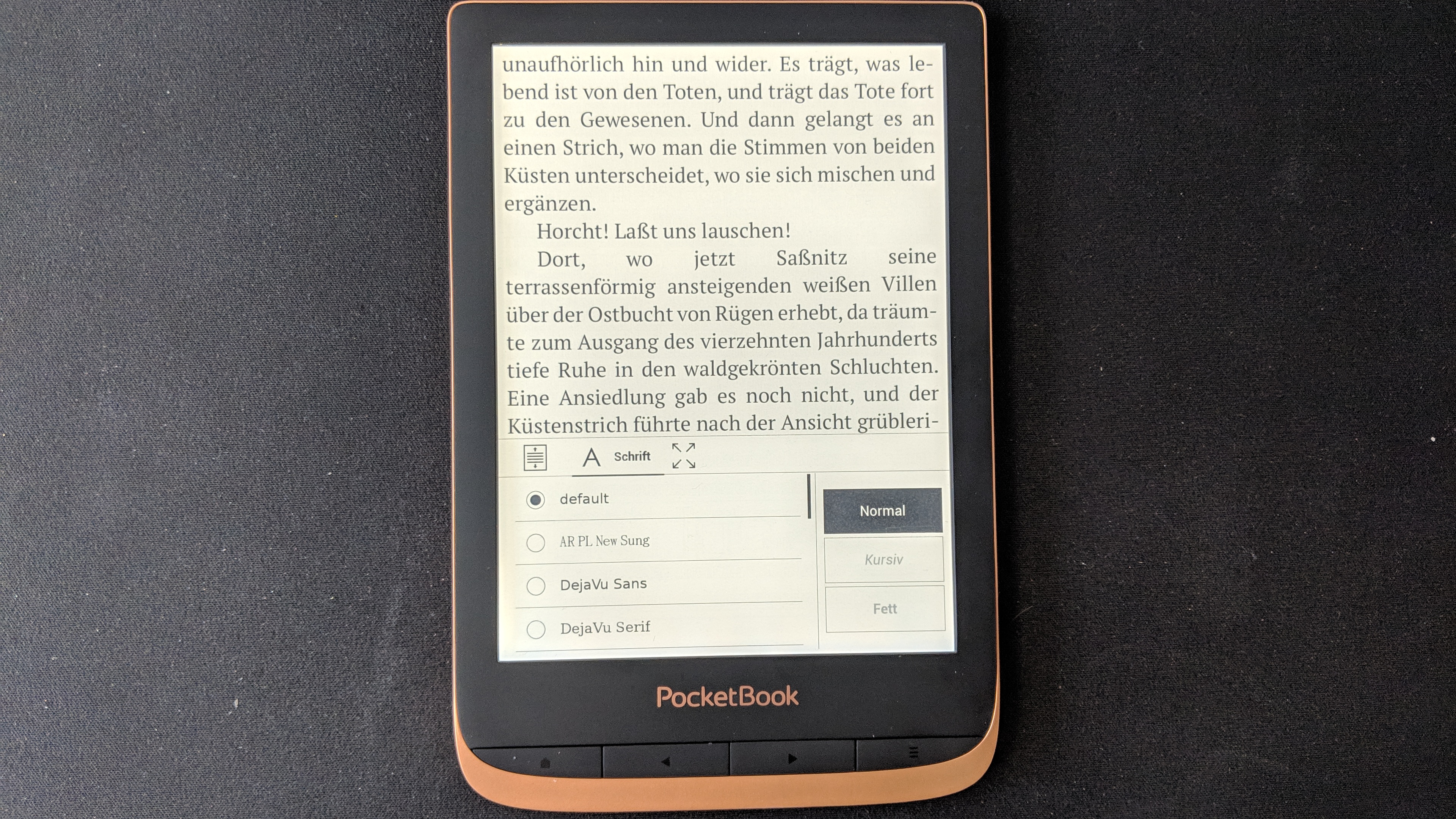 Bei der Wahl des Geräts mit 6 bis 7 Zoll großem Bildschirm empfehlen wir auf eine Auflösung von mindestens 1448 × 1072 Pixeln zu setzen, wie sie die meisten aktuellen Mittelklasse-E-Reader bieten. Einige moderne E-Reader wie der Pocketbook Era bieten sogar eine Auflösung von 1404 Pixel x 1872 Pixeln. Beim älteren Amazon Kindle 2019 (Testbericht) franst die Schrift aufgrund der geringen Auflösung von 800 × 600 Pixeln aus. Wir empfinden das als störend. Viele, die einmal gesehen haben, wie scharf die Schrift auf guten E-Readern ist, möchten nie wieder zurück.
