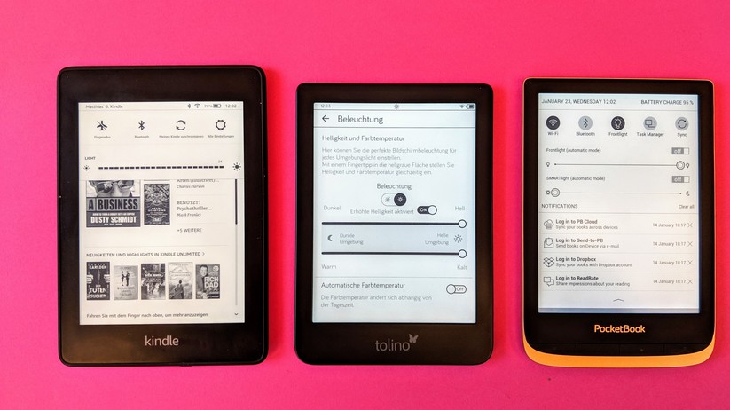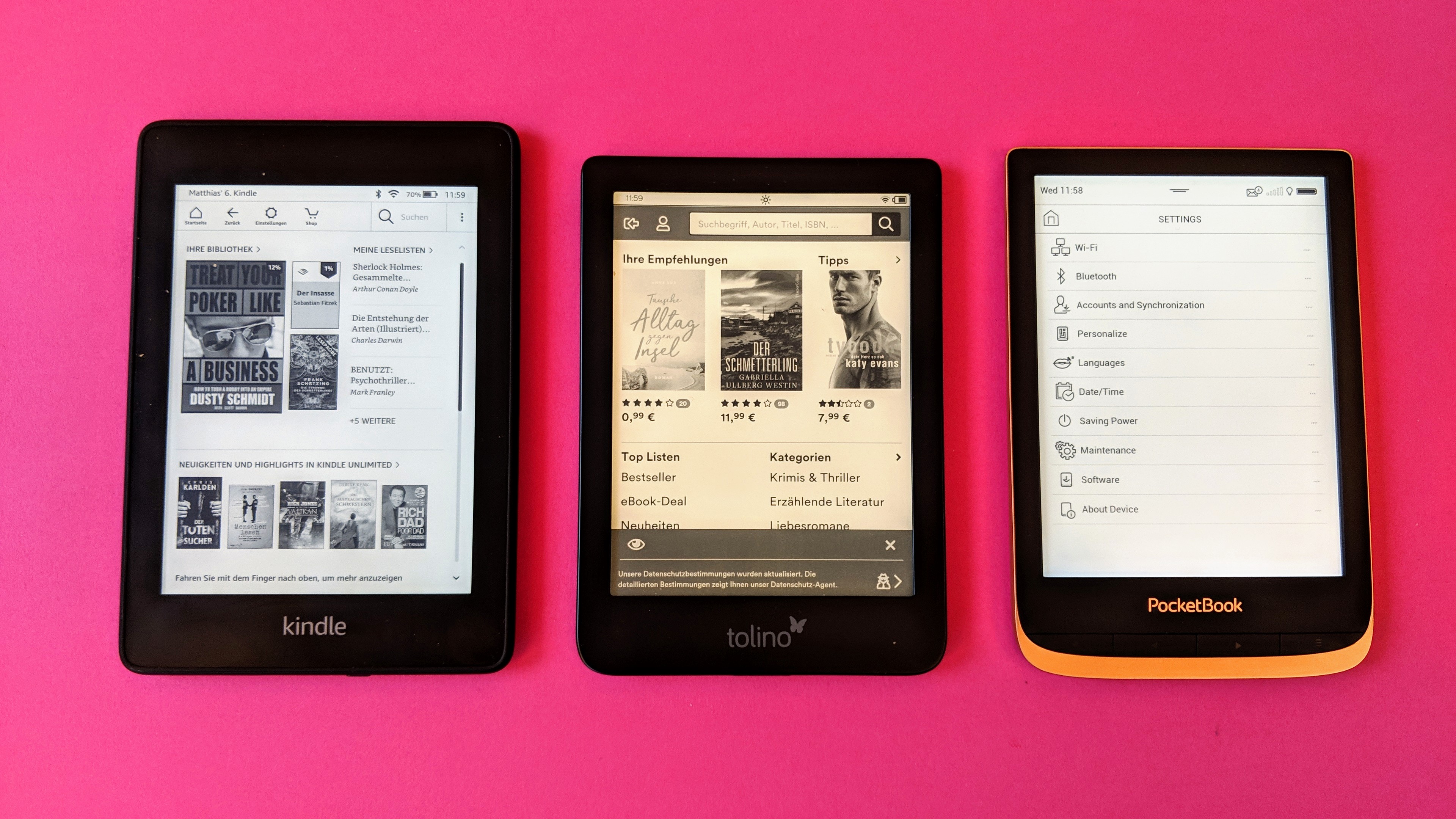 Bei den E-Book-Readern von Tolino und Pocketbook sind in der Regel Shops vorinstalliert, diese lassen sich jedoch ohne großen Aufwand wechseln. Synchronisierte Smartphone- und Tablet-Apps haben sie alle drei.