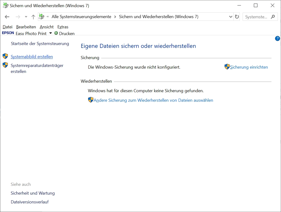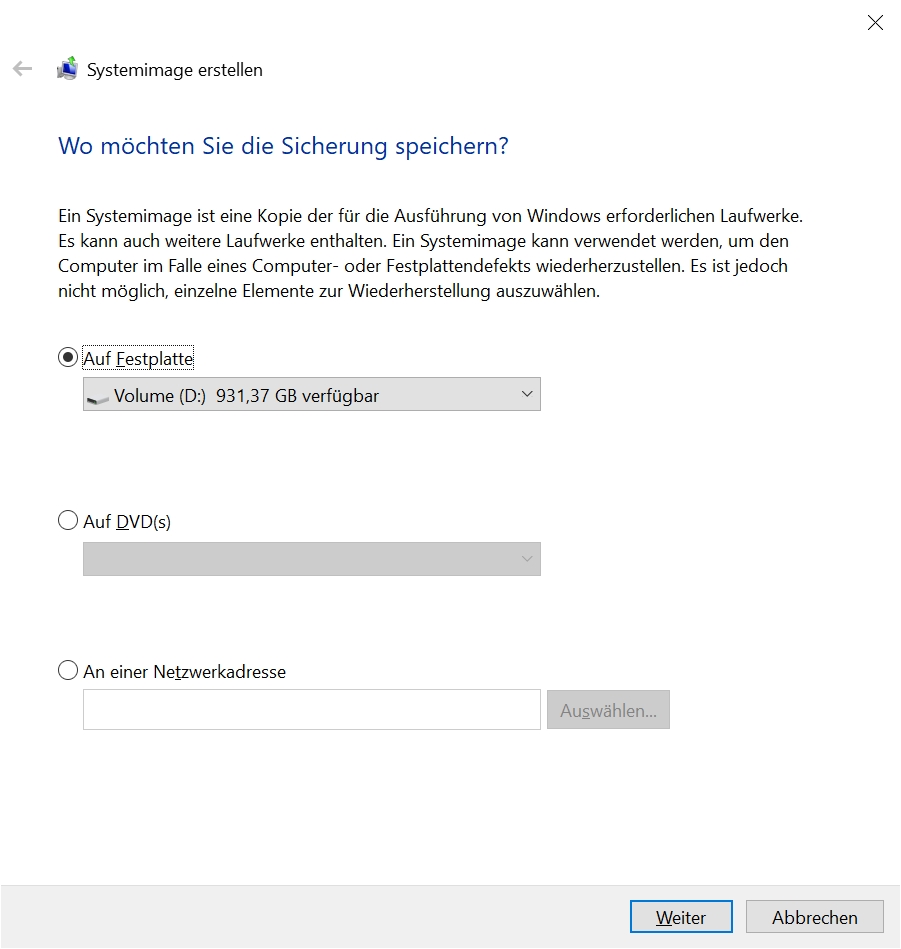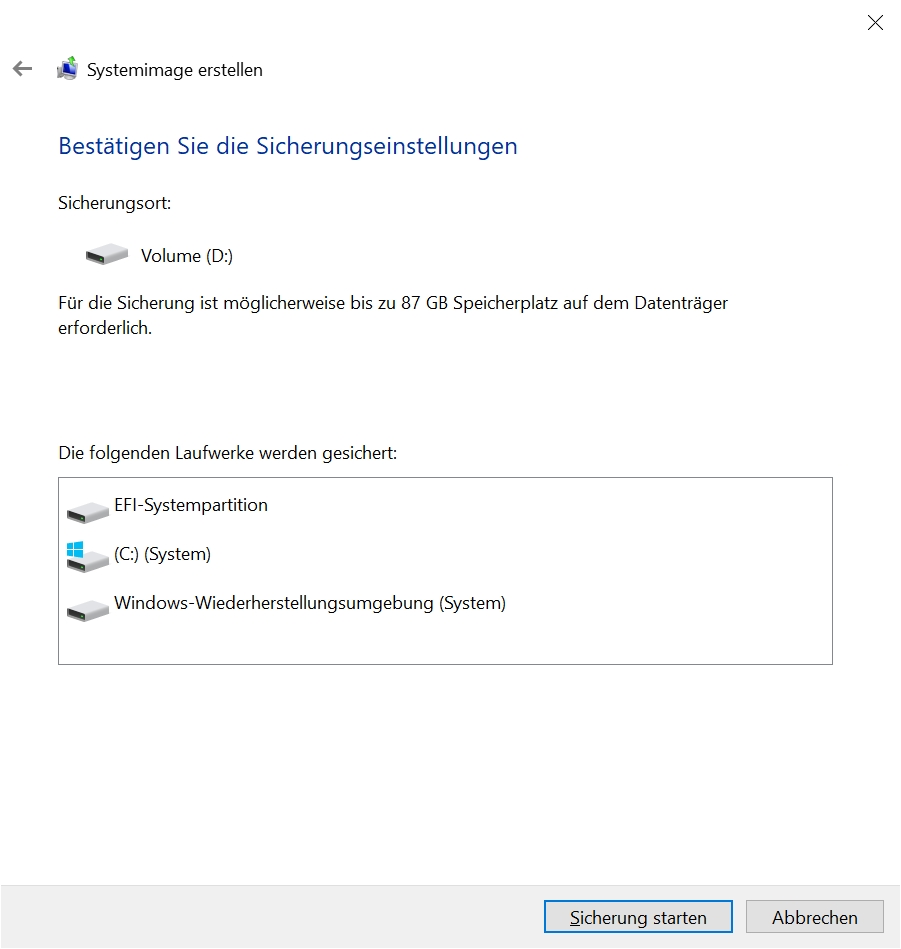 Das Erstellen eines vollständigen Systemabbilds findet sich in der Systemsteuerung unter Systemsteuerung/Sichern und Wiederherstellen (Windows 7: Systemabbild erstellen). Nach der Auswahl des externen Laufwerks ist das Starten der Sicherung möglich.
