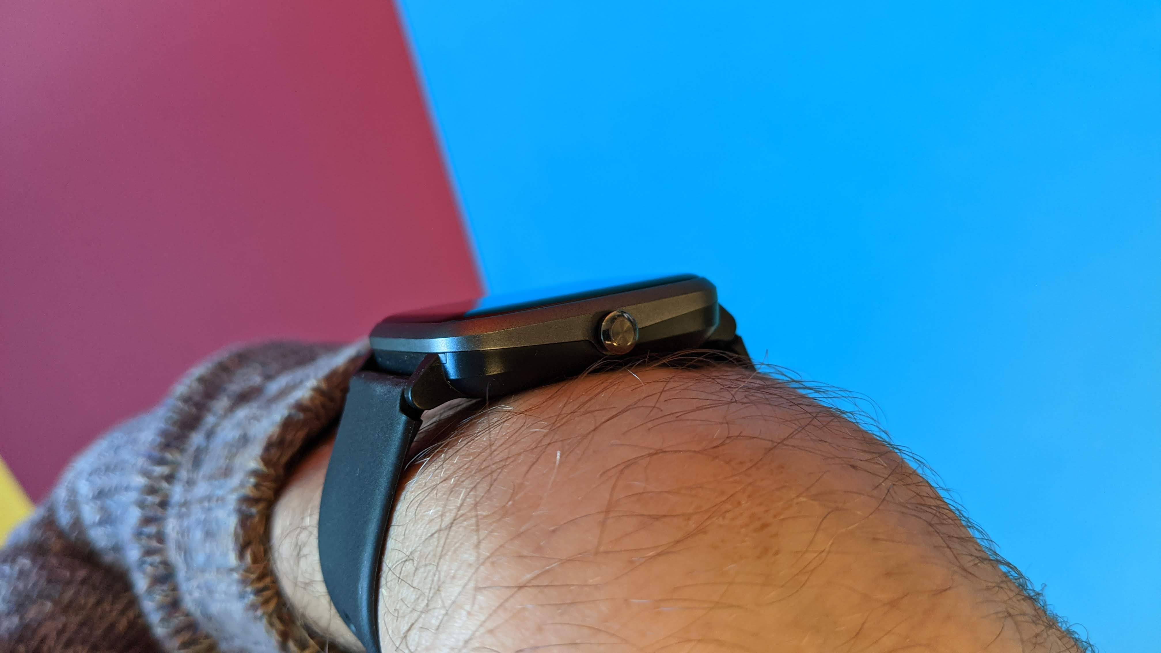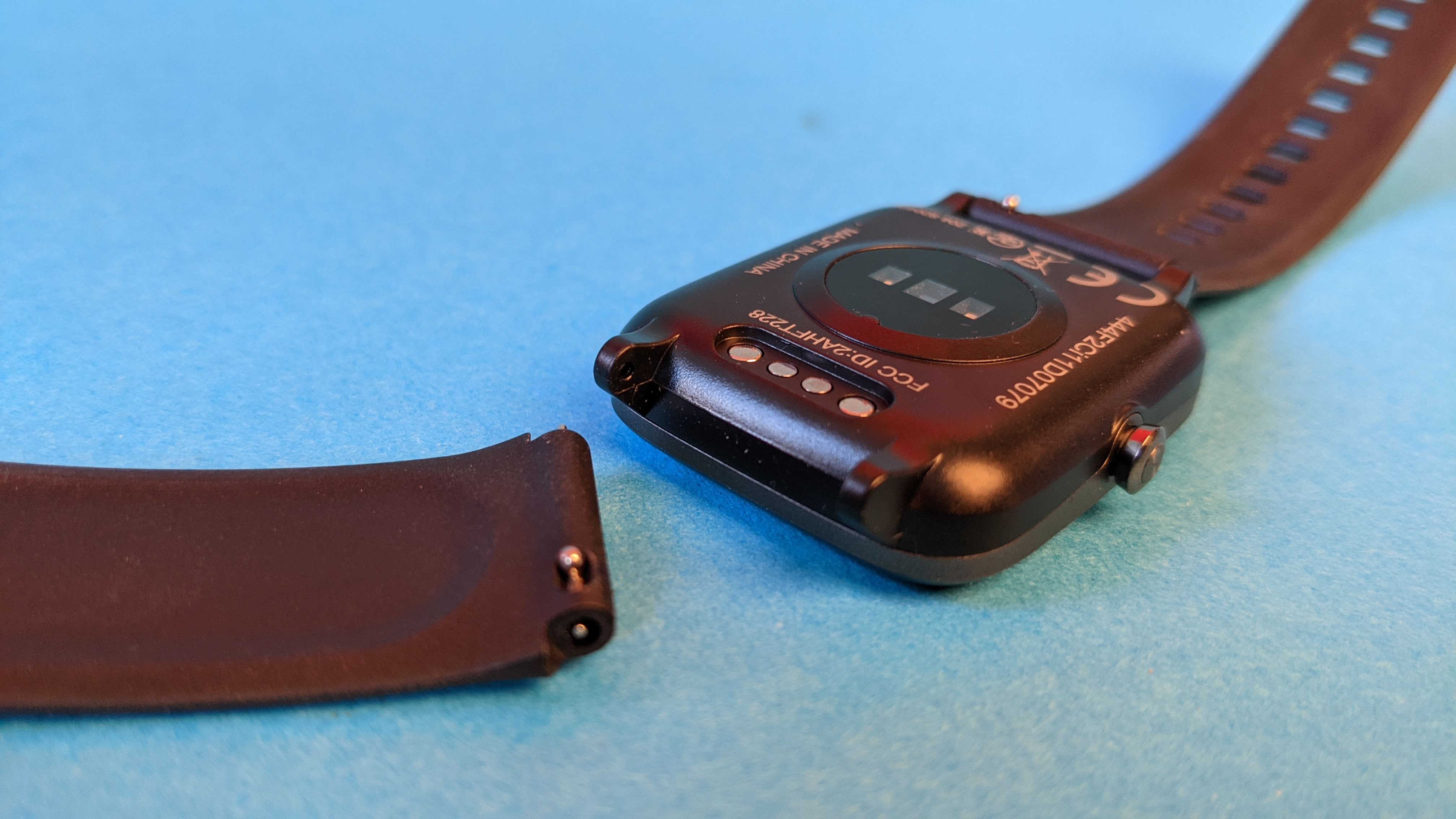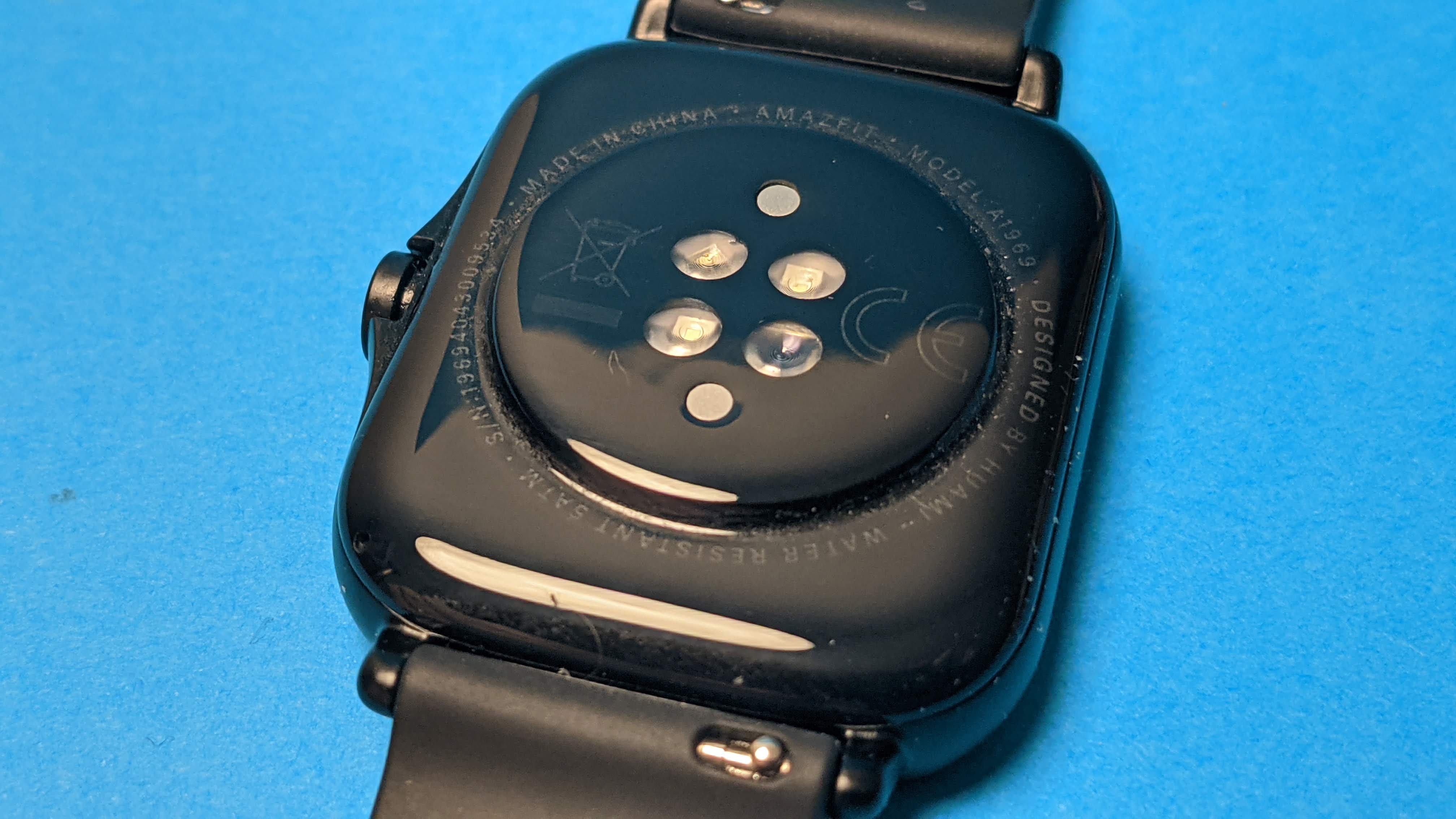 Optisch ähnelt sie der Apple Watch. Sie ist 12 Millimeter dick, 35 Millimeter breit und 41 Millimeter lang. Ihr 1,3-Zoll-Display ist mit 240 × 240 Pixel recht scharf, ausreichend hell und bietet brauchbare Blickwinkel. Allerdings ist der Display-Rand besonders an der unteren Seite deutlich zu dick. Bemerkenswert: Trotz ihres günstigen Preises bietet sie eine IP68-Zertifizierung. Mit ihr sollte man entsprechend bedenkenlos schwimmen können. Salzwasser sollte man meiden.