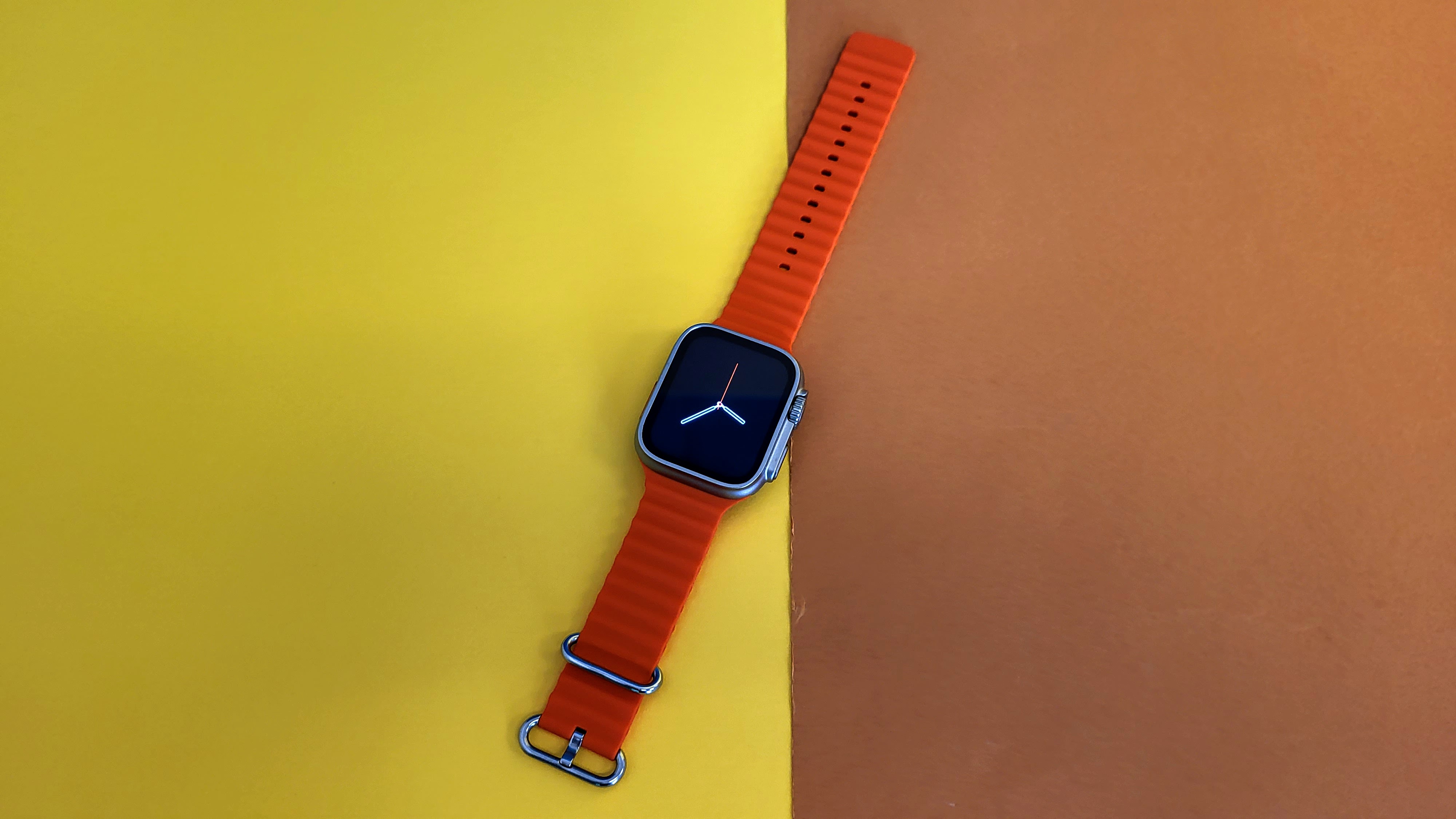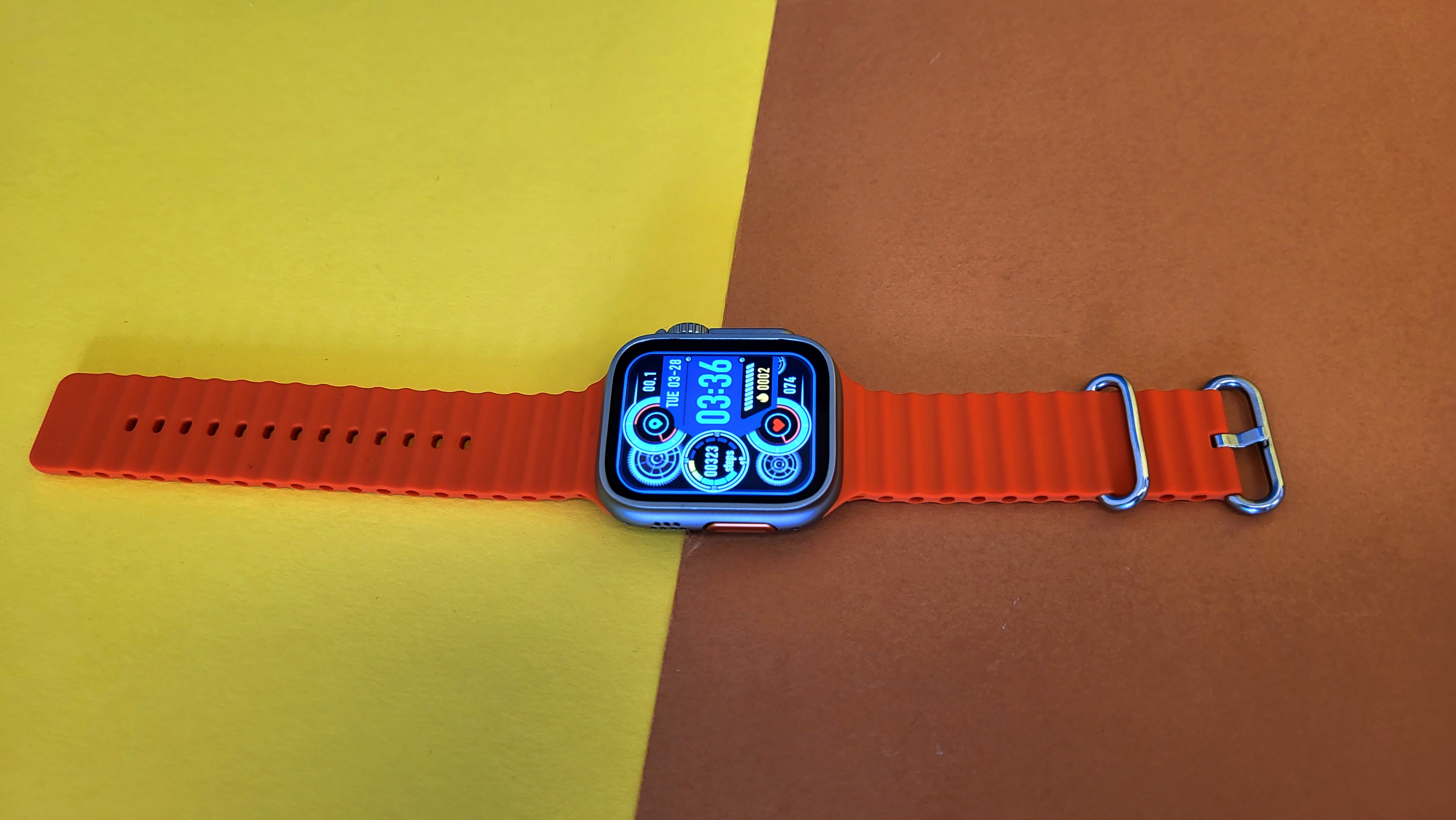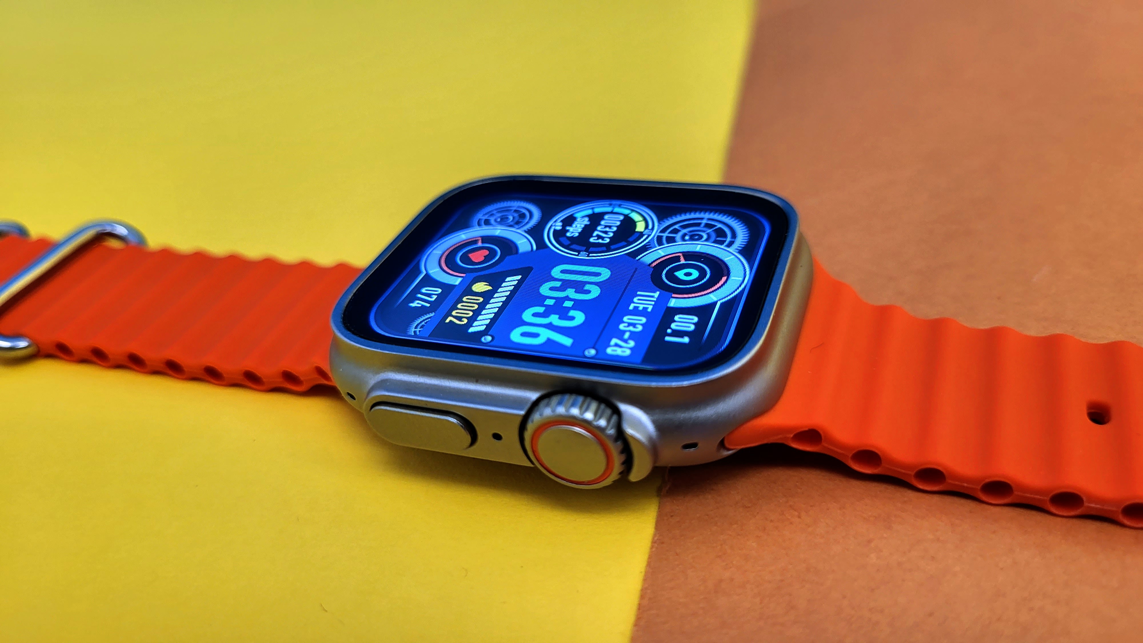 Das Gehäuse der Smartwatch ist tatsächlich aus Metall, dadurch wirkt die Uhr deutlich hochwertiger, als es der Preis vermuten lassen würde. Am Handgelenk ist sie ein schicker Hingucker und dürfte für viele auf den ersten Blick wie eine echte Apple Watch wirken. Das Gehäuse hat mit 49 Millimeter die gleichen Abmessungen wie die sündhaft teure Apple Watch Ultra.