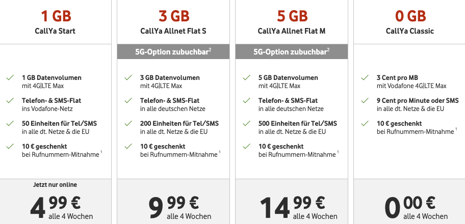 Vodafone selbst hat mit Callya Start einen 5-Euro-Tarif im Angebot, der alle vier Wochen abgerechnet wird. Das ist der einzige 5G-Tarif, den wir in dieser Preisklasse finden konnten. Darin enthalten sind 1 GByte Datenvolumen (bis zu 500 MBit/s), eine Flat ins Vodafone-Netz sowie 50 Freiminuten oder SMS für alle weiteren Netze. Anschlusskosten entfallen und 10 Euro gibt es bei Rufnummernmitnahme als Gutschrift aufs Kundenkonto. Die Kündigungsfrist beträgt einen Monat.