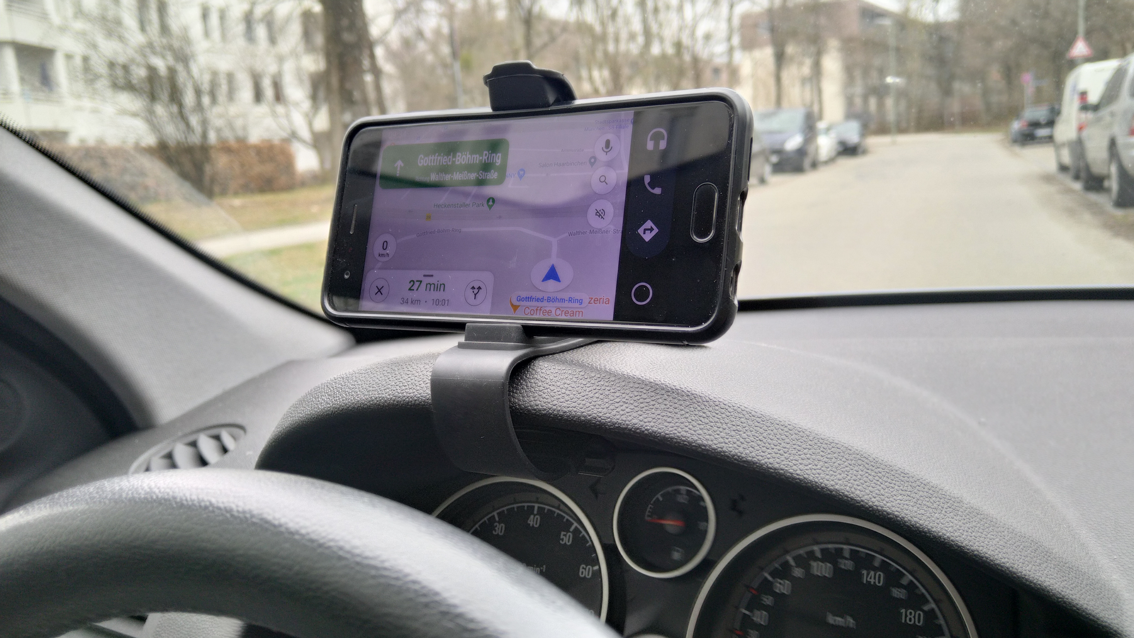 Eine andere Lösung bieten Klemm-Halterungen. Mit einer gummierten Klammer umfassen diese das Smartphone – das sorgt für festen Halt und erlaubt unterschiedlich große Endgeräte. Die Halterung schiebt man oberhalb des Tachometers auf das Armaturenbrett. Bei dieser Lösung hat man das Smartphone wie ein Head-up-Display (Ratgeber) vor der Nase und schaut trotzdem immer in Fahrtrichtung. Entsprechende Modelle gibt es bei Amazon für 14 Euro und 14 Euro von Matein.