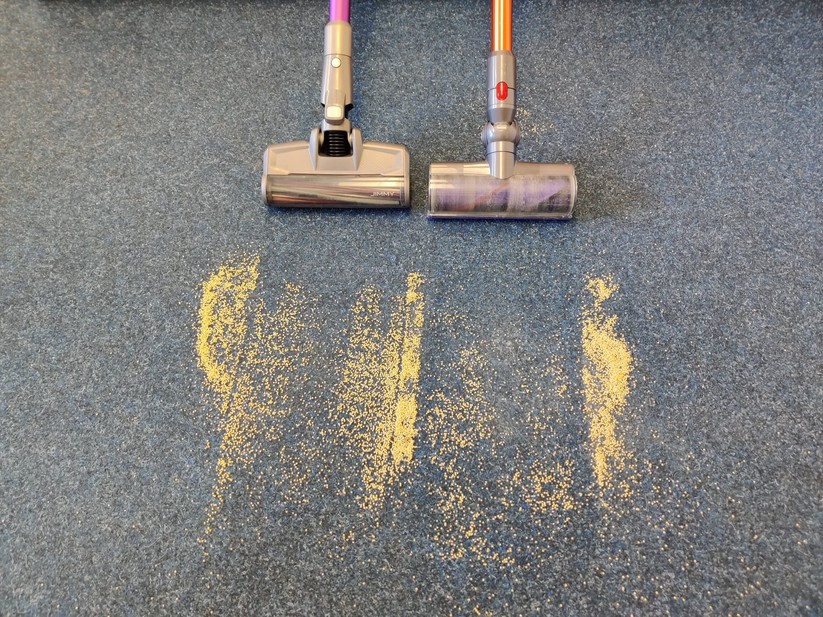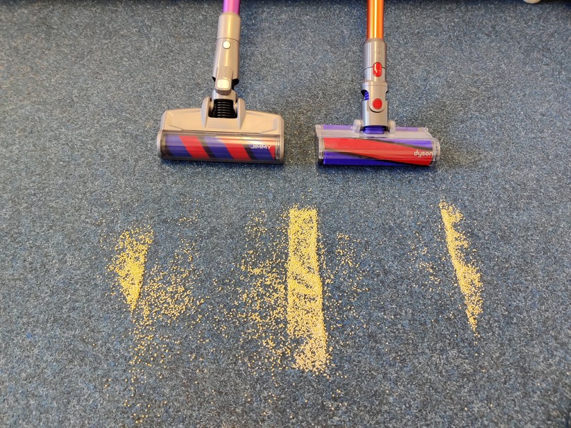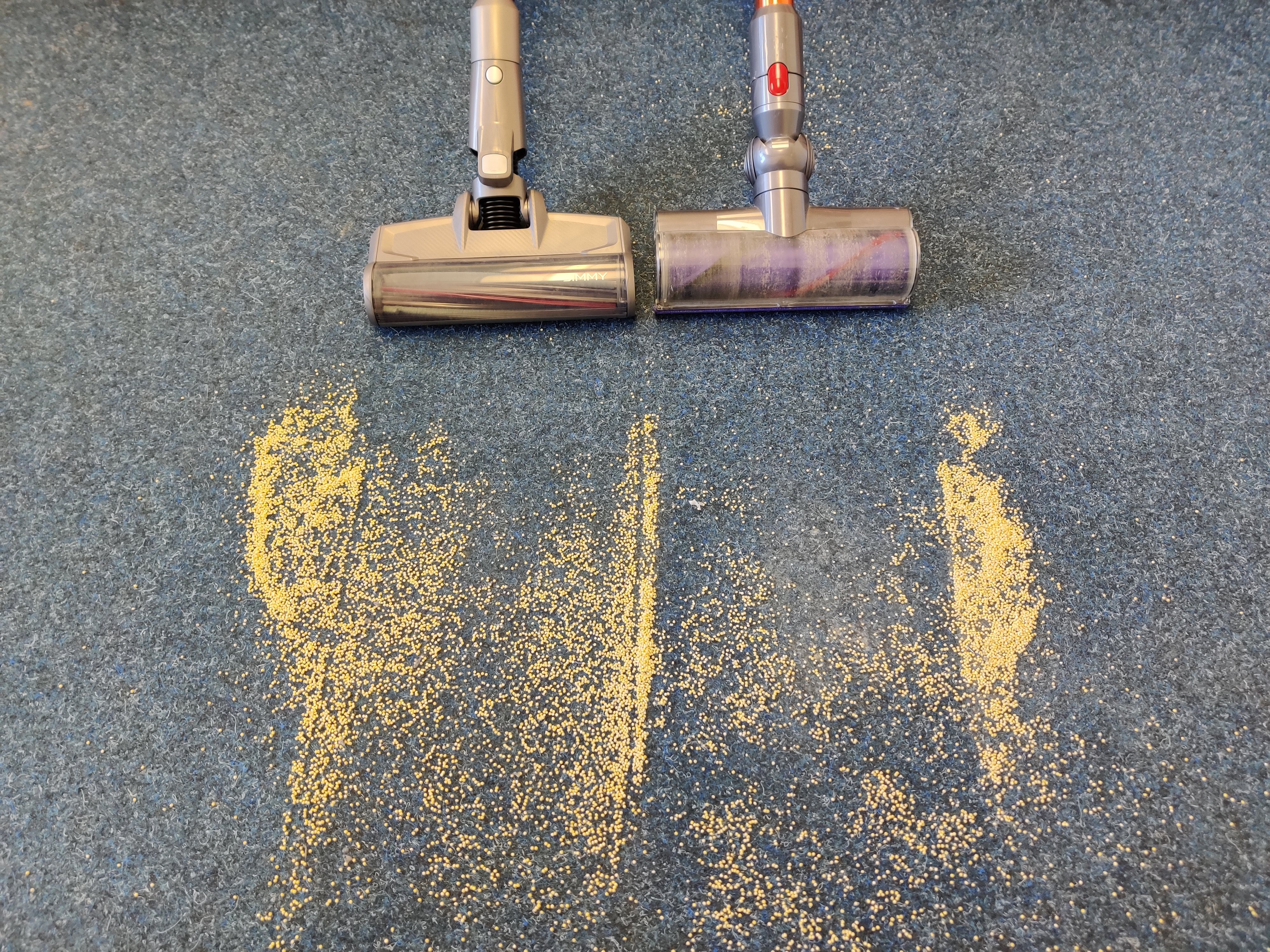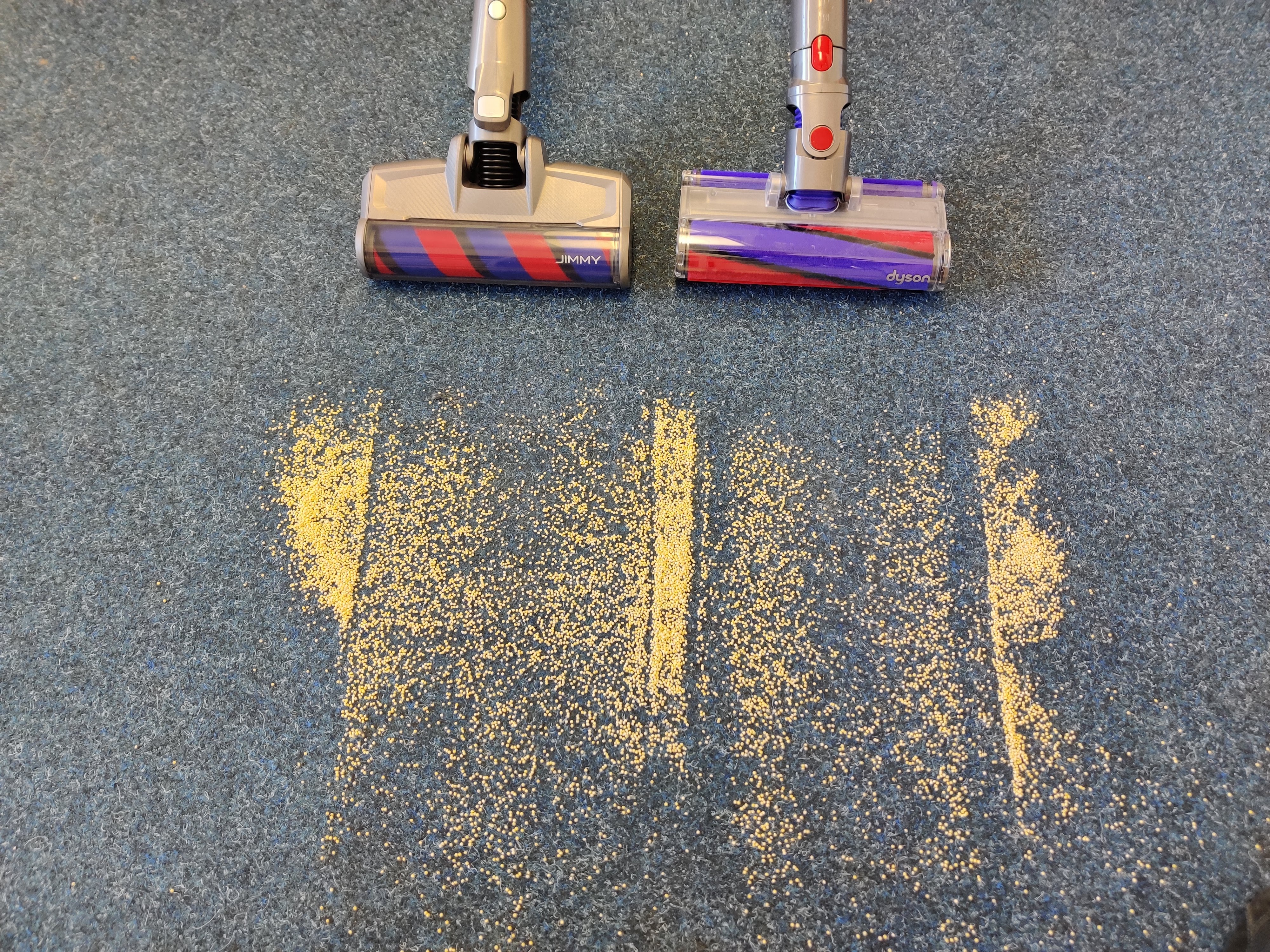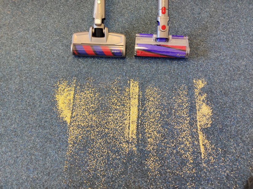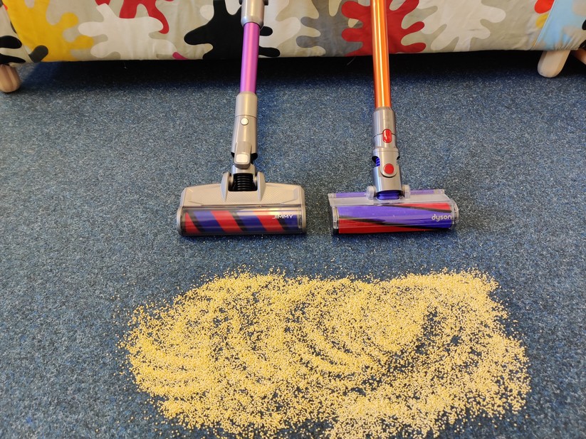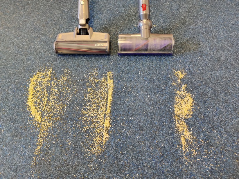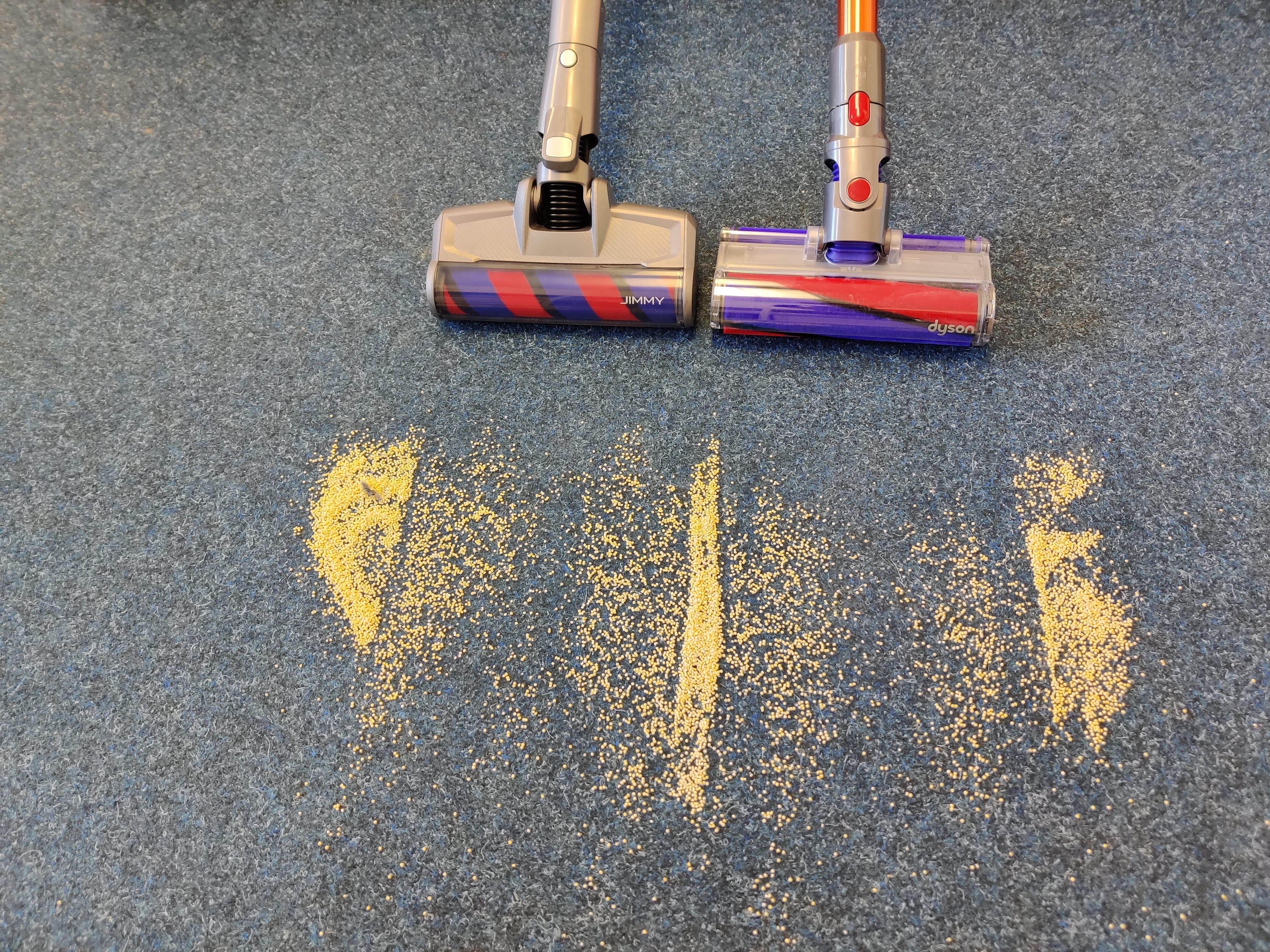 Auf Teppich zeigt der Dyson V10 bei allen Tests die bessere Saugleistung. Besonders deutlich ist dies beim Einsatz der Teppichbürste auf voller Stufe. Während beim Dyson V10 nur vereinzelte Hirse liegen bleibt, sind die Hirsereste beim Saugen mit dem Jimmy JV85 Pro noch sehr präsent. In der mittleren und unteren Stufe und bei Nutzung der Kombibürste ist der Unterschied zwar geringer, aber trotzdem stets da.