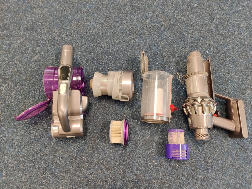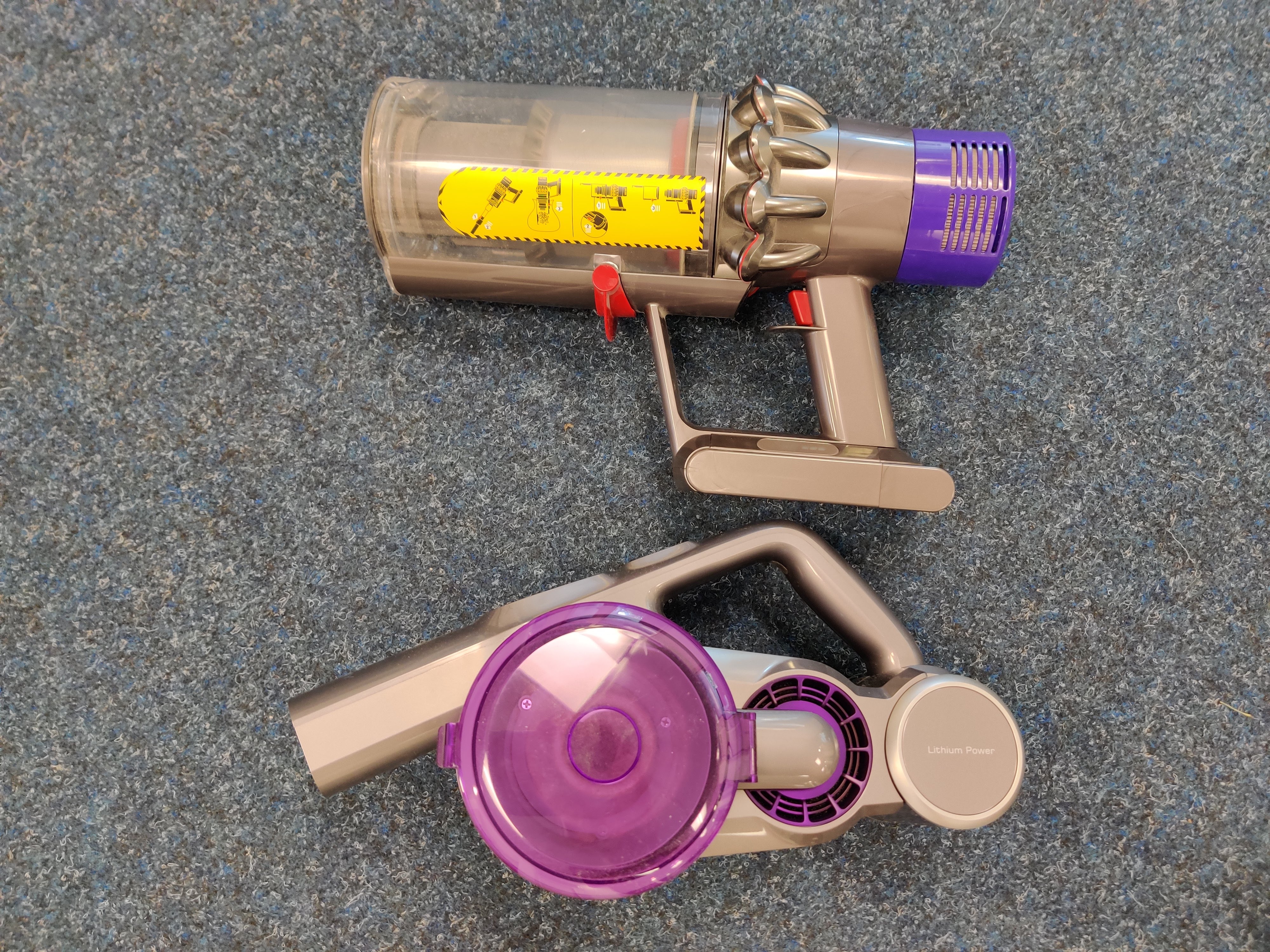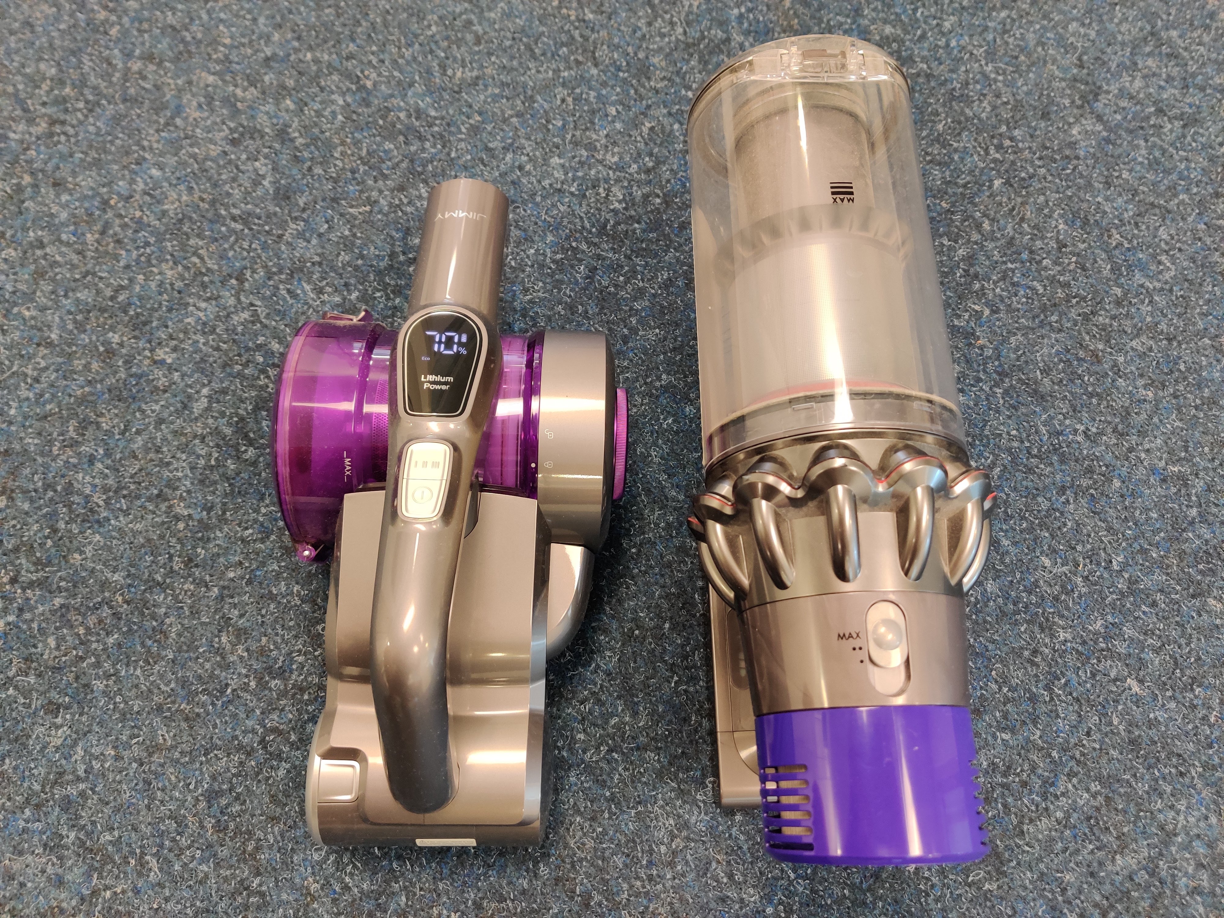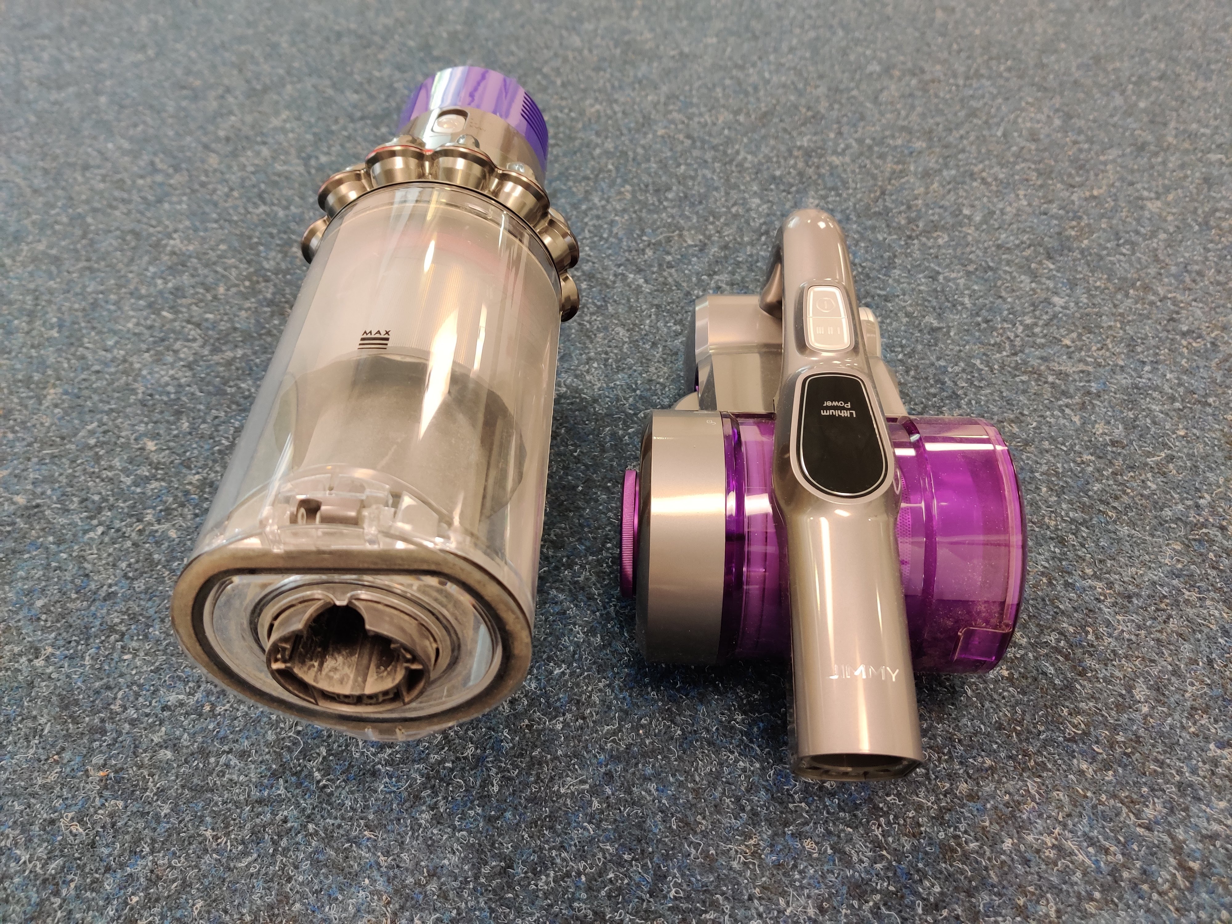 Um Jimmys vollmundige Behauptung zu überprüfen, lassen wir den JV85 Pro und den nicht viel teureren 2018er Dyson V10 Cyclone (Testbericht) im Saugduell gegeneinander antreten. Der V10 bietet dabei das gleiche Design und die gleiche Handhabung wie dessen Nachfolger V11. Allerdings soll der V11 nochmal etwas effizienter saugen und leiser sein.