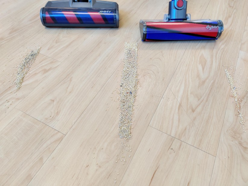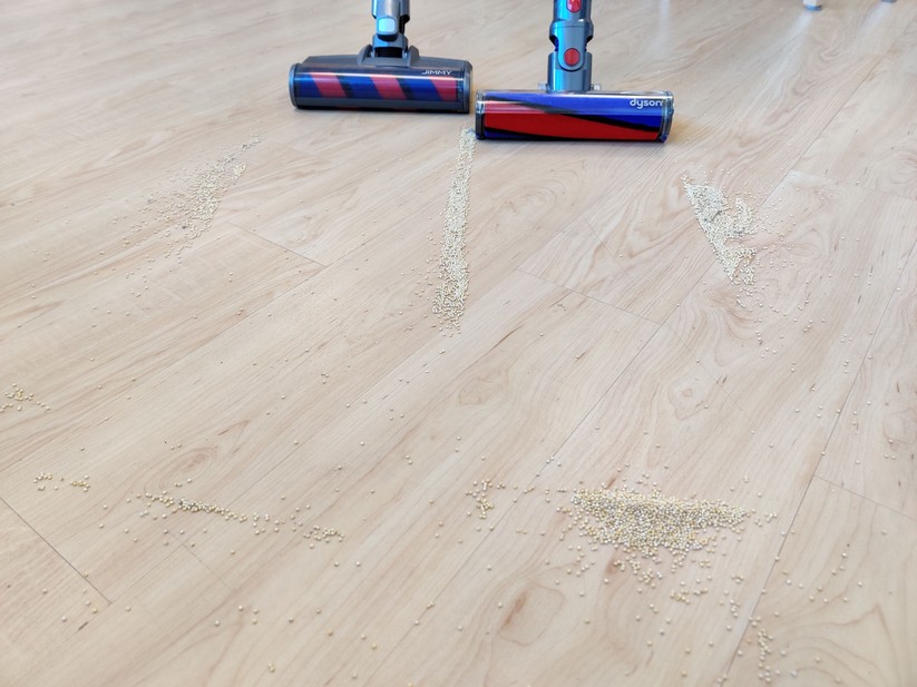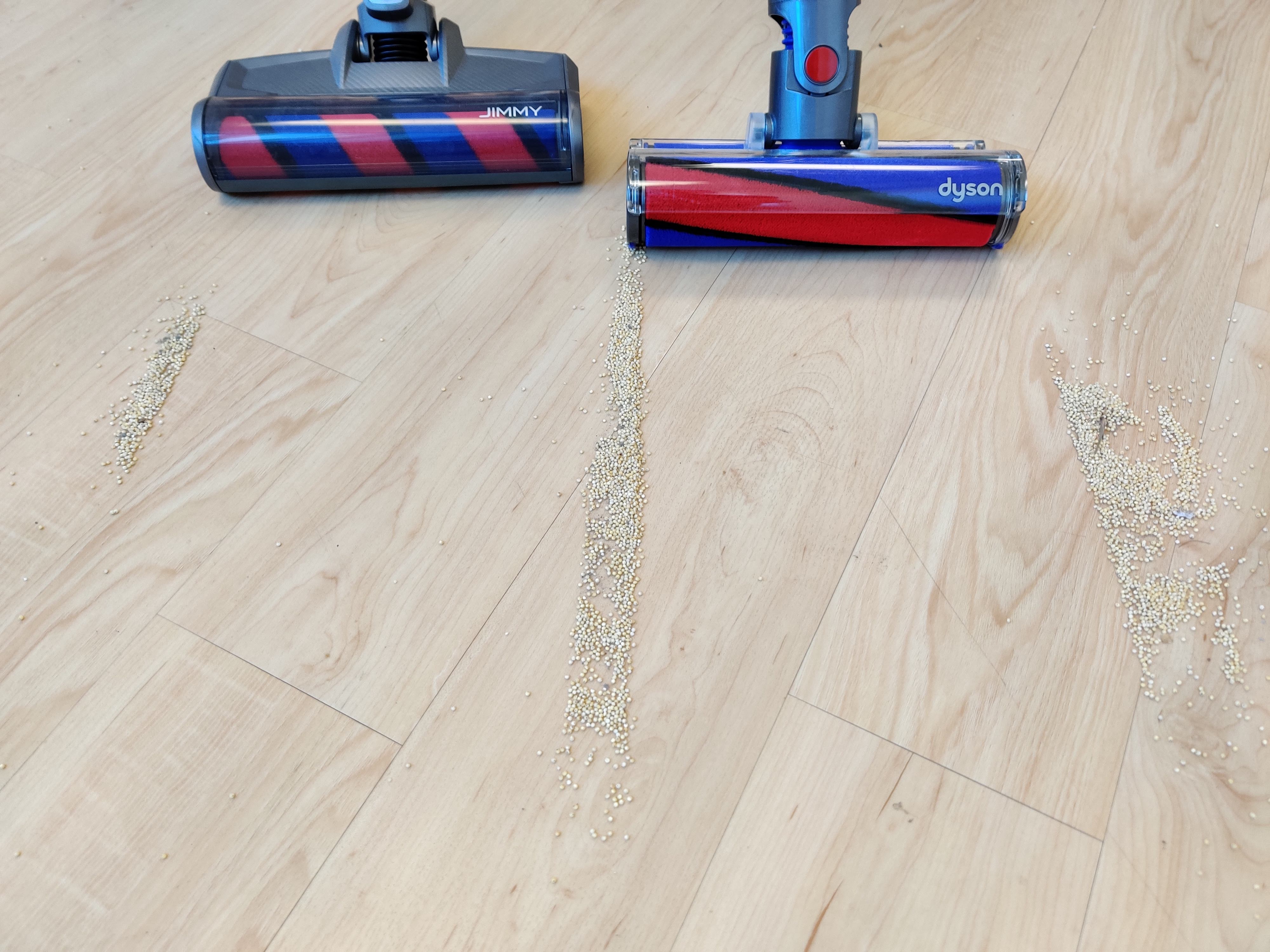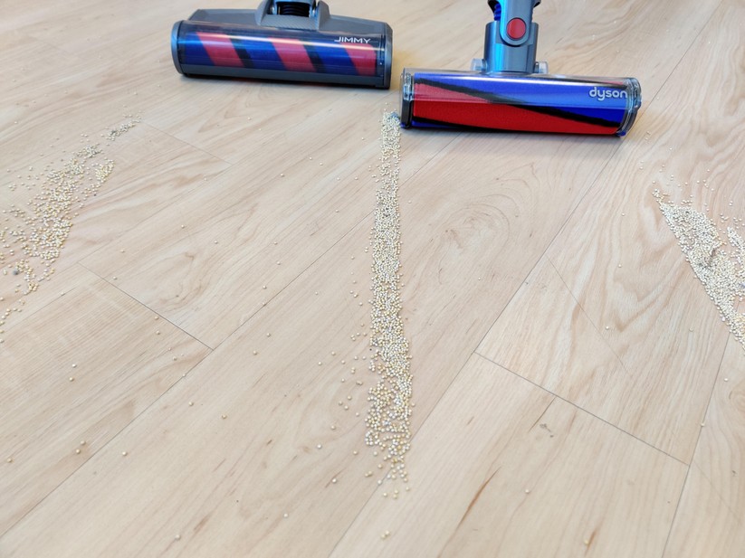 Beim Saugen auf Parkett ist der Unterschied sehr gering, dennoch liegt auch hier der Dyson vor dem Jimmy. Allerdings scheint Dyson viel von der Hirse vor sich herzuschieben und nicht gleich aufzusaugen. Denn nach dem Ausschalten bleibt beim Dyson ein deutliches Hirsehäufchen liegen – das macht Jimmy besser.