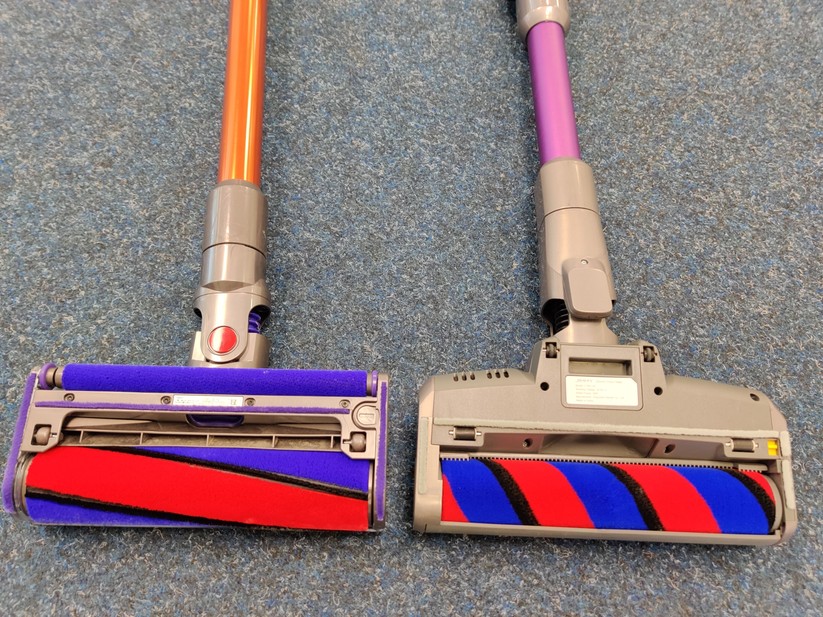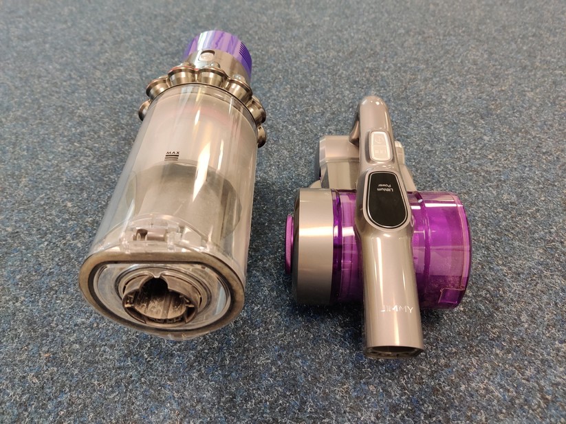 Der Jimmy JV85 Pro bietet einen Griff, der sich von hinten bis über die Saugeinheit zieht. Deswegen fällt das Saugen mit ihm deutlich einfacher als beim Dyson, dessen Griff nicht nach oben ragt. Ein zweiter Punkt, den Jimmy schon seit einigen Staubsaugergenerationen besser macht als Dyson: Die Chinesen bauen einen On-Off-Taster ein, beim Dyson muss der Abzug beim Saugen mit dem Finger dauerhaft gedrückt werden.