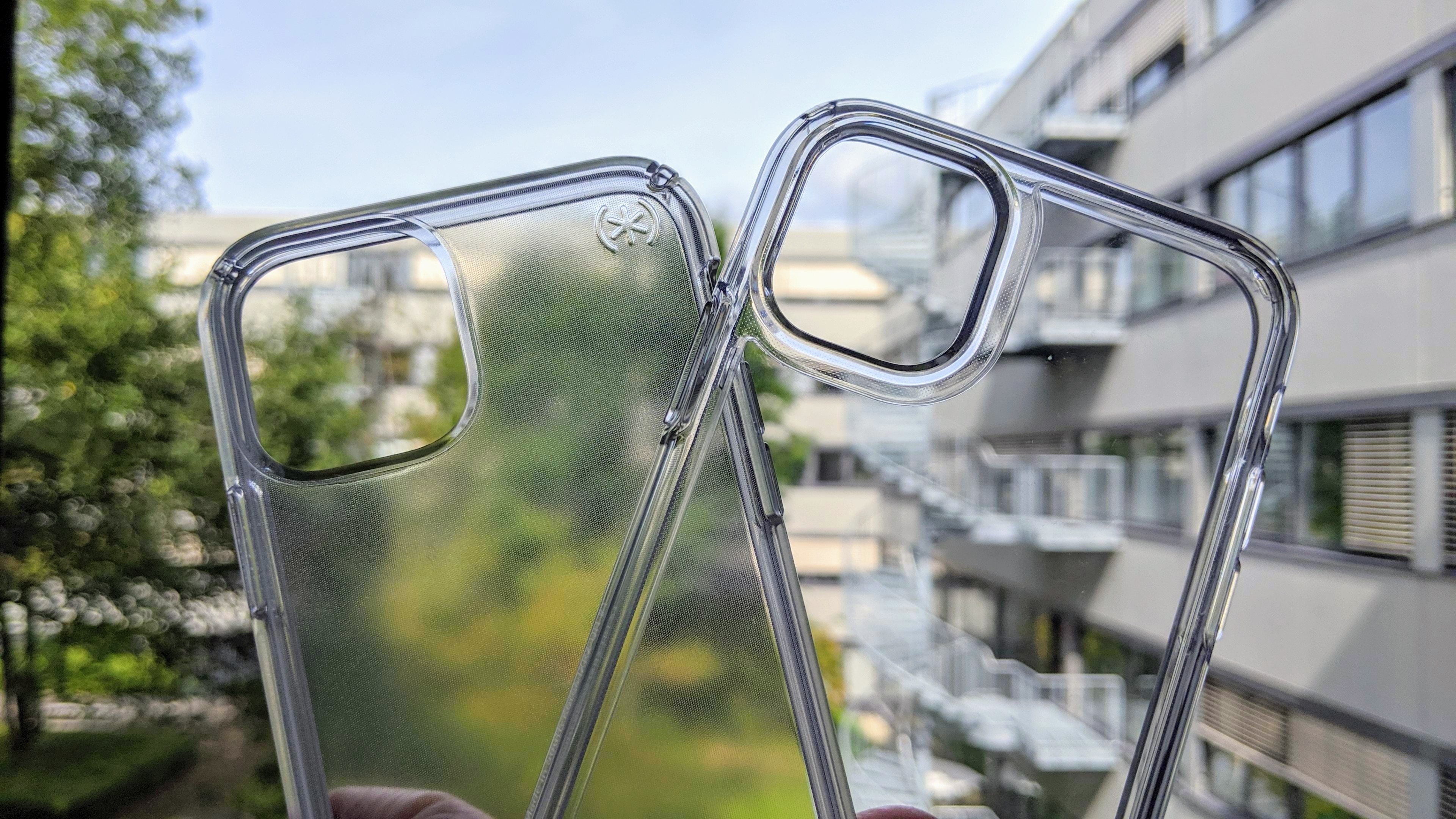 Gut gefällt uns die Spigen Ultra Hybrid für moderate 10,99 Euro. Obwohl die transparente Hülle aussieht wie aus einem Guss, besteht der weiche Rahmen aus einem anderen Material als die feste Rückseite, die innen wie außen komplett glatt ist. Das ist ungewöhnlich, die meisten transparenten TPU-Hüllen rauen die Innenseite leicht auf, um die Rückseite vor Mikrokratzern zu schützen. Das hat dann jedoch den Nachteil, dass die Hüllen nicht mehr perfekt transparent sind, sondern eher milchig wirken. Spigen kann bei der Ultra Hybrid darauf verzichten, da es einen minimalen Anstand zwischen Rückseite und Hülle gibt.