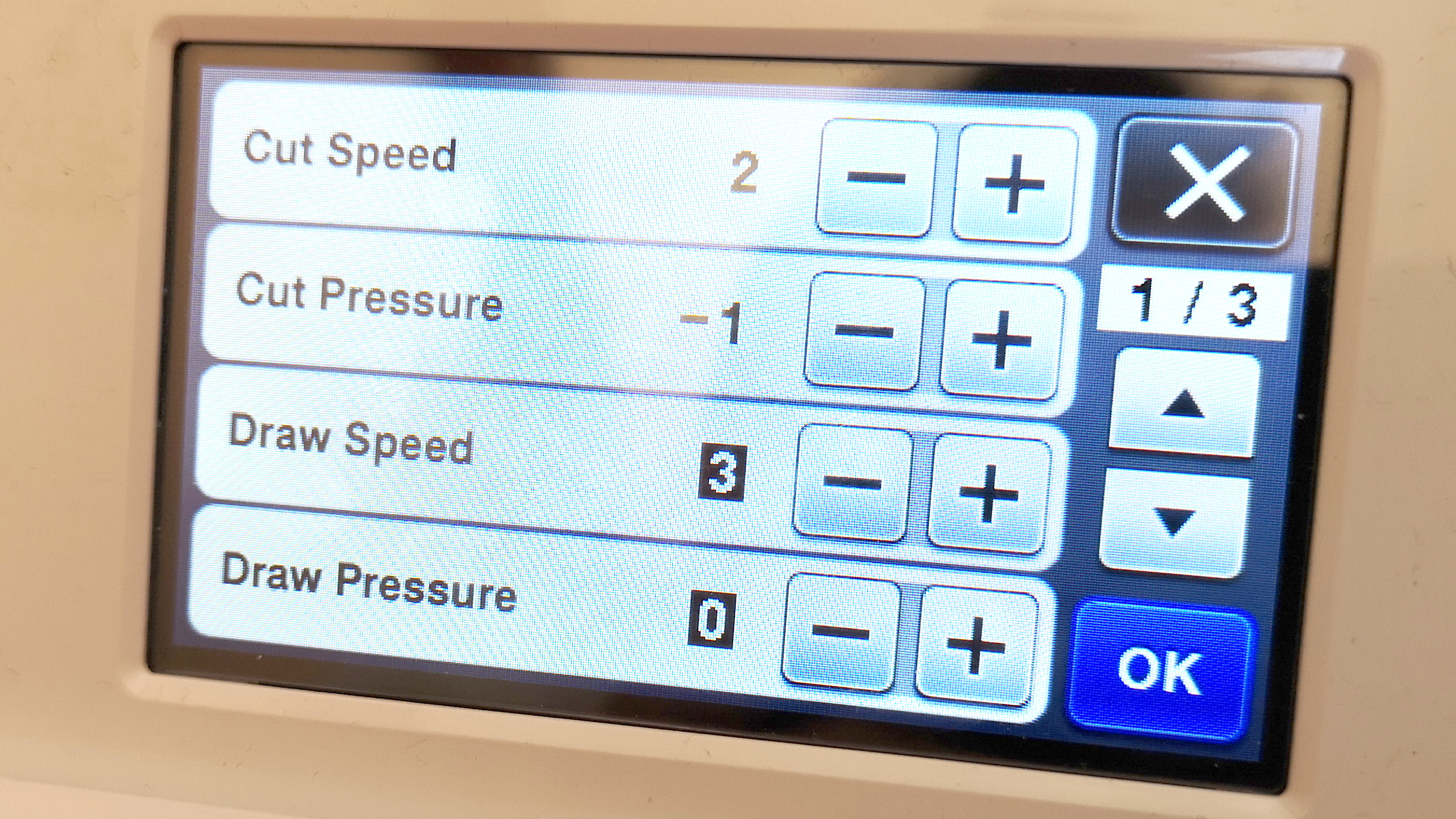Bei einigen der getesteten Materialien mussten wir ein bisschen herumprobieren, bis wir die perfekten Einstellungen gefunden haben. Sind diese nicht korrekt gewählt, kann sich beispielsweise das Papier von der Schneidematte lösen und sich während des Plottens verschieben. Bei selbstklebenden Folien ist die Suche nach den richtigen Settings für Geschwindigkeit, Anpressdruck und Klingenlänge erfahrungsgemäß etwas schwieriger als bei Papier. Die Herstellerangaben für die verschiedenen Materialien sind zwar nicht immer perfekt, aber immerhin ein guter Anhaltspunkt, um schnell die Idealeinstellung zu finden.