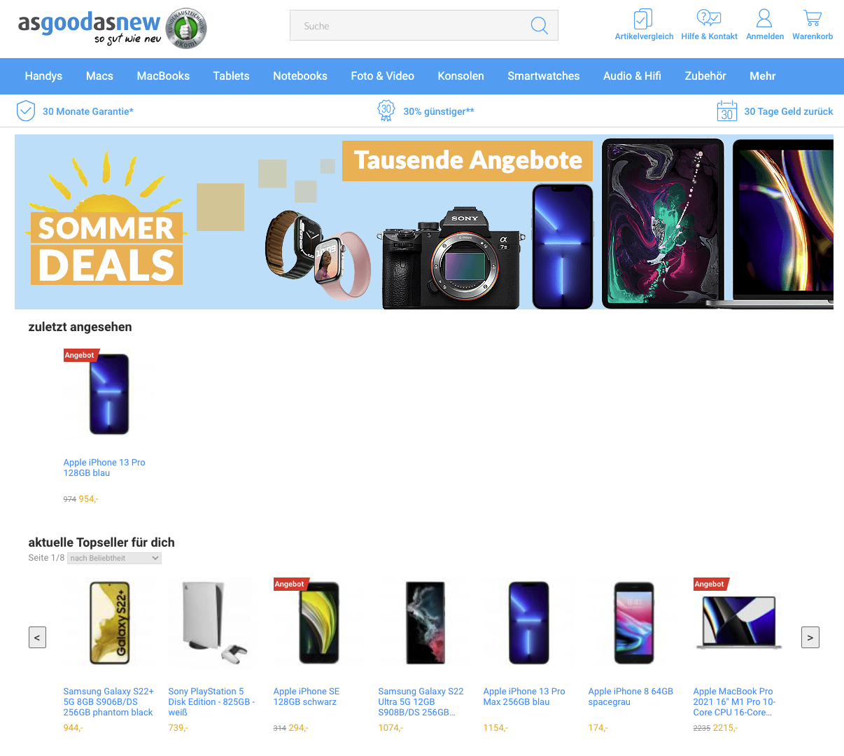 Wer einen neuen-alten Laptop sucht, ein geprüftes Kameraobjektiv oder einen aufbereiteten Bluetooth-Speaker, ist bei Asgoodasnew an der richtigen Adresse. Die Auswahl an Produkten und Marken ist beeindruckend, wobei die Navigation durch das Ladensystem nicht immer leicht fällt. Asgoodasnew wirbt mit 30 Monaten Garantie auf alle Einkäufe, vorausgesetzt Kunden registrieren die erworbenen Produkte online. Für Ankäufe verweist Asgoodasnew auf den Online-Service Wirkaufens, der vom gleichen Unternehmen betrieben wird. Die Gebrauchtware wird anschließend in eigenen Werkstätten in Frankfurt instandgesetzt.