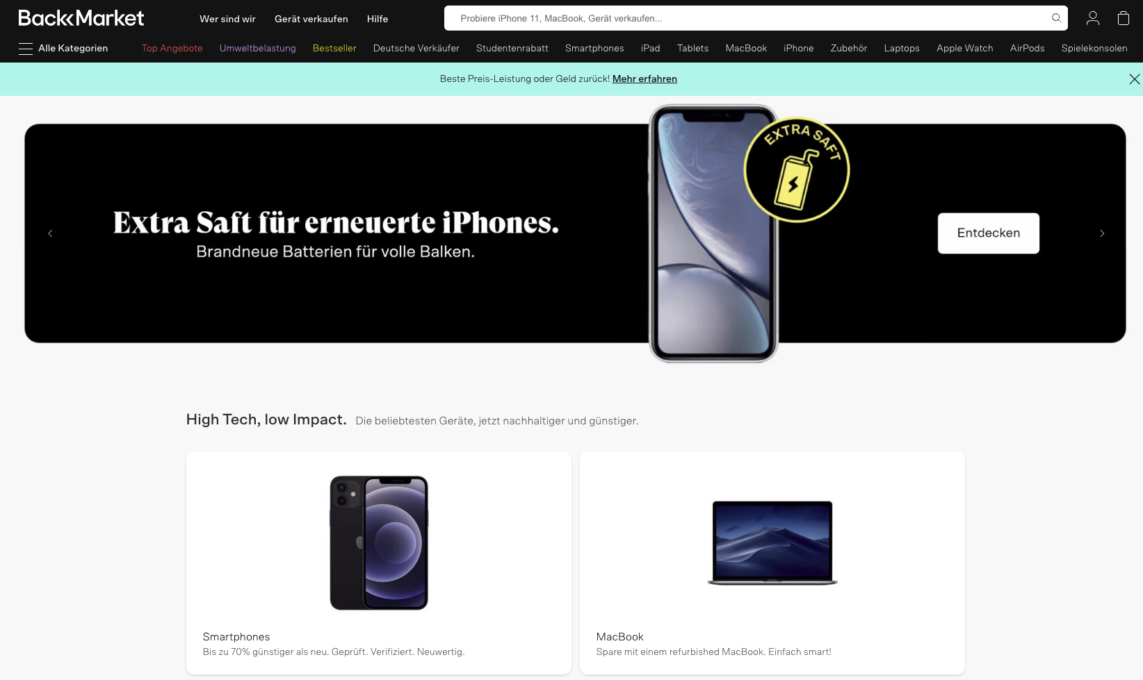 Das Angebot von Backmarket ist beeindruckend groß, fast so umfangreich wie bei Ebay, und reicht von IT-Geräten über Küchenhelfer bis hin zu Pflege- und Beauty-Produkten. Diverse Sortiermöglichkeiten und Filter erleichtern die Übersicht im Shop. Die Produktbeschreibungen bei Backmarket sind besonders informativ: Es gibt getrennte Angaben für den technischen und den optischen Zustand, Informationen zu etwaigen Reparaturen sowie zu den ausführenden Werkstätten (die über ganz Europa verteilt sind). Genau wie Refurbed kauft auch BackMarket benutzte Produkte von Kunden oder verrechnet den Gebrauchtwert beim Erwerb eines neuen Modells.
