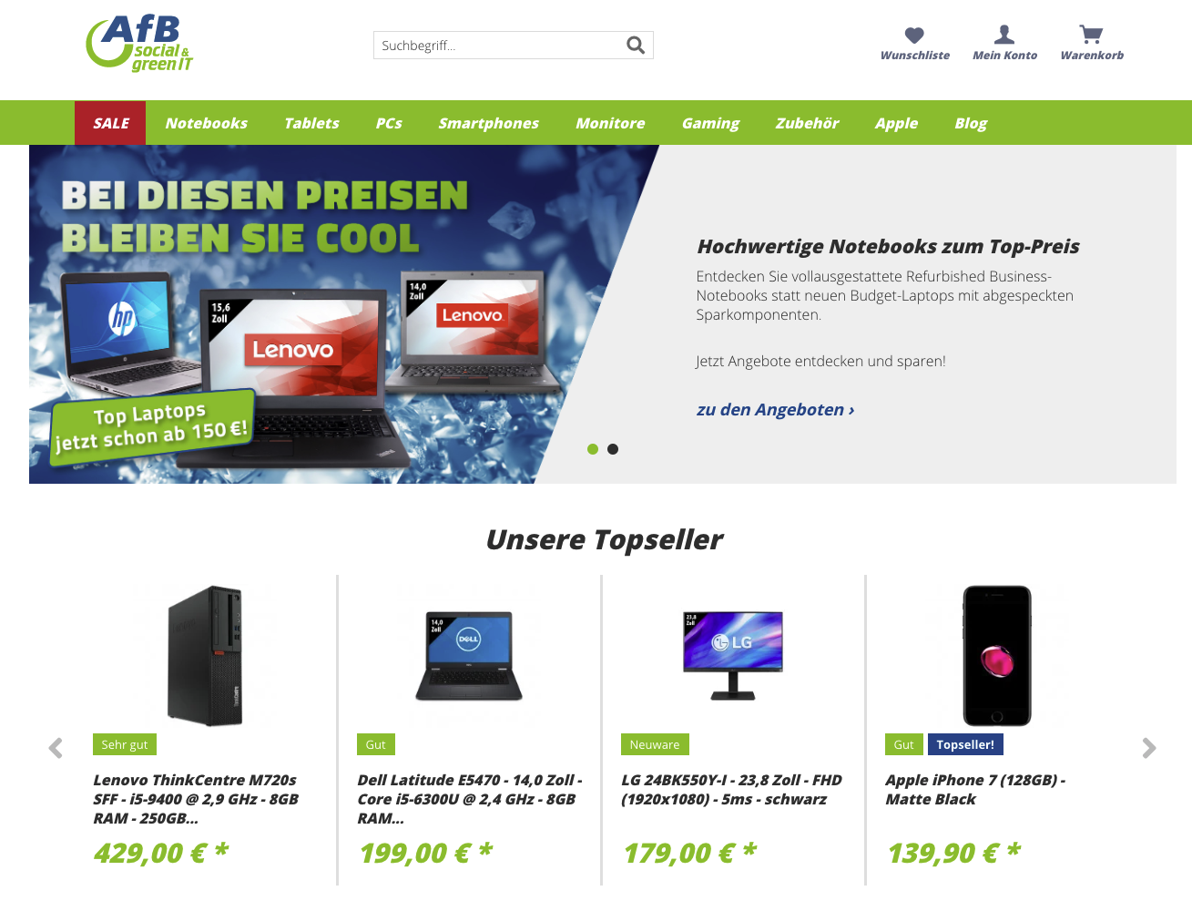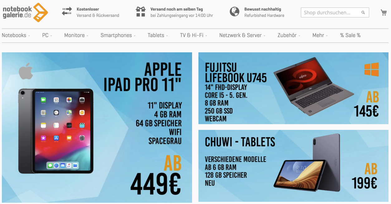 Der Name trügt: Bei Notebookgalerie.de gibt es längst nicht nur tragbare Rechner. Vielmehr offeriert der Online-Shop auch gebrauchte Desktop-Systeme und Peripherie, Smartphones und Tablets, Fernseher und HiFi-Geräte sowie diverses Zubehör. Notebookgalerie.de wirbt mit einem aufwendigen Wiederaufbereitungsprozess. Ob allerdings wirklich „jedes Gerät“ zerlegt wird, scheint zumindest bei Handys und ähnlicher Mobilelektronik etwas verwunderlich. Trotzdem: Das Shop-System gefällt, die Produktinfos sind lobenswert ausführlich, Einkäufe werden schnell und gut verpackt versendet und der Support arbeitet zuvorkommend.