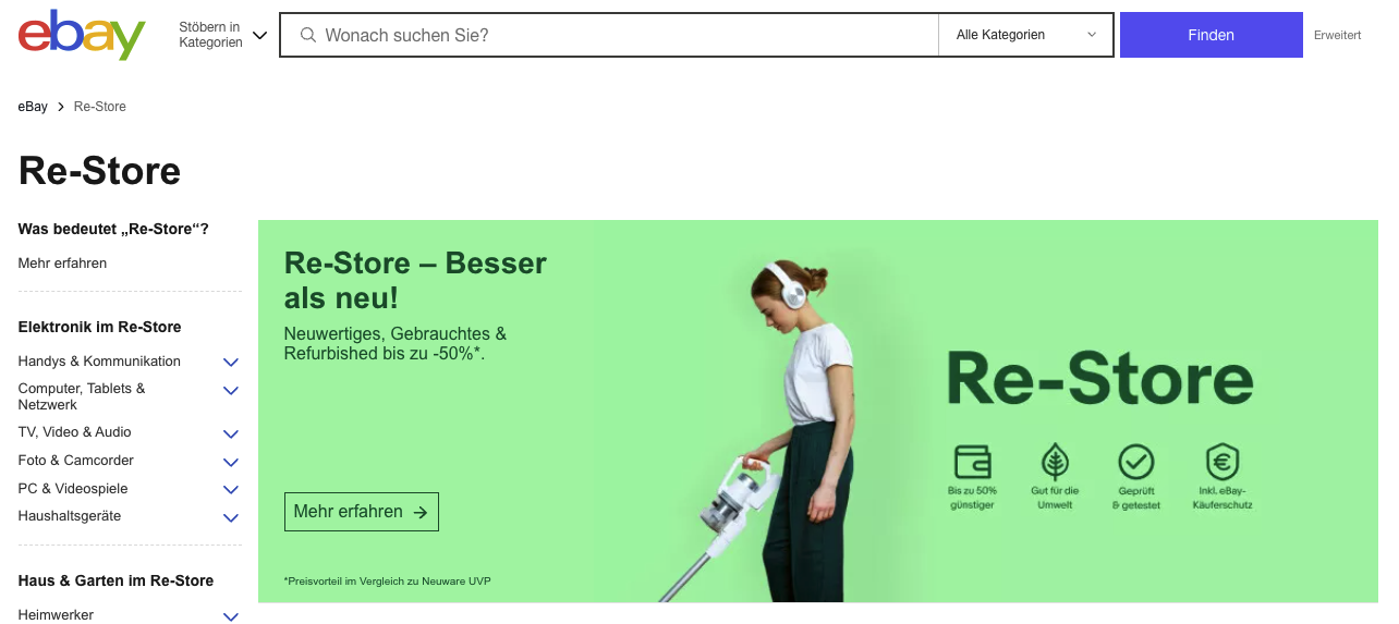 Ebay hat zum Beispiel den sogenannten Re-Store eingerichtet, der geprüfte Gebrauchtware, unbenutzte Ausstellungsstücke und wiederaufbereitete Artikel in über 30 Kategorien listet, von E-Book-Readern über Autozubehör bis hin zu Gartenmöbeln. So viel Refurbished-Ware findet man sonst nirgendwo! Die üblicherweise zum Festpreis angebotenen, manchmal aber auch versteigerten Produkte werden teils von den Originalherstellern, teils von zertifizierten Versendern angeboten. Entsprechend unterscheiden sich der Zustand der Produkte sowie die Rahmenbedingungen je nach Quelle – deshalb sollte man die Beschreibungen möglichst genau studieren.