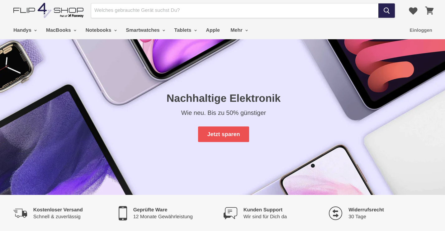 Flip4New kauft gebrauchte Elektronikgeräte an, bei Flip4Shop werden sie überarbeitet und anschließend in drei Qualitätsstufen von „Wie neu“ bis „Deutlich gebraucht“ wieder zu Geld gemacht, wobei der Betreiber Wert darauf legt, dass selbst die günstigsten Exemplare technisch einwandfrei funktionieren und die Akkuleistung mindestens 80 % beträgt. Alle Geräte erhalten zwölf Monate Gewährleistung. Auf etwaige Schönheitsfehler weist der Verkäufer in den Produktbeschreibungen ausdrücklich hin. Tablets und Smartphones machen den größten Teil des Angebots aus, bei Laptops dominieren MacBooks deutlich.