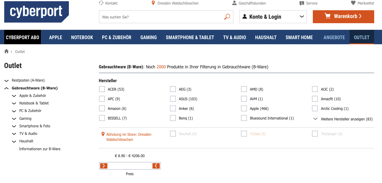 Cyberport ist bekannt als Versandhändler für brandneue Computer, Fernseher, Haushaltsgeräte und mehr, punktet aber auch mit einem umfangreichen Outlet-Bereich. Dort bietet Cyberport sowohl Gebrauchtgeräte an als auch preisreduzierte Restposten. Bei der B-Ware handelt es sich üblicherweise um geprüfte Rückläufer von Kunden, eine aufwendige Wiederaufbereitung findet bei Cyberport nicht statt, soweit ersichtlich. Der Umfang des Sortiments ist beeindruckend. Fast alle Kategorien und Marken aus dem Neuheiten-Shop sind auch gebraucht verfügbar, wobei die Produktinformationen auf etwaige Schäden und Einschränkungen genau hinweisen.