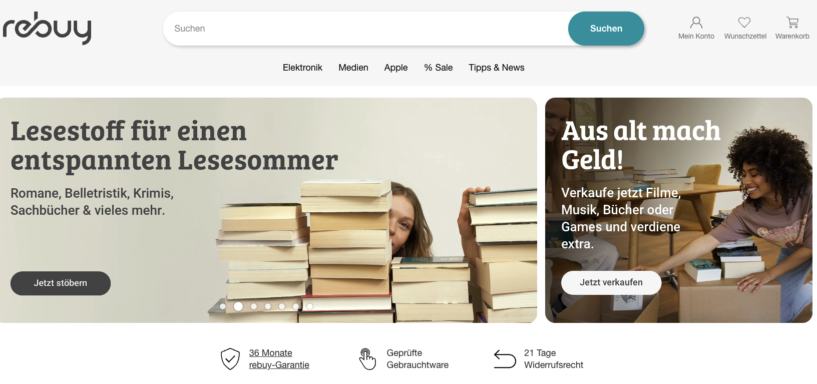 „Wir waren schon da, als Nachhaltigkeit noch kein Trend war“, behauptet Rebuy. Das ist vielleicht etwas übertrieben, aber das Unternehmen gehört tatsächlich zu den ältesten der Branche. Groß geworden ist Rebuy unter anderem mit dem An- und Verkauf von Filmen, Büchern und Videospielen. Den Geschäftsbereich gibt es immer noch, populärer scheinen aber heute wiederaufbereitete Elektronikgeräte wie E-Book-Reader, Kameras und Handys zu sein. Das Sortiment ist jedenfalls gigantisch. Mit drei Jahren Garantie auf Refurbished-Artikeln gehört Rebuy zu den großzügigsten Anbietern.