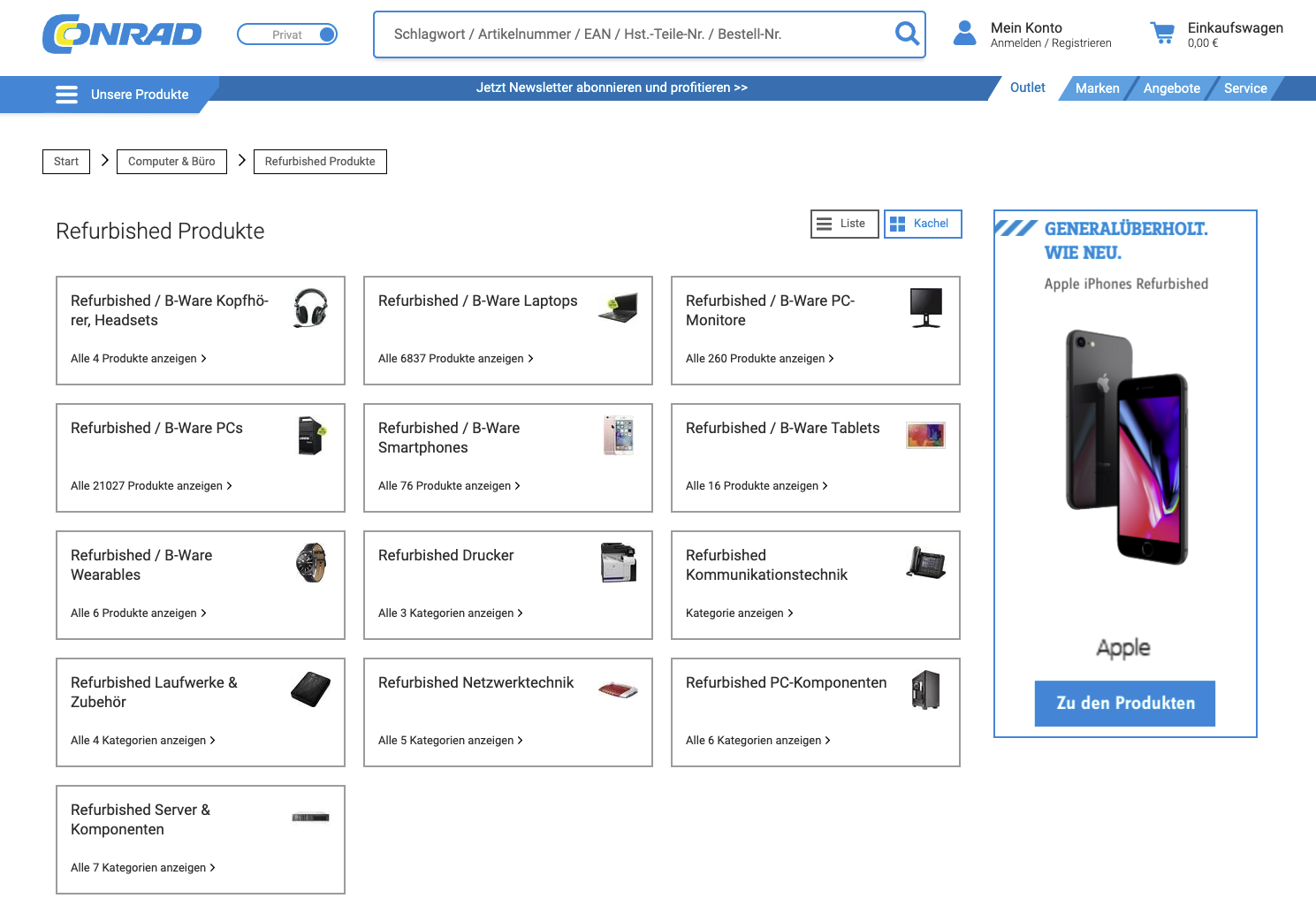 Obwohl Conrad auch als Eldorado für Hand- und Heimwerker bekannt ist, beschränkt sich das Refurbished-Angebot hauptsächlich auf IT-Elektronik: PCs und Laptops nebst Einzelteilen und Zubehör sowie eine überschaubare Auswahl an Smartphones und Tablets bekannter Marken. Conrad bezieht die Gebrauchtartikel teilweise von den Herstellern selbst, teils von professionellen Reparaturzentren, wo sie fachgerecht überholt werden. Leider sind die Zustandsbeschreibungen nicht sonderlich aussagekräftig und es gibt keine Fotos der angebotenen Produkte. Dafür gefallen die Sortiermöglichkeiten im Shop.