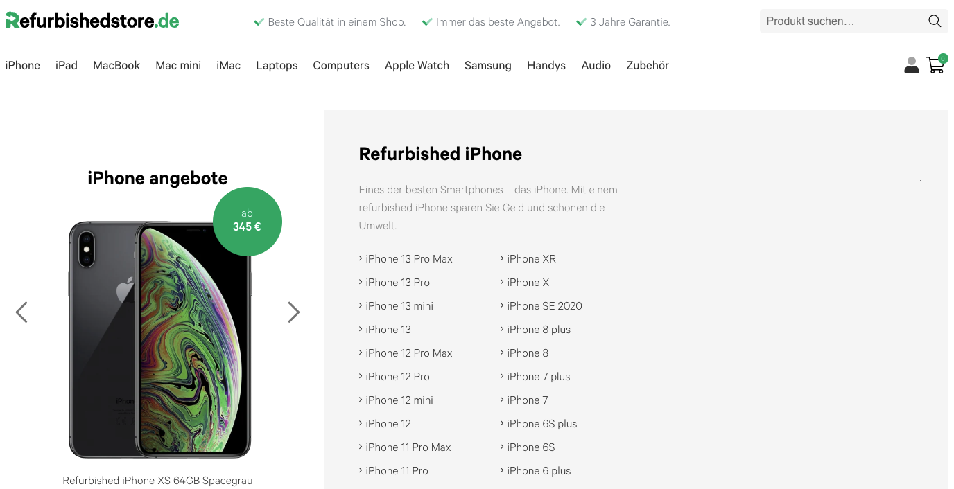 Der niederländische Refurbishedstore konzentriert sich größtenteils auf Apple-Erzeugnisse, angefangen bei aktuellen und frühere iPhone-Modellen bis hin Desktop-Rechnern aus Cupertino. Handys und Computer anderer Marken wie Lenovo, Acer oder Samsung sind ebenfalls erhältlich, werden aber weitaus weniger prominent angepriesen, trotz der beachtlichen Auswahl. Der Shop wirbt mit mindestens drei Jahren Garantie und besonders schnellem Gratisversand, dafür scheinen beim schnellen Quervergleich die Preise eher am oberen Ende der Skala angesiedelt zu sein.