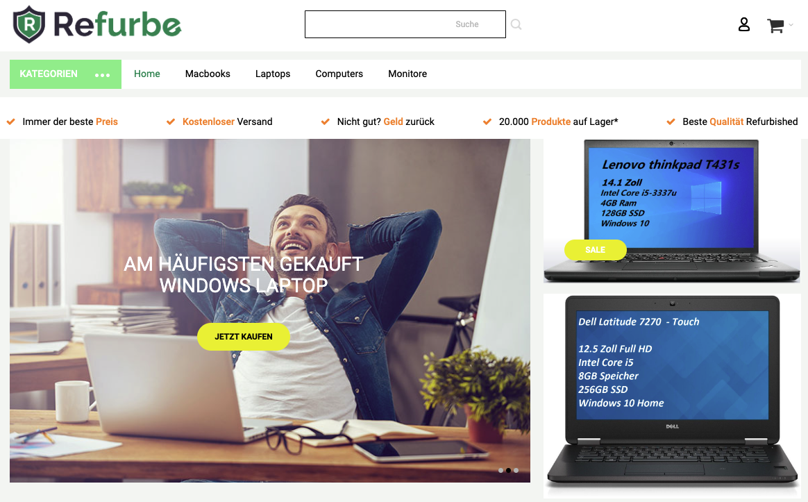 Refurbe bietet fast ausschließlich Computer feil, mobile genauso wie stationäre Geräte, und dazu passende Peripherie wie Monitore oder Eingabegeräte. Eine Ausnahme war beim Shop-Check ein Staubsaugeroboter von Roomba. Mit Apple, Acer, Dell, HP und Lenovo führt Refurbe PCs der wichtigsten Marken. Das Shop-System sortiert die verschiedenen Modelle übersichtlich nach Ausstattung, Preis und diversen anderen Merkmalen. Es gibt drei Qualitätsstufen: So gut wie neu (wie der Name sagt), sehr gut (mit kleinen Kratzern) und gut (mit größeren Gebrauchsspuren), dazu mindestens ein Jahr Garantie und Gratisversand.