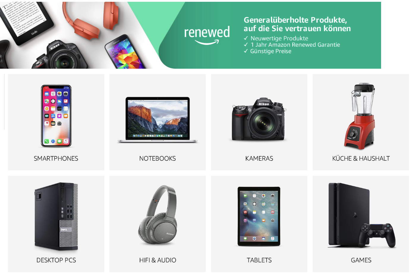 Auch Amazon pflegt mit dem Renewed-Programm einen speziellen Laden für Kundenrückläufer und andere Gebrauchtgeräte, die von qualifizierten Technikern gründlich durchgecheckt und aufbereitet werden. Es gibt neun Kategorien, hauptsächlich Unterhaltungselektronik und Kommunikationsgeräte, aber auch Haushalts- und Schreibwaren. Für alle Artikel gelten die einjährige Amazon-Garantie sowie die üblichen komfortablen Kundenrechte des Online-Riesen.