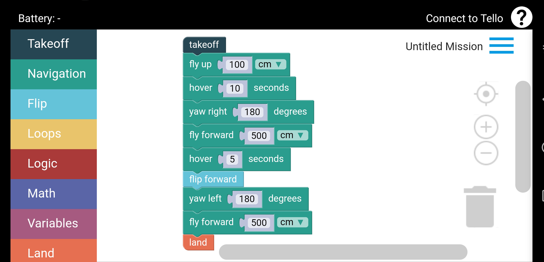 Auf sehr ähnliche Art und Weise funktioniert auch die Programmierung der technisch schon deutlich aufwändigeren Drohne Ryze/DJI Tello (Testbericht) mit der App Droneblocks. Zwar ist die englischsprachige App weniger bunt und kindlich gestaltet, die Vorgehensweise ist aber sehr ähnlich. Einzelne Befehle werden bequem per Fingerzeig aneinandergereiht und mit Werten versehen. Einfache Manöver sind so schnell umgesetzt – bei komplizierteren Aufgaben ist die Programmierung aber durchaus eine spannende Übung. Abgesehen davon, macht auch das normale Fliegen viel Spaß. Ein mögliches Szenario für die kleine Drohne zeigt folgender Screenshot: Die Drohne startet, steigt auf einen Meter Höhe, verweilt zehn Sekunden, dreht um 180 Grad nach rechts und fliege fünf Meter geradeaus. Dann wartet sie fünf Sekunden, macht einen Vorwärts-Salto, dreht um 180 Grad nach links, fliegt fünf Meter und landet wieder.