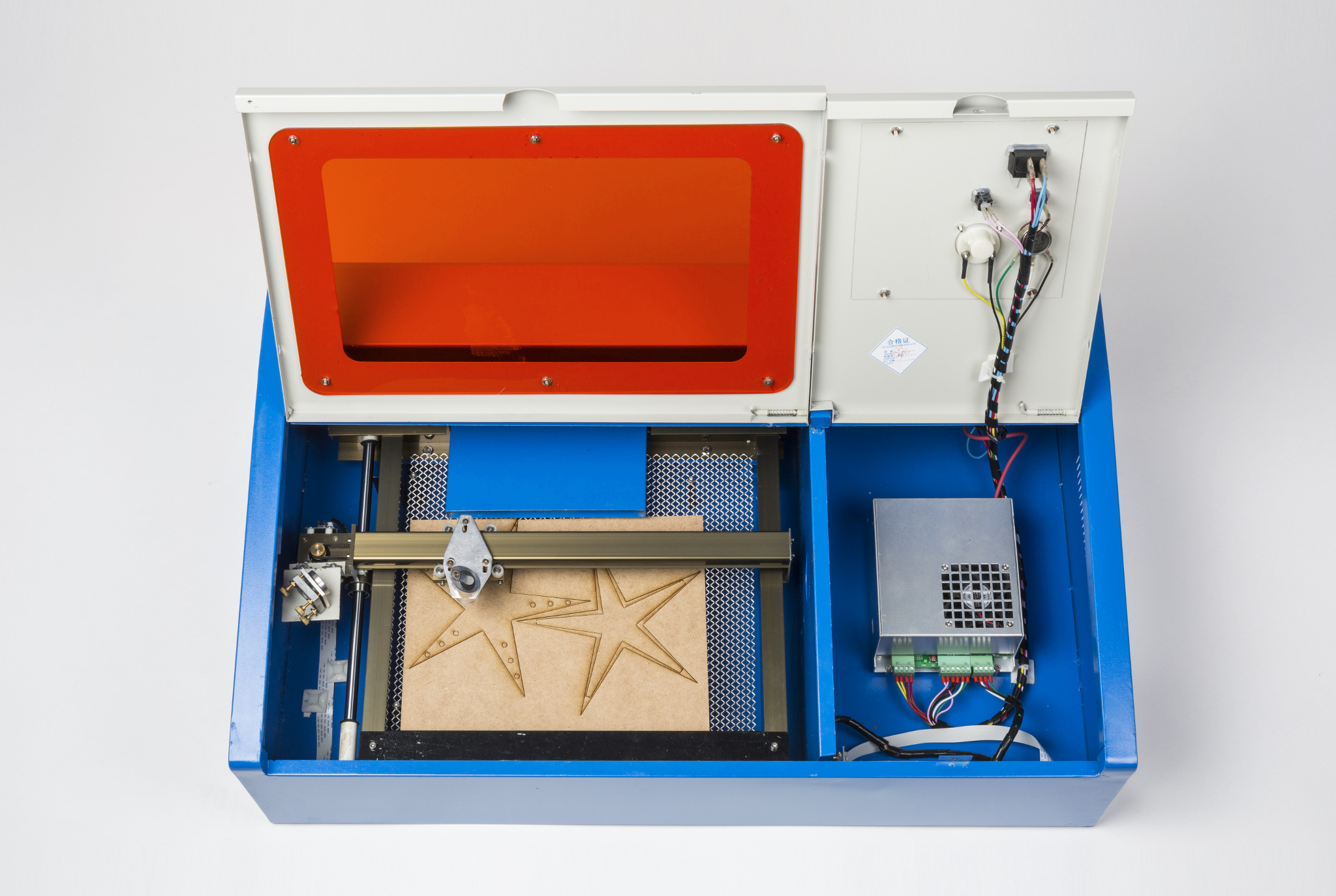 Wer das volle Potenzial eines Lasers ausschöpfen will, muss mehr Geld investieren und sich einen CO2-Laser anschaffen. Diese Geräte haben eine Ausgangsleistung von 30 W und mehr und sind somit in der Lage, 5 mm dickes Holz oder Acrylglas in nur einem Arbeitsgang zu schneiden. Für Gravuren von Metalloberflächen eignen sich die Geräte ebenfalls. Ein solcher Laser mit 40 W Leistung ist der bei Bastlern beliebte K40. Dieses Gerät mit einer maximalen Arbeitsfläche von 300 × 200 mm ist aus europäischen Lagerbeständen ab etwa 340 Euro erhältlich. Stärkere Varianten mit 50 oder 60 W gibt es ab etwa 1000 Euro und CO2-Laser mit 80 W schlagen mit mindestens 1900 Euro zu Buche. Dabei handelt es sich ausnahmslos um günstige No-Name-Geräte. Die für kommerzielle Anwendungen sinnvollen Faser-Laser sind noch teurer und deshalb für Privatanwender weitgehend uninteressant.