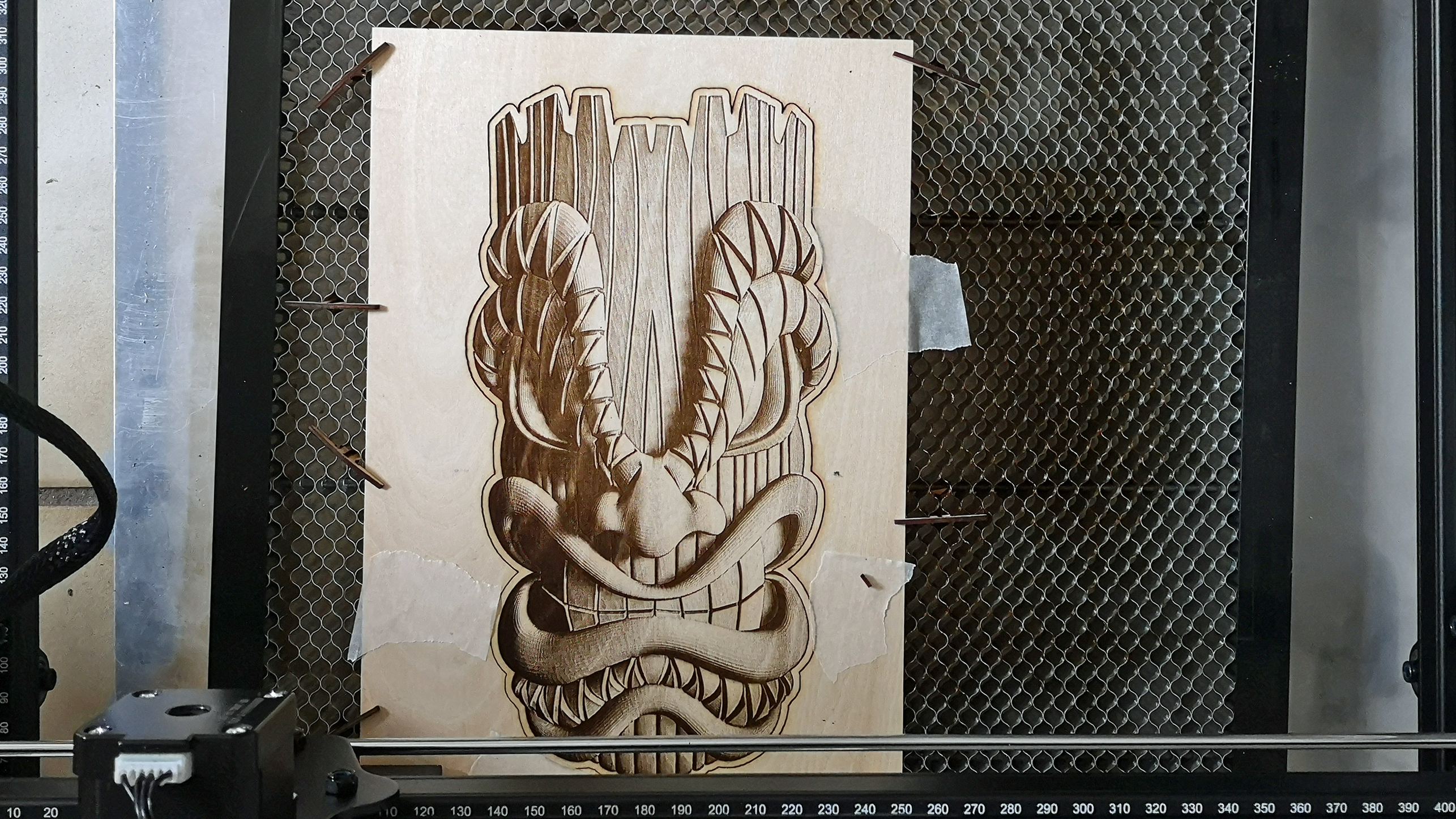 Ein weiterer wichtiger Aspekt für ein geschlossenes Gehäuse ist weniger offensichtlich. Bei der Verbrennung der Oberfläche durch den Laser entsteht Feinstaub, der im schlimmsten Fall in den Körper gelangt. Bei offenen Gehäusen verteilt sich der Feinstaub als Nebelschwaden im Raum und deshalb sollte man immer ausreichend lüften und im Idealfall mit einer Schutzmaske arbeiten. Ein geschlossenes Gehäuse würde eine komfortable Absaugung erlauben und außerdem keine schädlichen Laserstrahlen nach Außen lassen. Wir empfehlen bei häufiger Nutzung dringend die Konstruktion eines geschlossenen Gehäuses und die Anschaffung einer WLAN-Kamera zur Überprüfung des Arbeitsfortschritts.