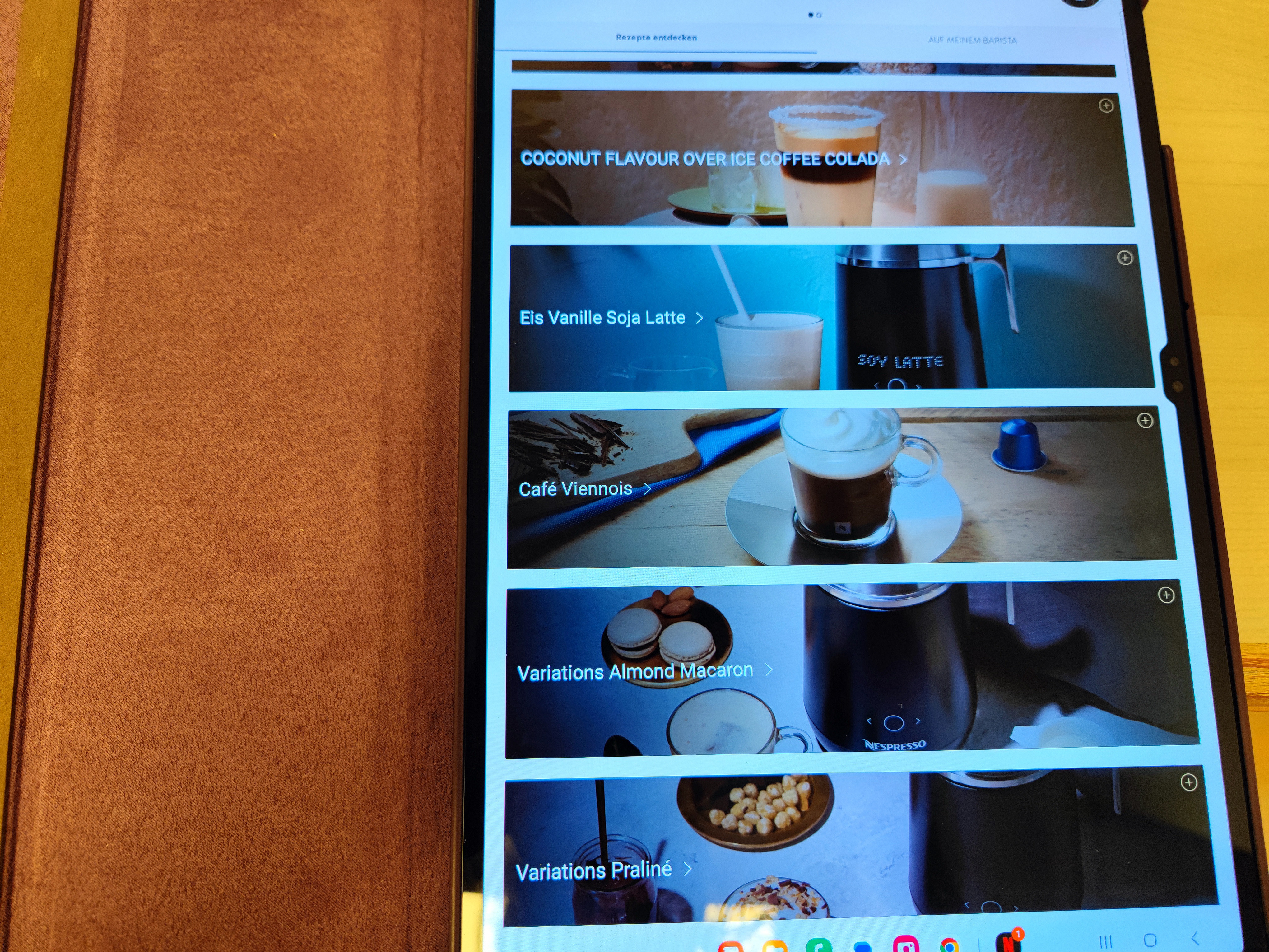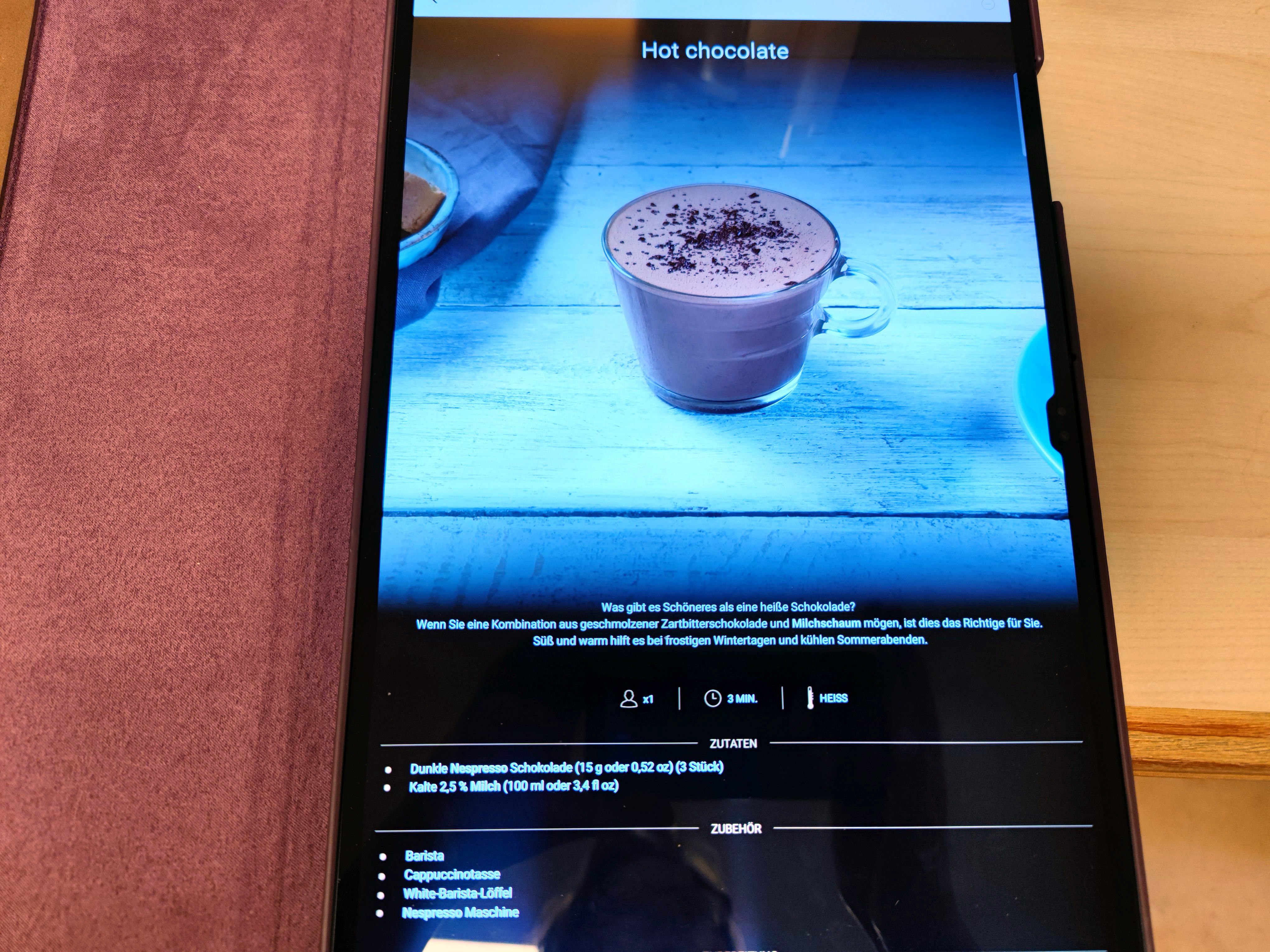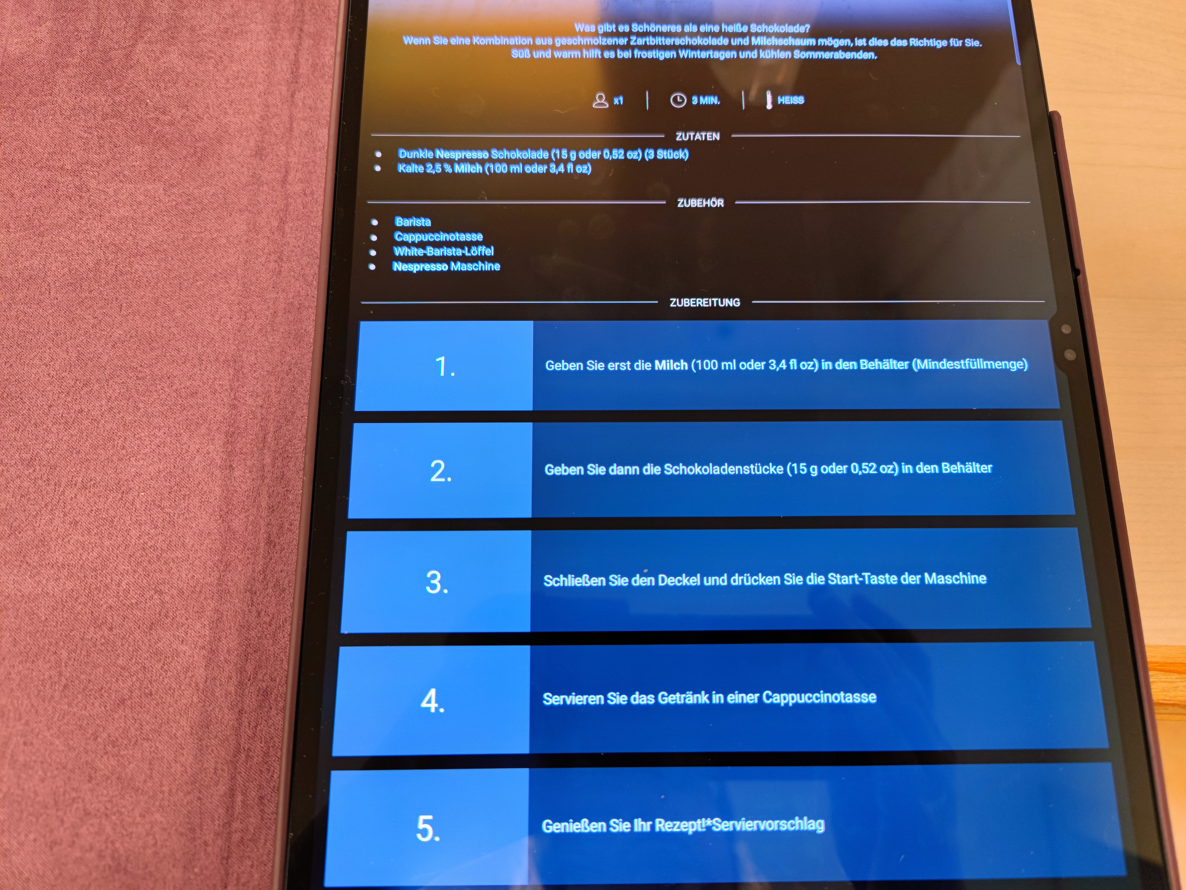 Einzig den Kaffee für die Rezepte kann man damit nicht brühen, der muss jeweils mit einer separaten Kaffeemaschine oder nach Gusto auch per Hand vorbereitet werden. Den Rest erledigt – wie bereits angedeutet – die App. Nach kurzer Anmeldung bei Nespresso verbindet sich das Gerät mit dem Smartphone. Das funktionierte beim Ausprobieren allerdings nicht ganz problemlos. Mit einem Xiaomi Mi 11 Ultra (Testbericht) wollte das nicht klappen, mit einem Samsung Galaxy Tab S8 Ultra (Testbericht) war das hingegen kein Problem. Zur Not geht es auch ohne App, denn im Auslieferzustand sind bereits 13 Rezepte vorinstalliert. In der App können sich Nutzer allerdings weitere 30 Rezepte anzeigen und immer 13 davon auf den Barista übertragen. Schlecht umgesetzt – gerade im Hinblick auf den hohen Preis: Möchte man ein neues Rezept überspielen, ist es nötig, erst ein vorinstalliertes zu löschen, denn es gibt nur 13 Rezept-Speicherplätze. Für die jeweiligen Rezepte ist es möglich, Schokolade, Kaffee, Eiswürfel, Sirup, Honig oder auch Zucker direkt in den Zubereitungsbehälter zu geben. Die App sagt genau, wann und wie viel davon zugeführt werden soll.