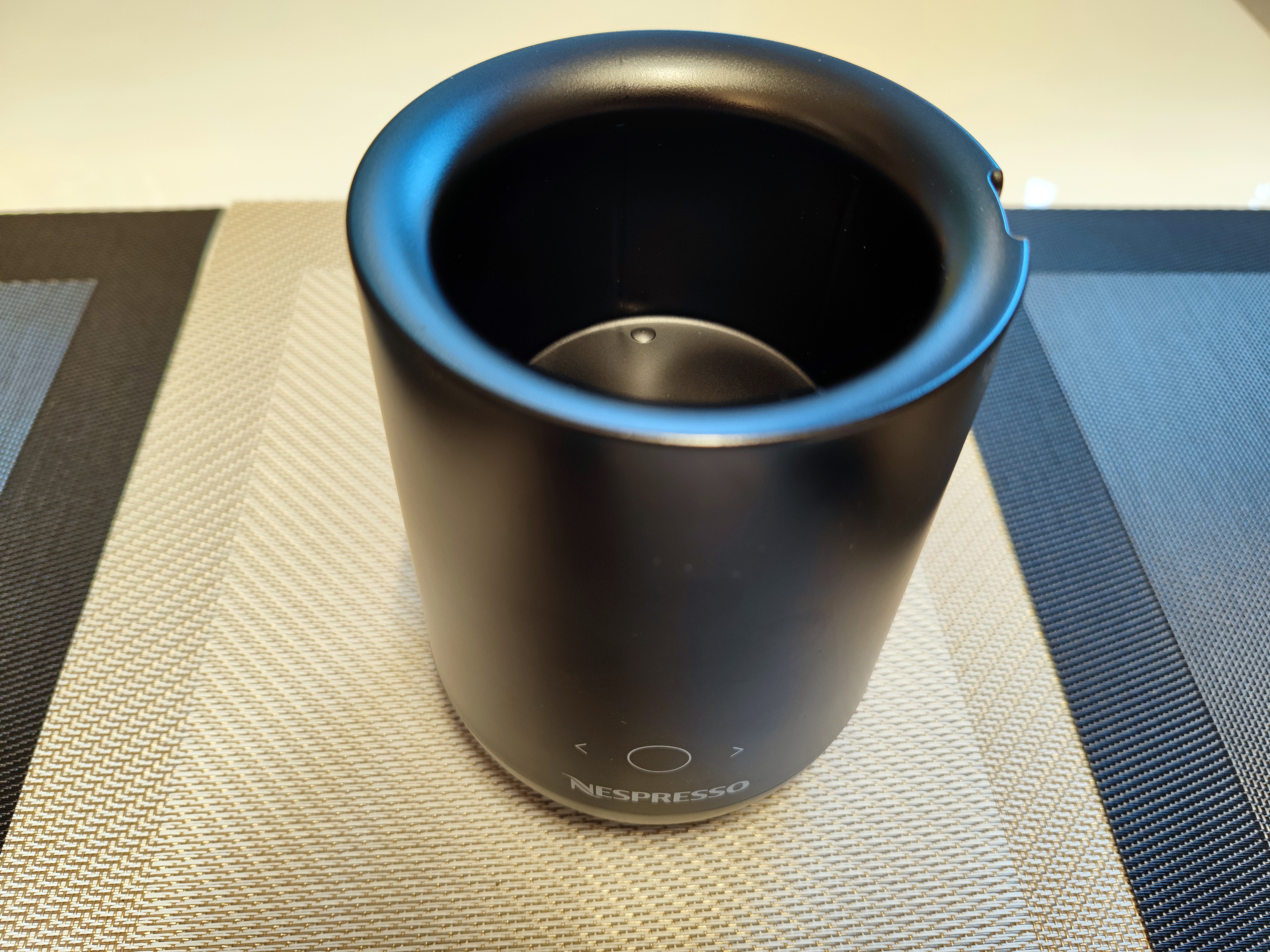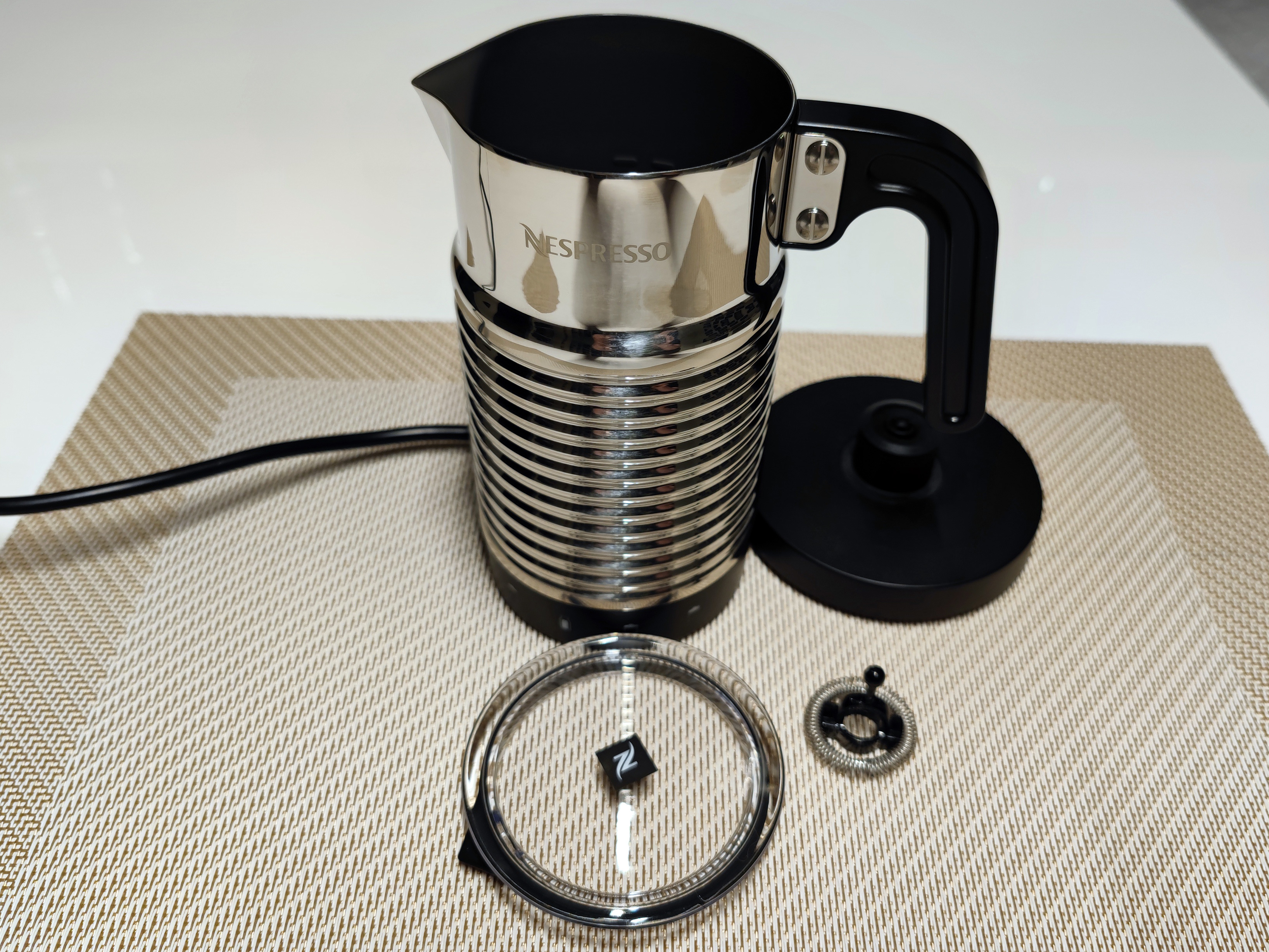 Der Quirl des Nespresso Barista ist anders aufgebaut als bei üblichen Milchaufschäumern. Er besteht aus einem Stab mit drei Einfüllmarkierungen, an dessen unterem Ende sich ein gewellter Teller befindet. Ein zweiter gewellter Teller befindet sich knapp darüber. Dieser bewegt sich beim Aufschäumen auf und ab. Der Quirl selbst ist magnetisch in der Milchkanne befestigt, solange sich das Gerät im Basissockel befindet. Zum Ausgießen der fertigen Rezeptur muss man die Milchkanne vom Sockel entfernen und darauf achten, entweder vorher den Quirl zu entfernen oder ihn mit einem Finger festhalten, da er jetzt nicht mehr von allein in der Kanne hält. Die anschließende Reinigung ist wie beim Aeroccino 4 sehr einfach, alle Teile bis auf die Basis sind auch bei diesem Gerät spülmaschinenfest bis 70° Celsius. Den Nespresso Barista gibt es nur direkt beim Hersteller zu kaufen.