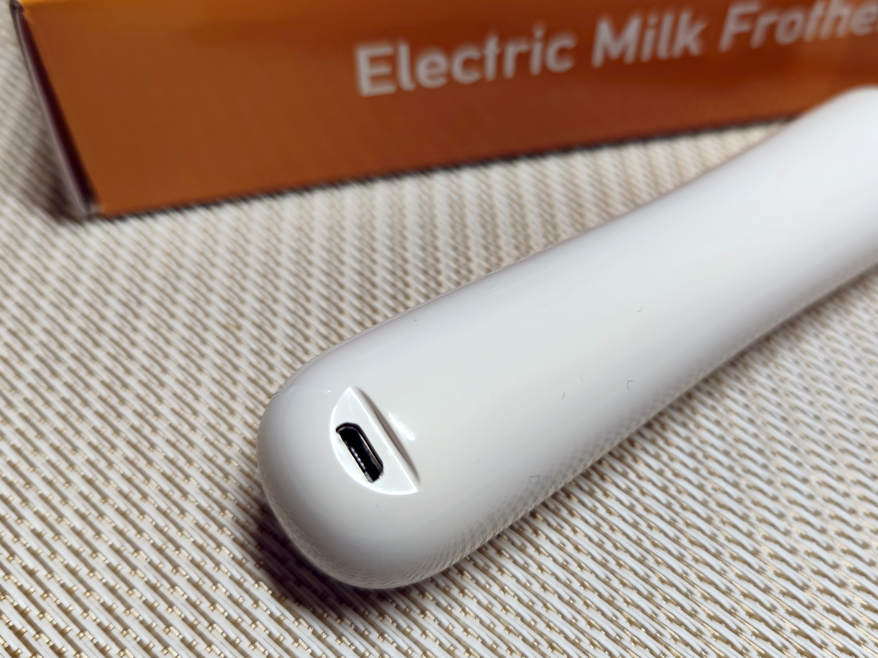 Die meisten Stab Milchaufschäumer funktionieren mit Batterien, etwas teurere Modelle mit Akkus. Auch das Aufladen per USB-Anschluss ist immer häufiger zu finden – fast wie beim Handy. Wir haben für diesen Ratgeber den rund 15 Euro teuren CAVN-Stabschäumer bei Amazon bestellt, den es im Internet in ähnlicher Form und Preisgestaltung unter etlichen Bezeichnungen gibt. Das Design des CAVN ist wenig aufregend und erscheint nicht übermäßig hochwertig, sondern zweckmäßig. Im weißen Plastikgriff sind eine einzelne Taste und eine darunter liegende, sehr einfachen Anzeige eingebaut. Am oberen Ende der Rückseite befindet sich ein Mikro-USB-Anschluss, über den das Gerät aufgeladen wird. Der Akku hält erstaunlich lange, auch bei ausgiebiger Nutzung war Aufladen erst nach zwei Wochen nötig. Das passt: Der Hersteller verspricht bei vollgeladenem Akku eine Dauer-Nutzungszeit von einer Stunde auf der höchsten und 1,5 Stunden auf niedriger und mittlerer Stufe. Da man für eine Anwendung nicht mehr als ein oder zwei Minuten braucht, hält eine Ladung dementsprechend lange.
