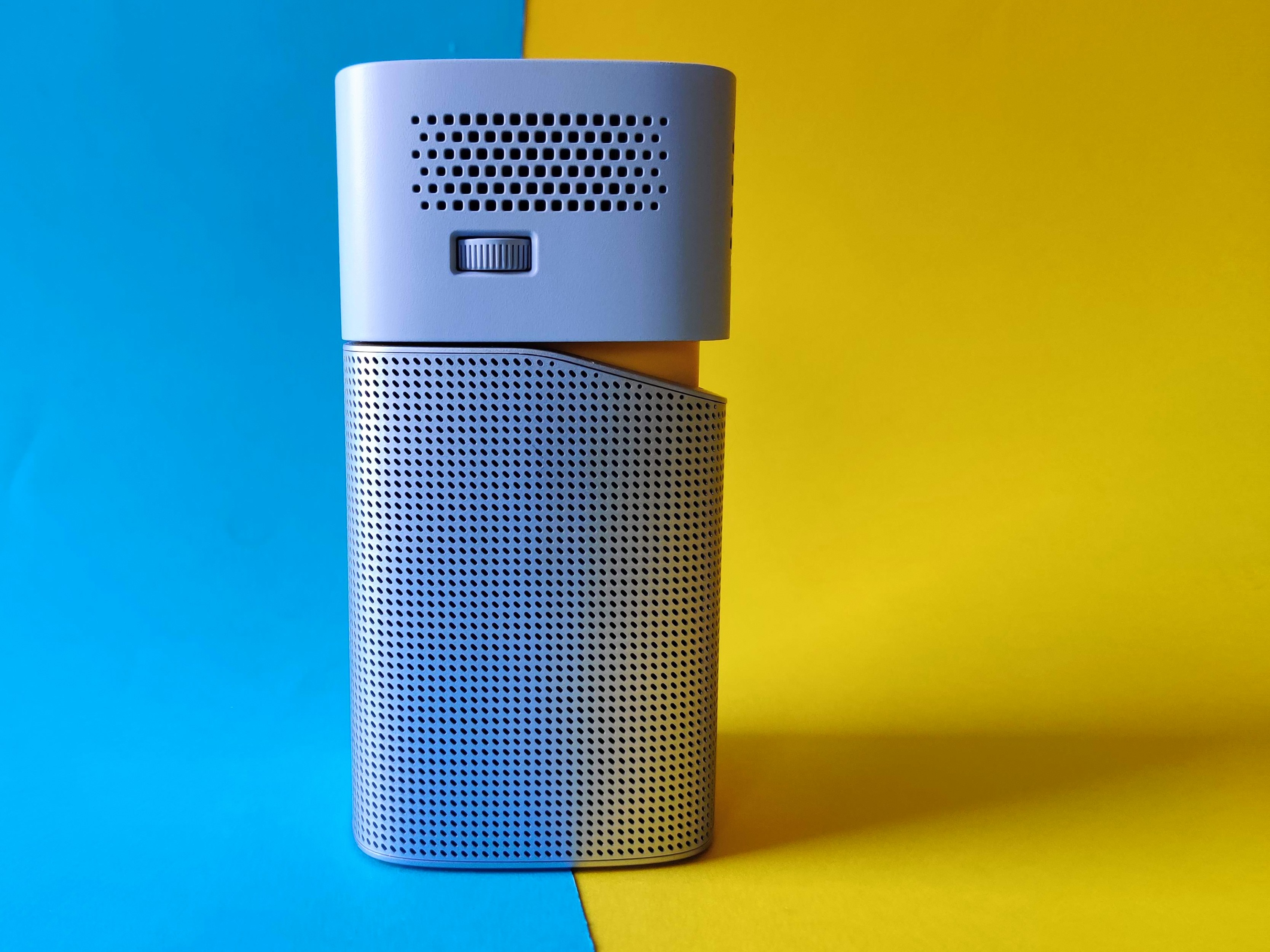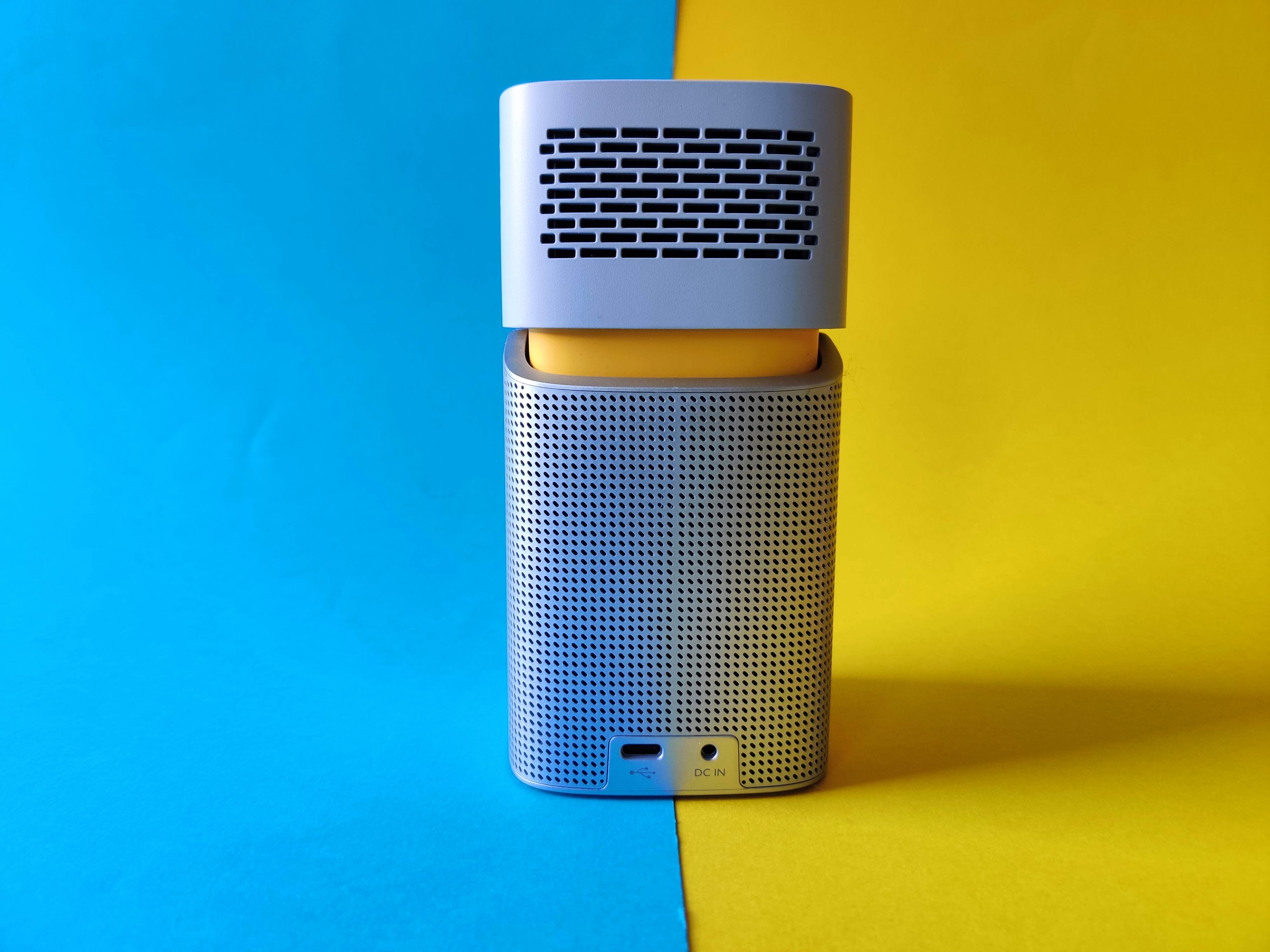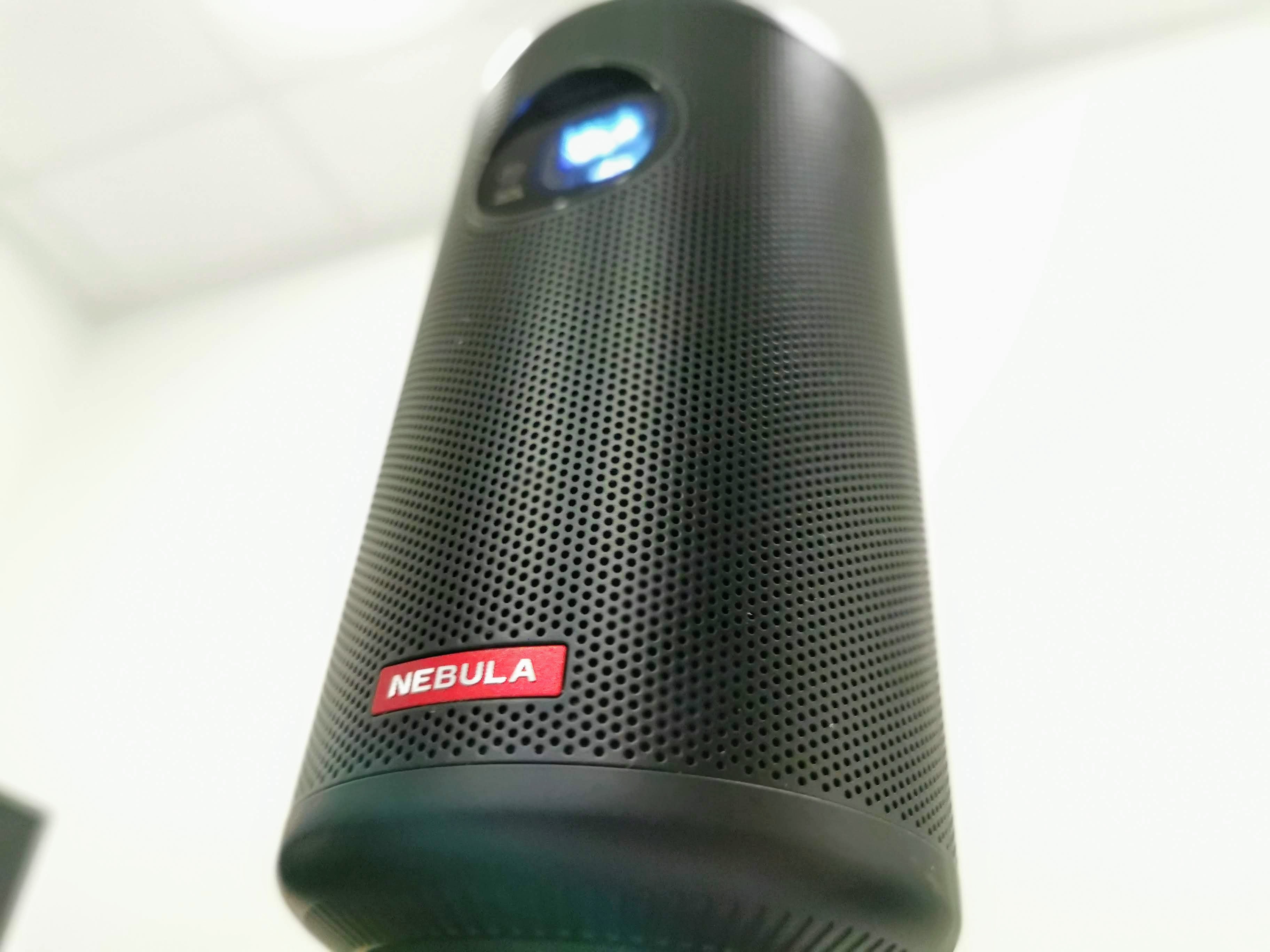 Der Nebula Capsule Max ist der König unter den mobilen Beamern mit Akku. Das hat jedoch auch seinen Preis. Er kostet regulär 500 Euro, ist aktuell für etwa 400 erhältlich. Optisch erinnert seine Form an eine zu dicke 500-ml-Cola-Dose, die komplett von schwarzem Mesh-Gitter ummantelt ist. Auf der Rückseite befindet sich der Ein-/Austaster und die Bluetooth-Taste. Wie der Benq GV1 kann man den Capsule Max als Bluetooth-Box nutzen. Der Klang ist fantastisch und kann mit vielen Bluetooth-Boxen, die sonst um die 100 Euro kosten, mithalten.