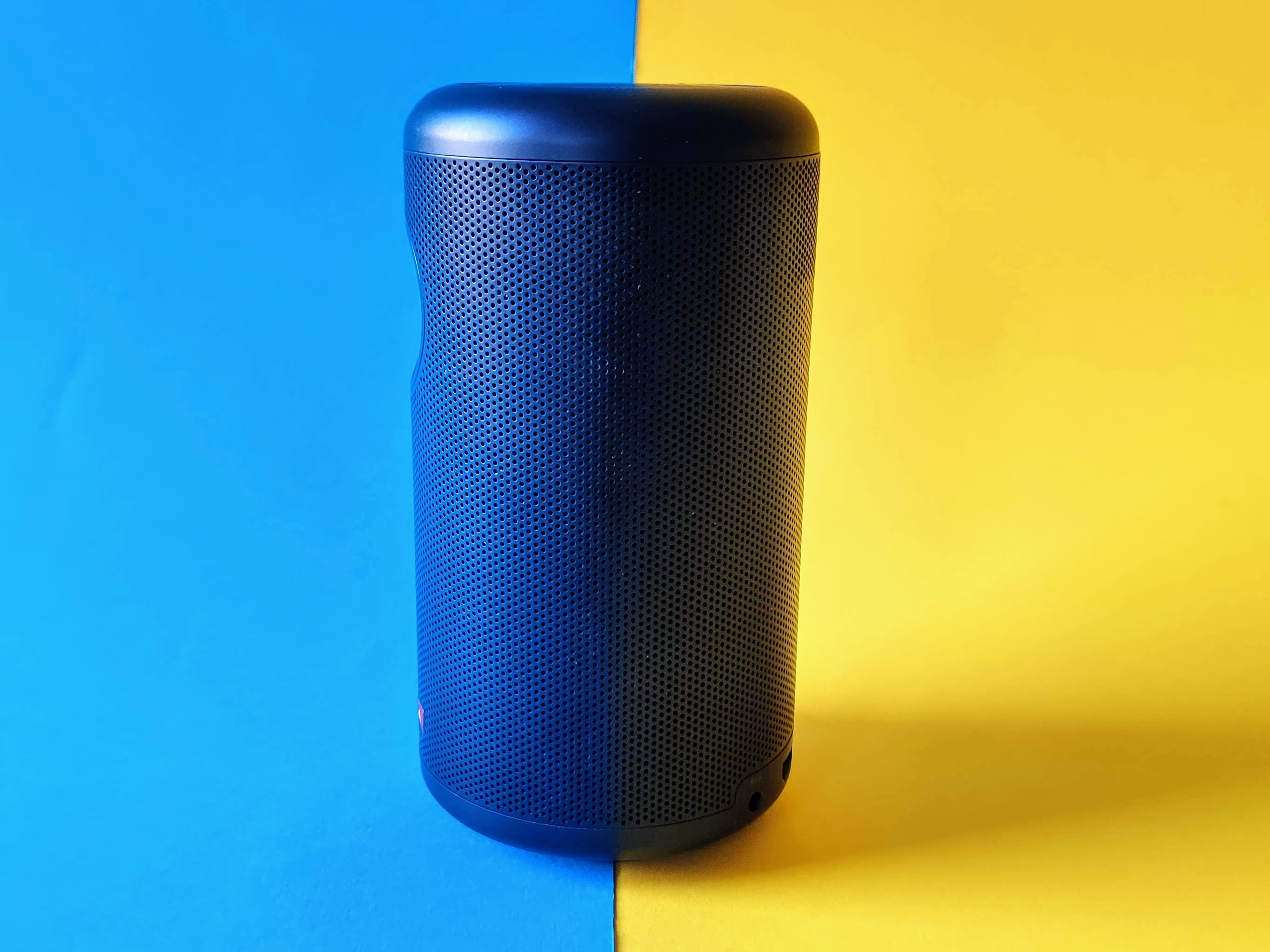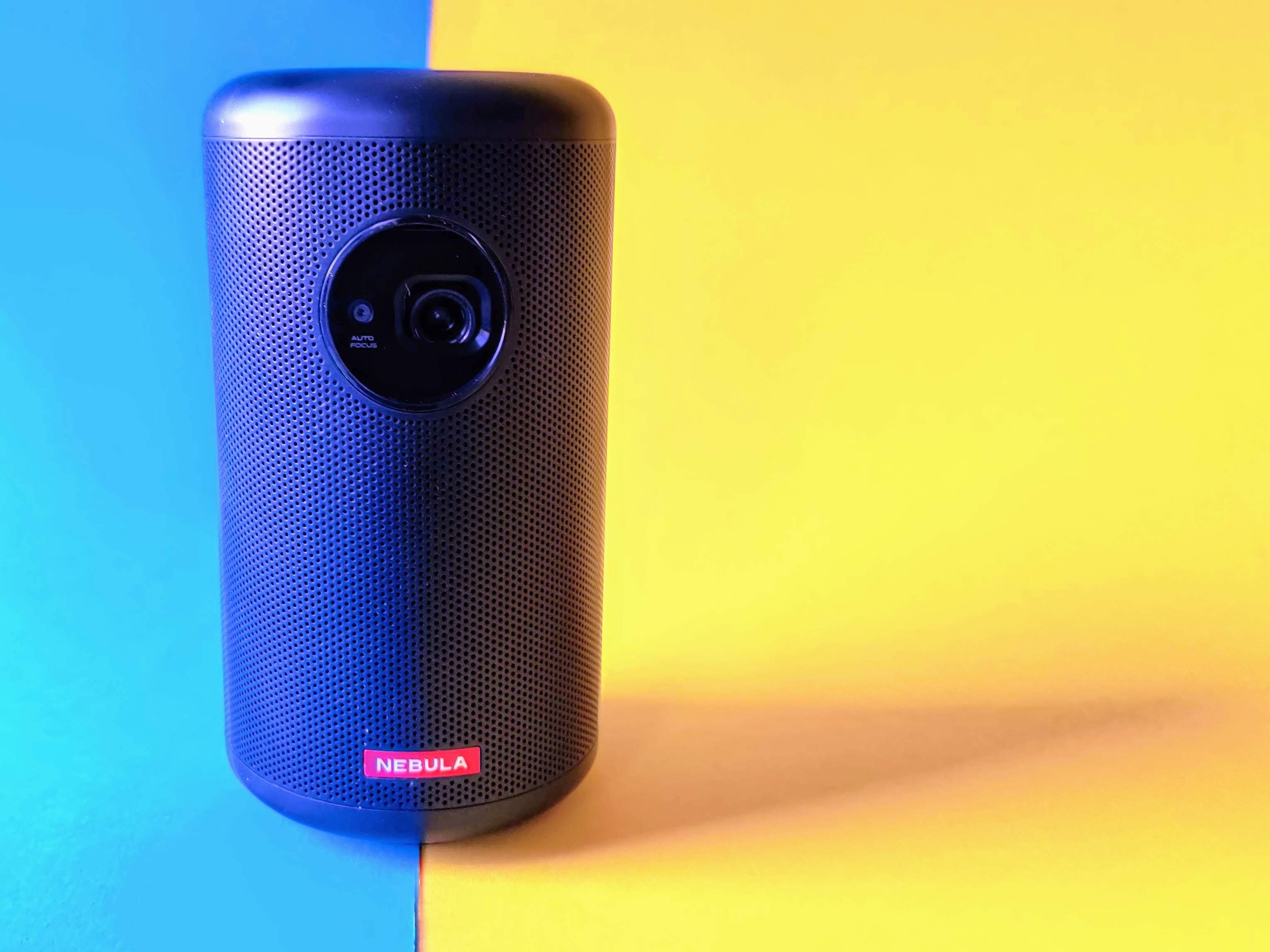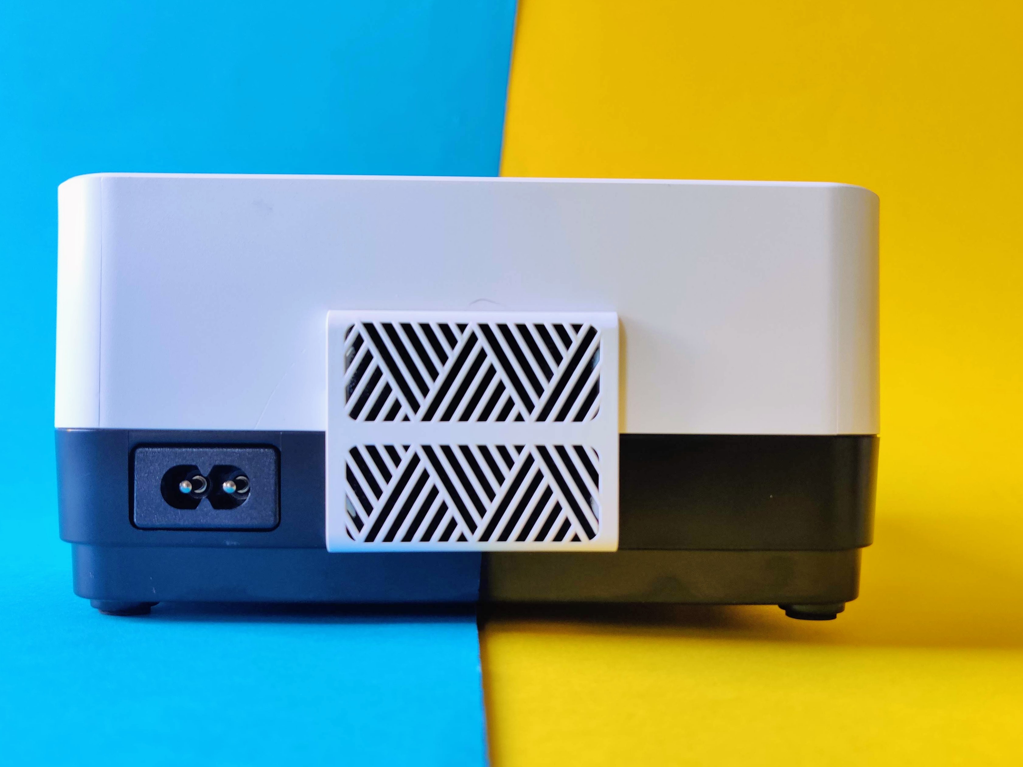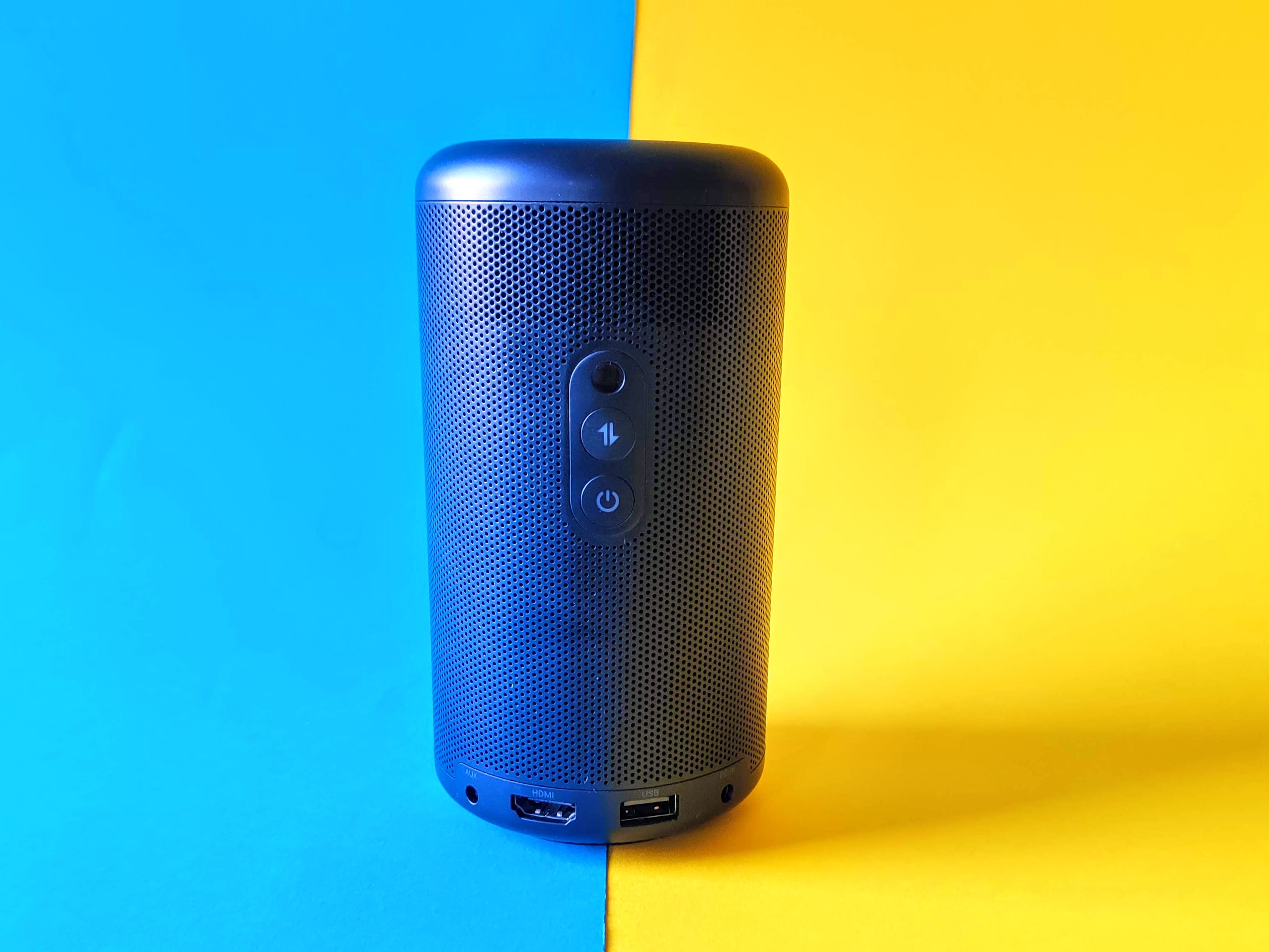 Der Nebula Capsule Max ist der König unter den mobilen Beamern mit Akku. Das hat jedoch auch seinen Preis. Er kostet regulär 500 Euro, ist aktuell für etwa 400 erhältlich. Optisch erinnert seine Form an eine zu dicke 500-ml-Cola-Dose, die komplett von schwarzem Mesh-Gitter ummantelt ist. Auf der Rückseite befindet sich der Ein-/Austaster und die Bluetooth-Taste. Wie der Benq GV1 kann man den Capsule Max als Bluetooth-Box nutzen. Der Klang ist fantastisch und kann mit vielen Bluetooth-Boxen, die sonst um die 100 Euro kosten, mithalten.