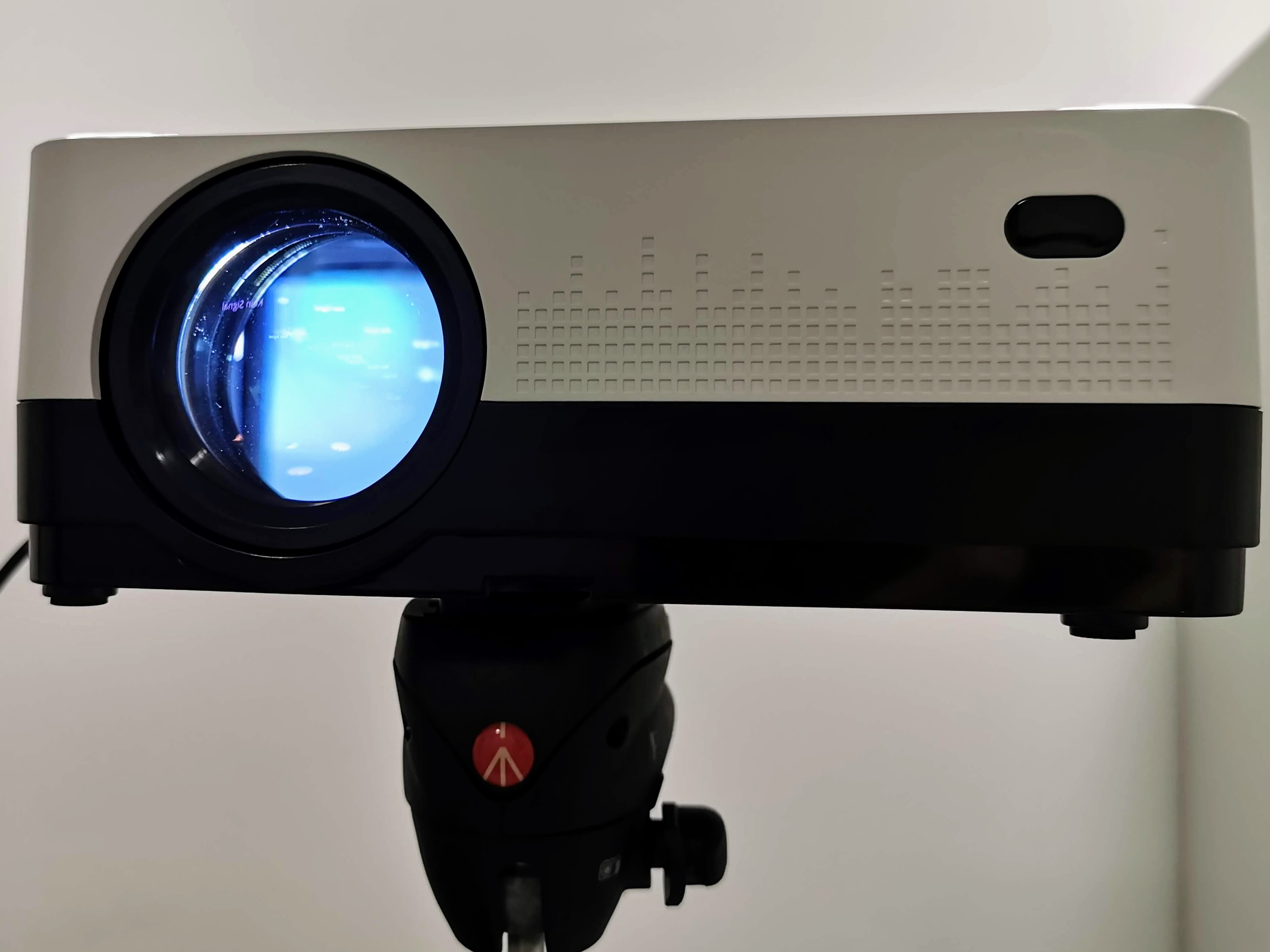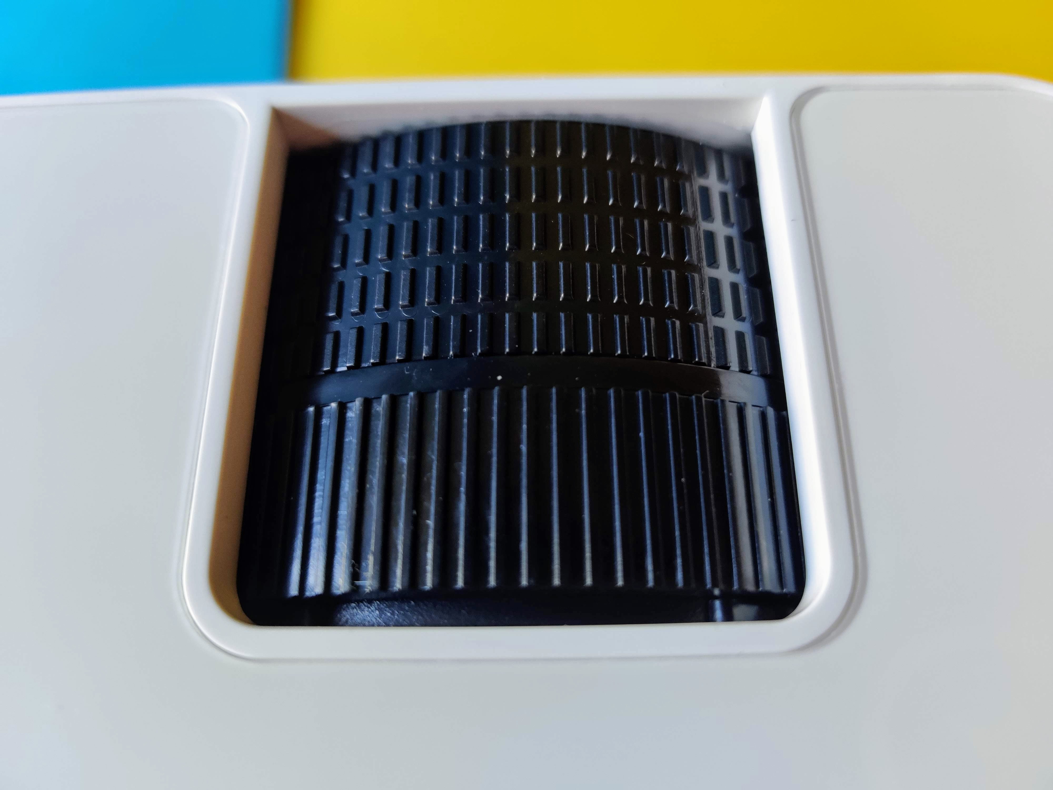 Die Bildqualität des 854×480-Beamers ist gut, die maximale Helligkeit hoch und die Helligkeitsverteilung gleichmäßig. Ein Problem haben wir mit dem zu klein geratenen Fokusrad an der Seite des Kopfes. Es ist nicht nur zu feinfühlig, sondern hat auch noch Spiel. Fokussieren wird so zur Geduldsprobe. Auch hätte die Auflösung gerne etwas höher sein dürfen, Untertitel sehen trotz perfektem Fokus stets etwas verwaschen aus. Der Lüfter des Beamers stört nicht.