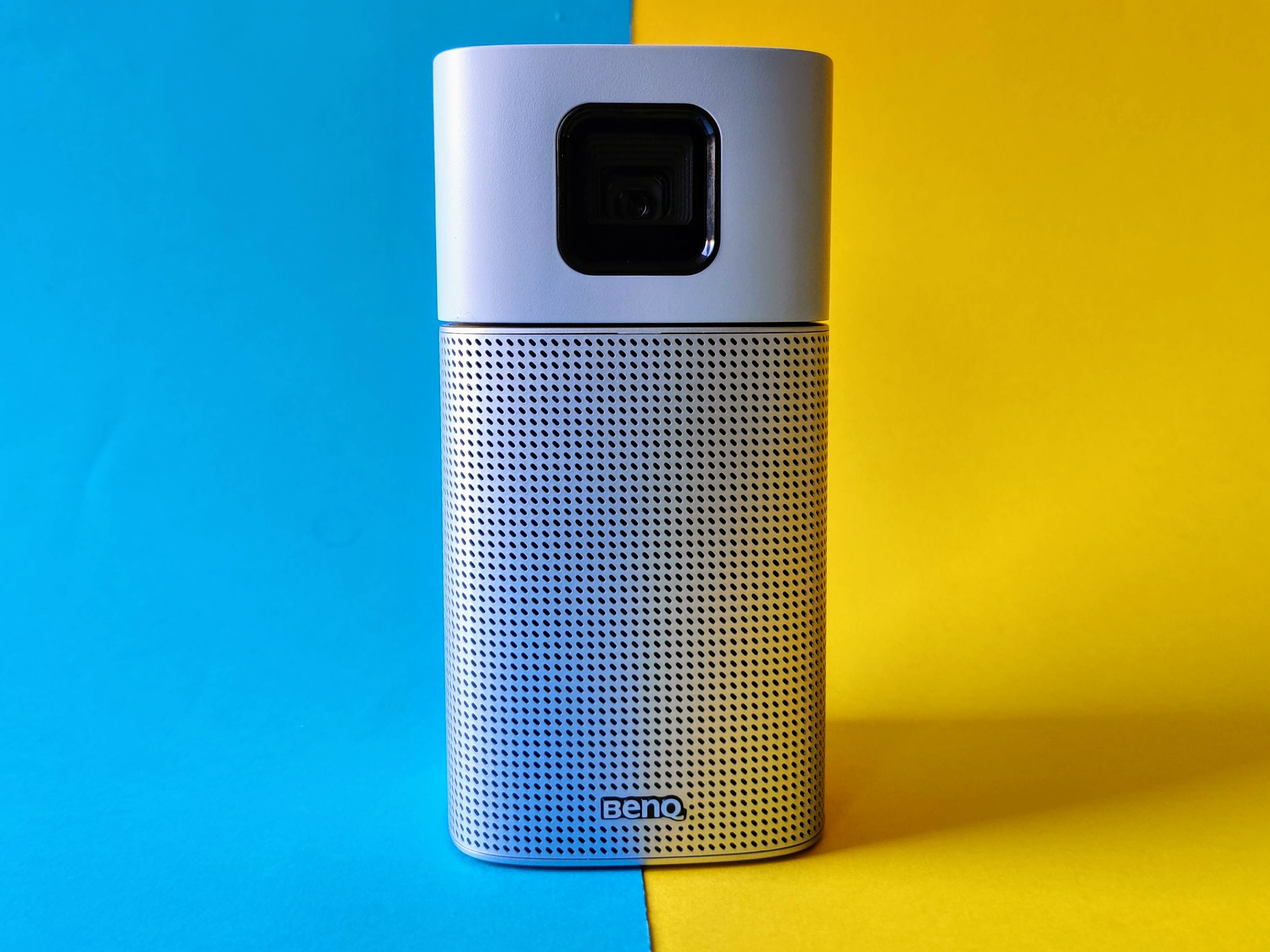 Der Benq macht bezüglich Verarbeitung und Optik alles richtig. Er besteht zu großen Teilen aus Metall, dadurch fühlt er sich schwer und wertig an. Optisch auffällig ist sein Kopf, in dessen Mitte die Linse wie das Auge eines Zyklopen sitzt. Diesen Kopf kann man bis etwa 20 Grad neigen, um das Projektionsbild in der Höhe zu justieren. Geneigt zeigt der Benq GV1 seinen gelben Hals.