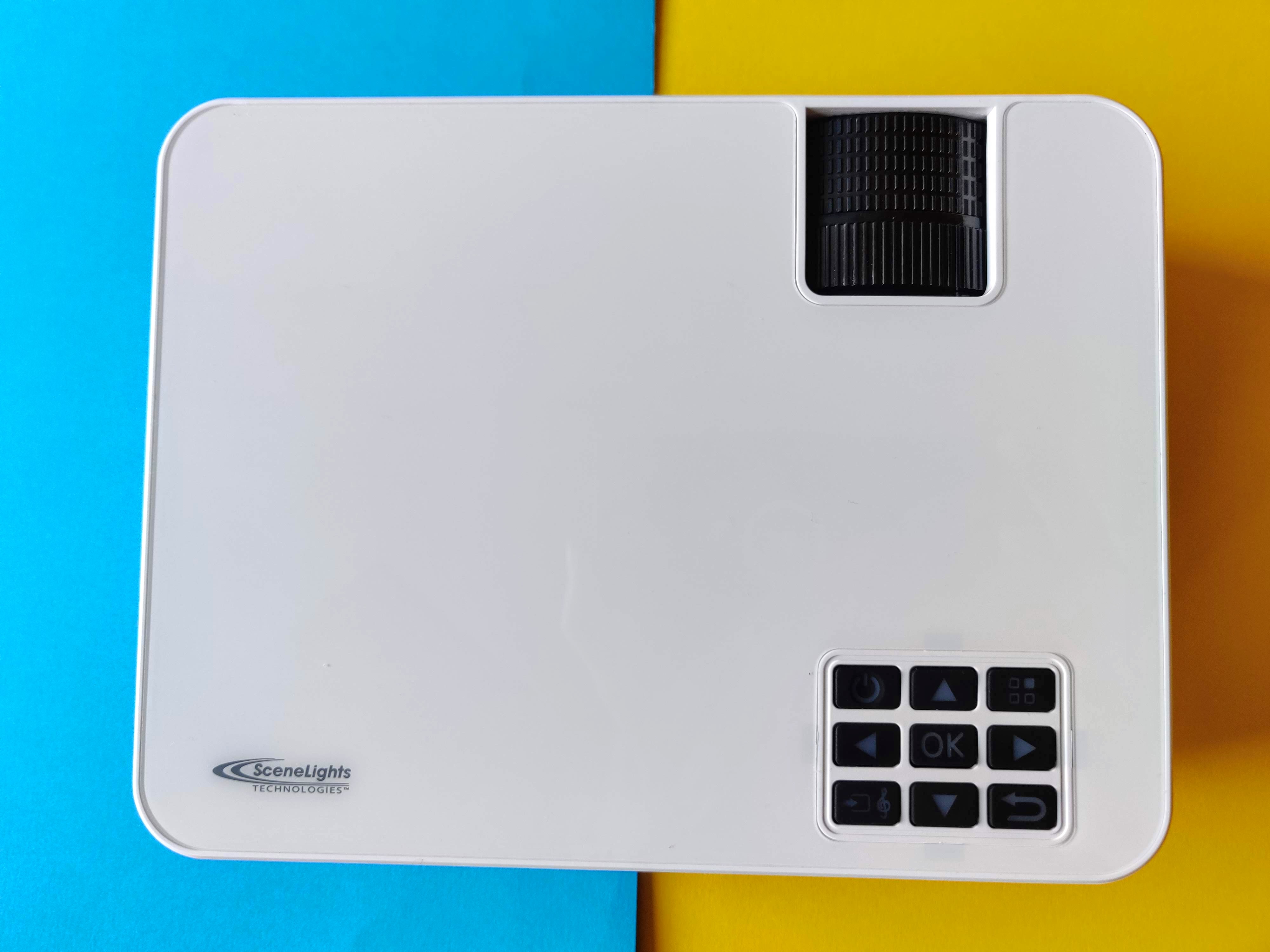 An Schnittstellen bietet der Scenelights LB-8300 HDMI-Eingang, zweimal USB, AV-Eingang, Slot für Micro-SD-Karte, 3,5-mm-Klinkenstecker und IR-Empfänger. Der Lüfter surrt recht hochfrequent vor sich hin, hält sich aber bezüglich seines Nervfaktors vornehm zurück. Eine Eigenheit des Beamers betrifft seine Fernbedienung. Diese funktioniert ausreichend gut und bietet 22 einzelne Knöpfe - so weit, so gewöhnlich. Aus der Reihe fällt ihre Optik: Sie wirkt wie ein Relikt aus den 80ern.