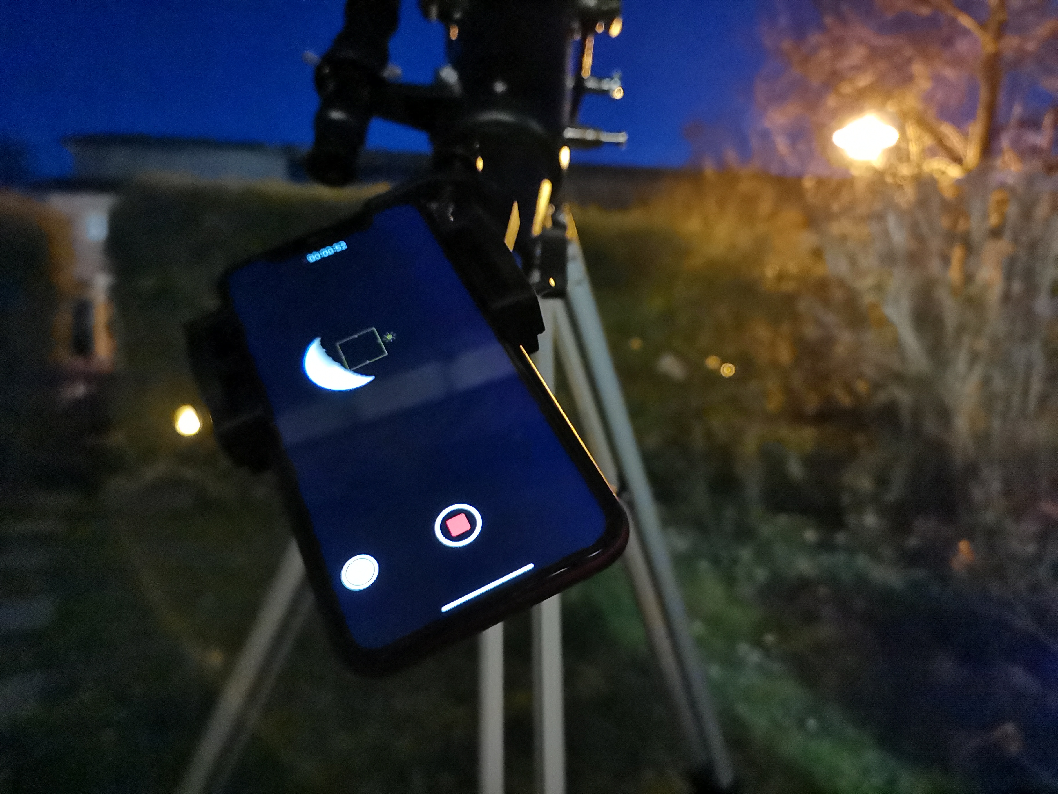 Wer noch detaillierte Mondfotos will, aber keine teure Kamera hat, muss sich mit einem Teleskop behelfen. Für den Hobby-Mondfotografen reicht unserer Erfahrung nach bereits eine simple Smartphone-Halterung und ein Einsteigerteleskop für rund 100 Euro. Hier bekommen selbst ein iPhone XR oder gar massiv in die Jahre gekommenes iPhone 6 (Markteinführung 2014!) den Mond einigermaßen scharf – ganz ohne Pro-Modus. Wir empfehlen allerdings Smartphones, die mindestens einen zweifachen optischen Zoom besitzen. Dadurch wird der Mond auf dem Bild von der Größe eines Cent-Stücks etwa so groß wie eine 2-Euro-Münze.