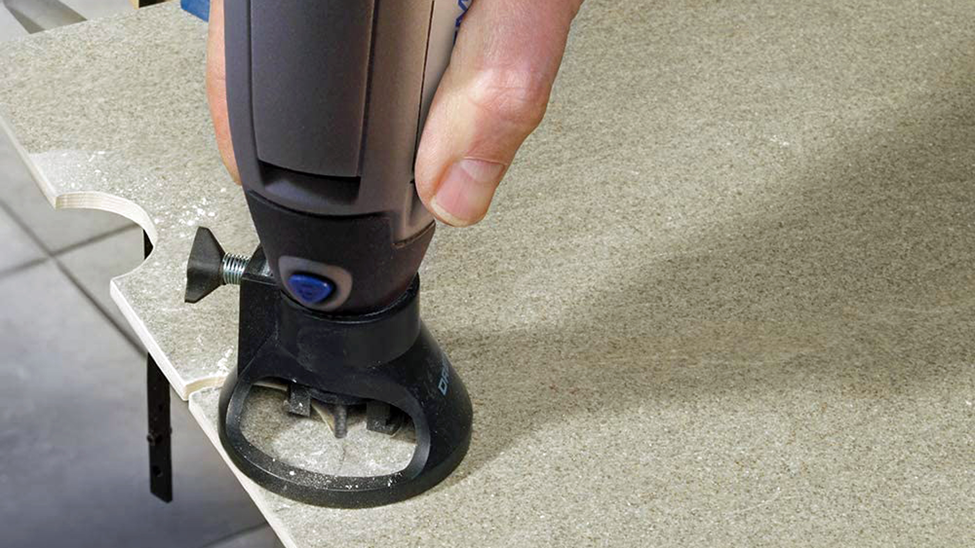 Zum Schneiden dünner Holzbretter oder Kunststoffplatten bietet sich der Kreissägenvorsatz an. Der Aufsatz mit dem 31,8-mm-Sägeblatt erlaubt Schnitte von einer Tiefe von maximal 6,35 mm. Wer dickere Materialien schneiden möchte, sollte einen Blick auf den Ratgeber Diese Sägen gehören in jede Hobby-Werkstatt werfen.