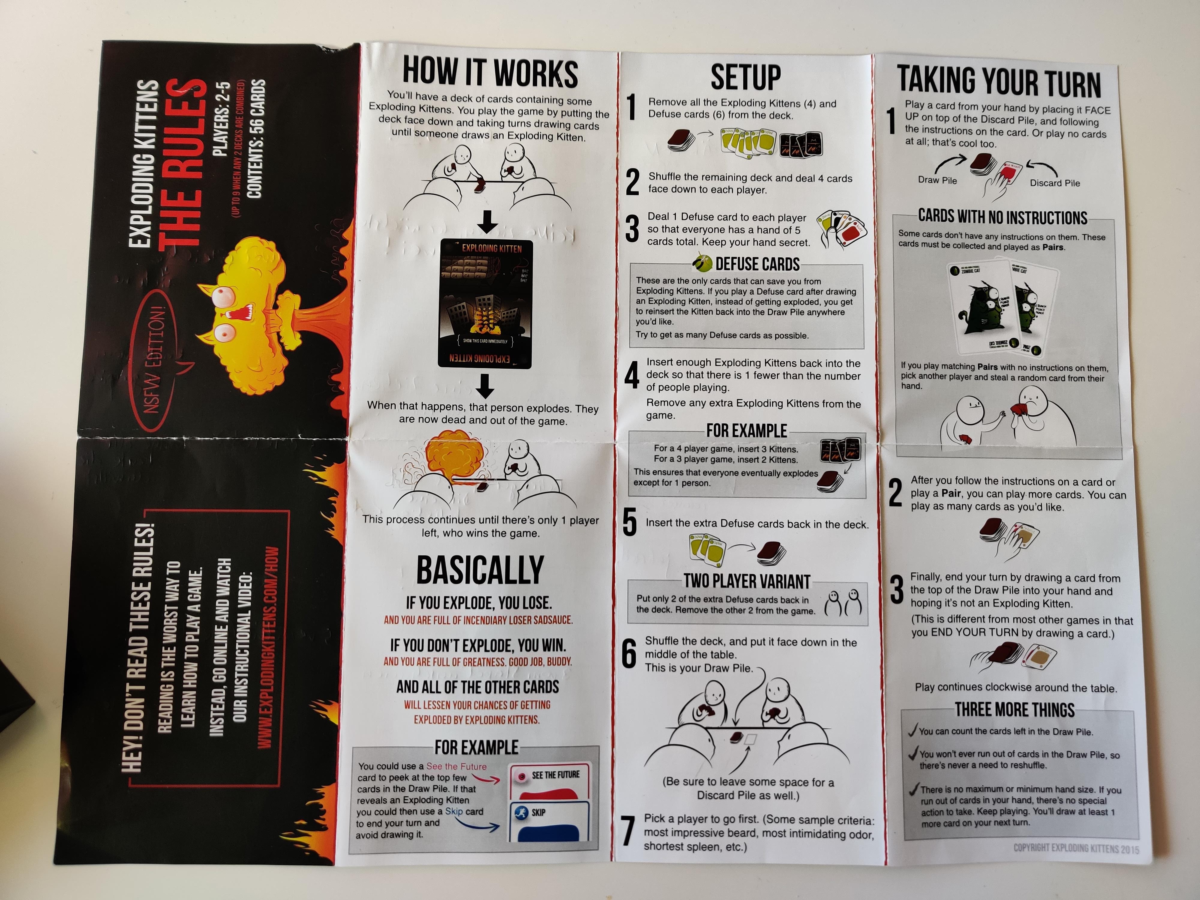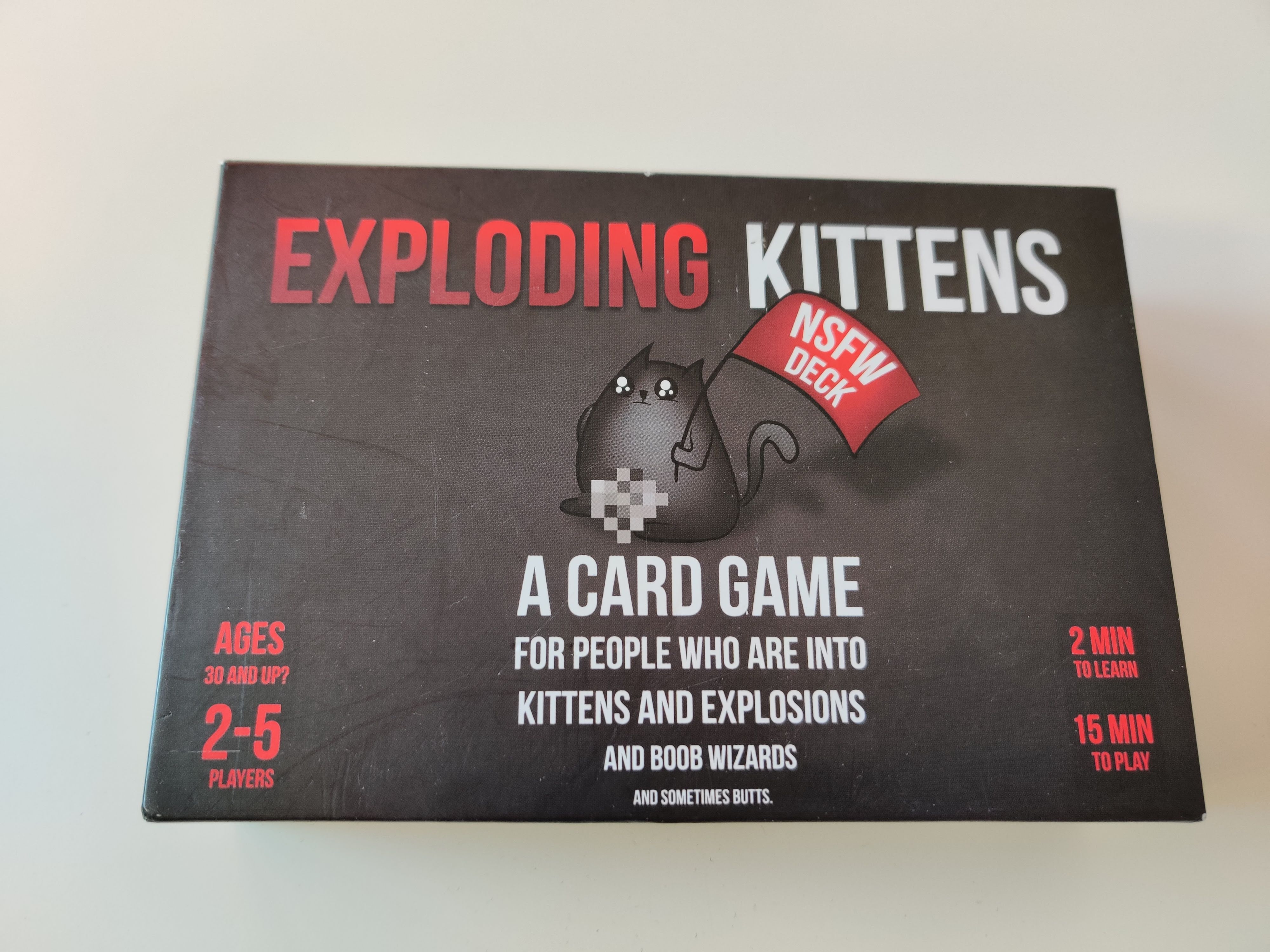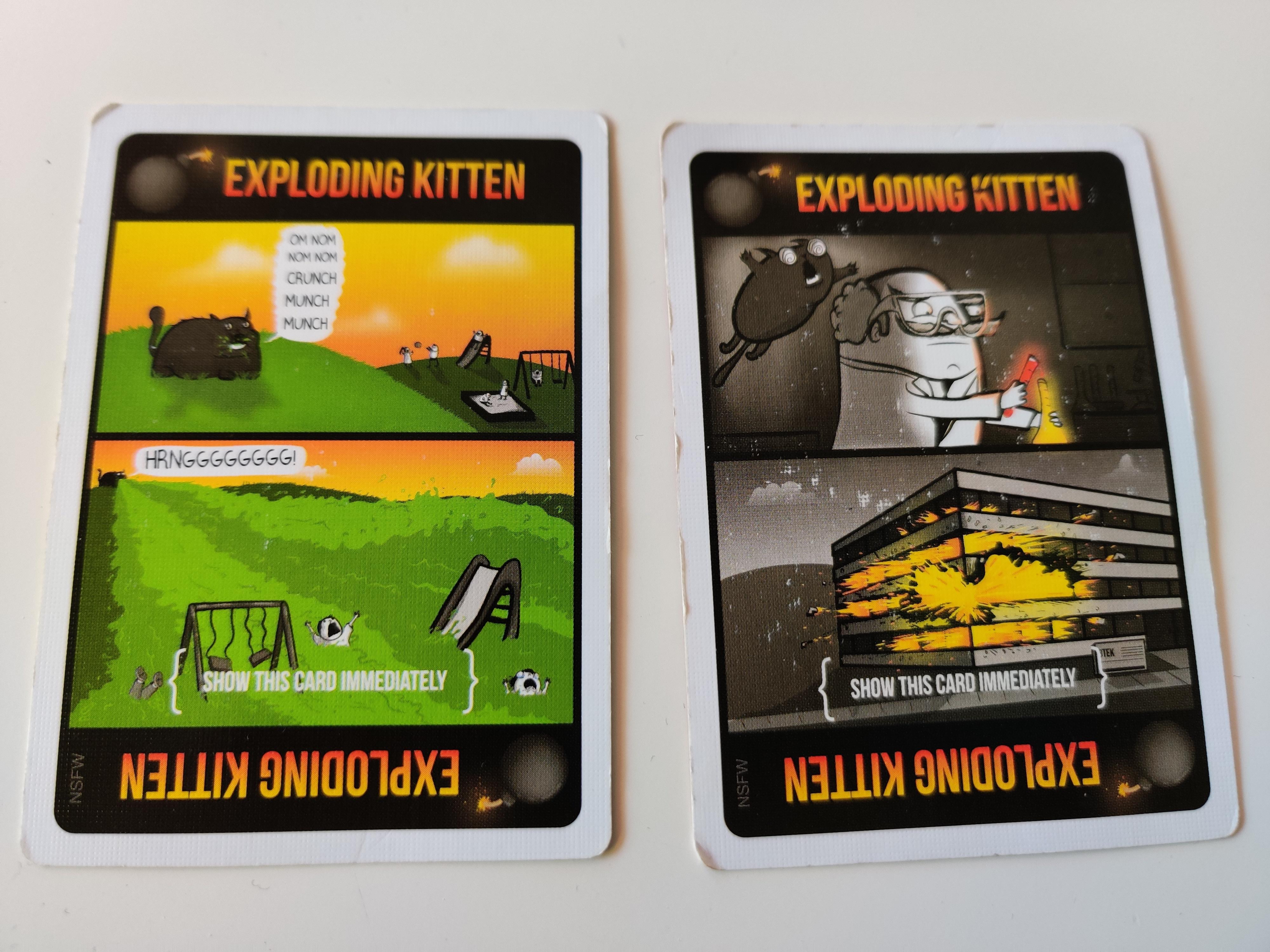 Wir spielen Exploding Kittens in Erwachsenenrunde seit Jahren in der NSFW-Variante. Mit Kindern ab sieben Jahren sollte man eher die normale Version wählen. Ihre Spielmechanik unterscheidet sich kaum, ist aber kinderfreundlicher. Insgesamt macht das Kartenspiel einen frischen und unverbrauchten Eindruck. Sogar zu zweit kommt hier richtig Laune auf. Der meist treffende und zuweilen etwas derbe Humor der Zeichnungen sucht seinesgleichen. Die Erweiterungssets Streaking Kittens und Imploding Kittens bieten neue Aktionskarten und damit mehr strategische Möglichkeiten.